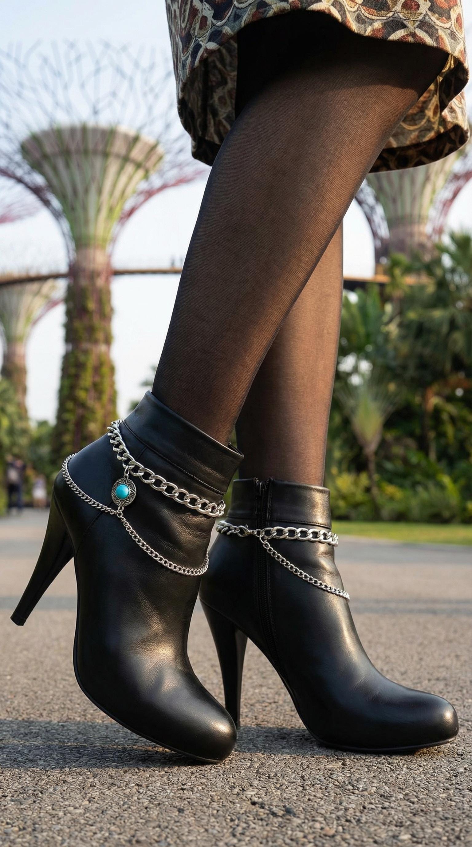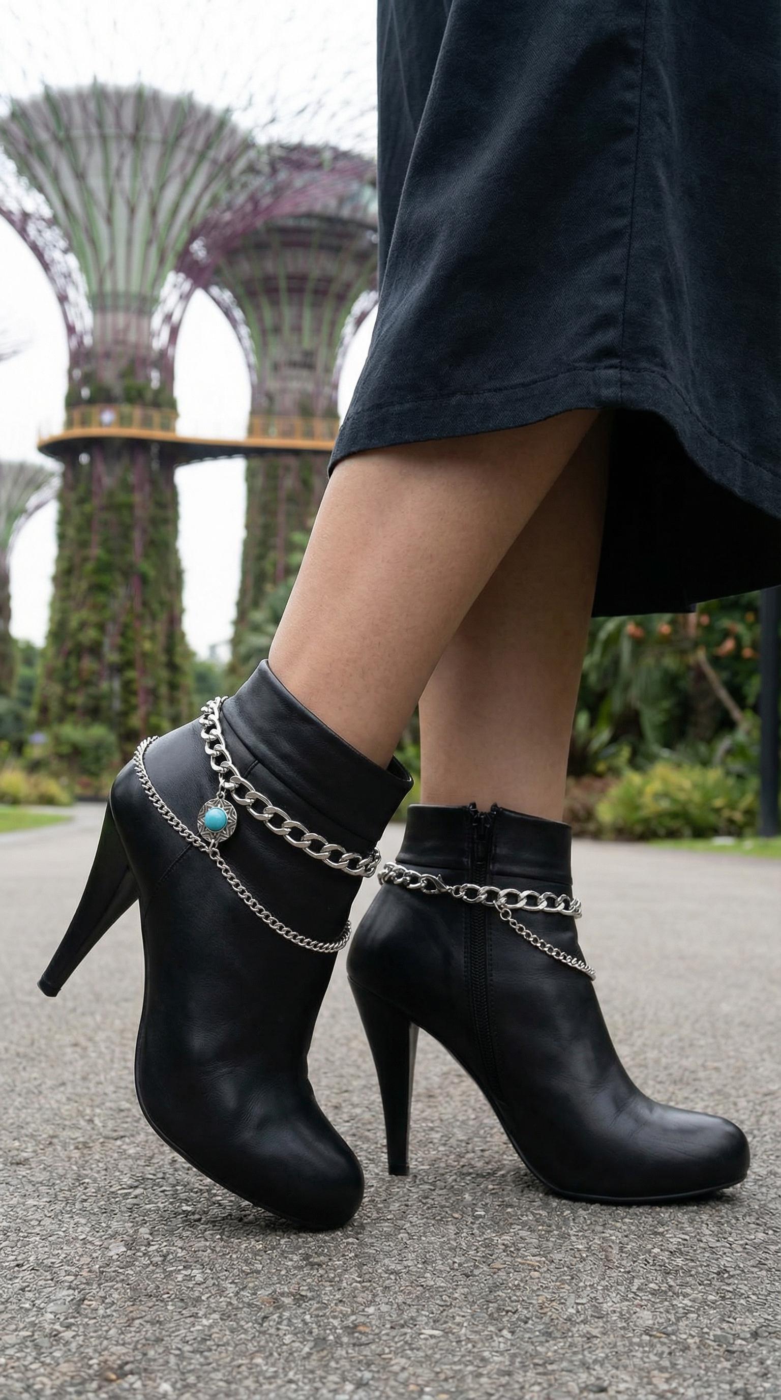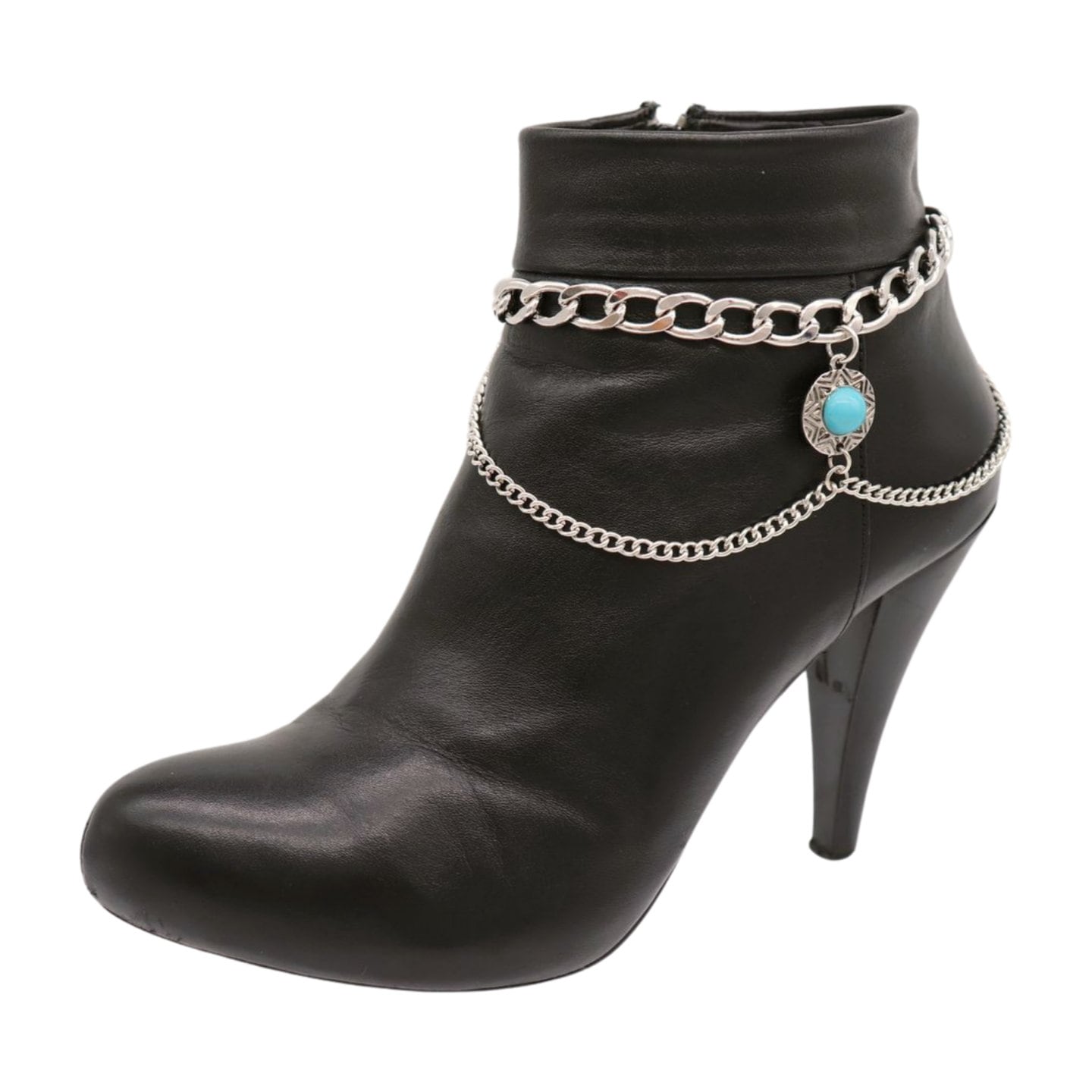 Style is in the details. This handmade pair of boot chain anklets adds an editorial finish with layered silver-tone chains and a turquoise coin charm that brings contrast and movement. Sold as a pair so both boots look balanced. Adjustable length lets you style with a gentle drape for comfort and a natural hang—perfect for photos, events, and standout outfits.