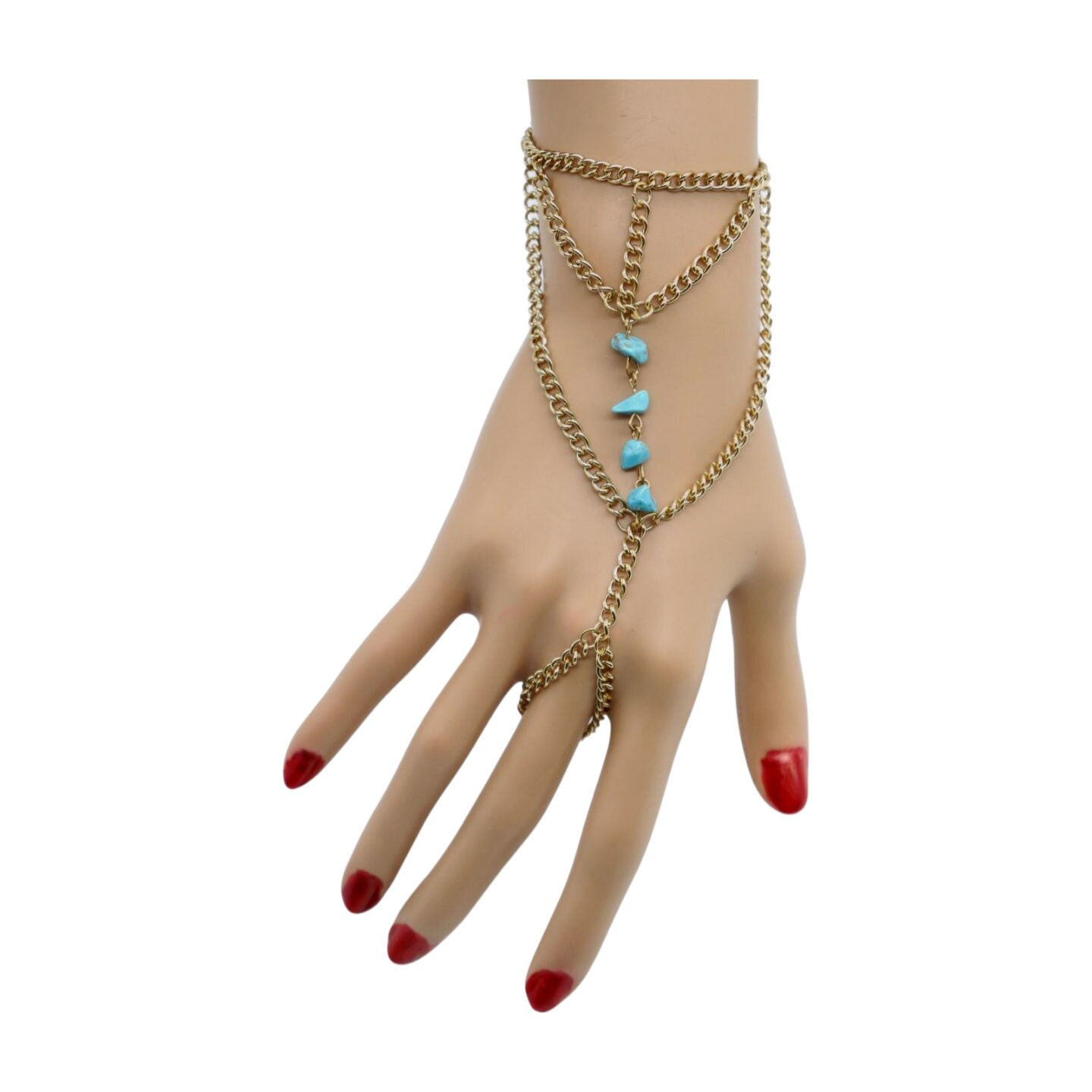 Indulge in the allure of our Women Southwestern Stylish Fashion Wrist Bracelet, a captivating hand chain ring connected accessory that epitomizes Western fashion and ethnic Southwestern style. This exclusive jewelry piece boasts gold metal chain links adorned with mesmerizing turquoise blue beads, evoking a sense of rustic charm that resonates with the latest trends in bohemian chic and Western retro revival.