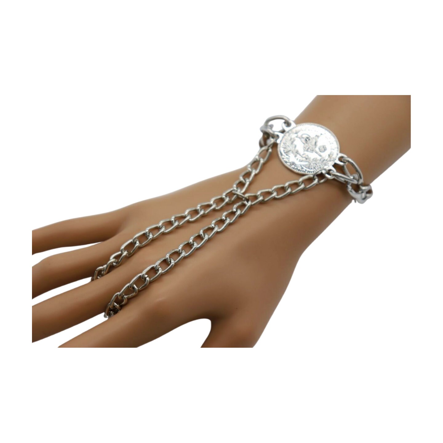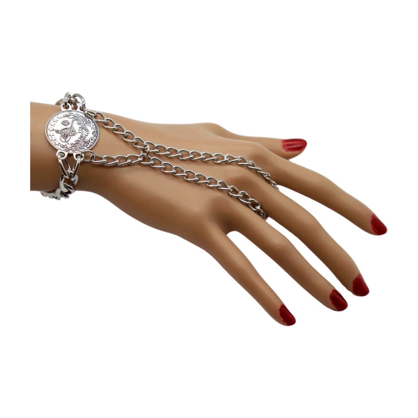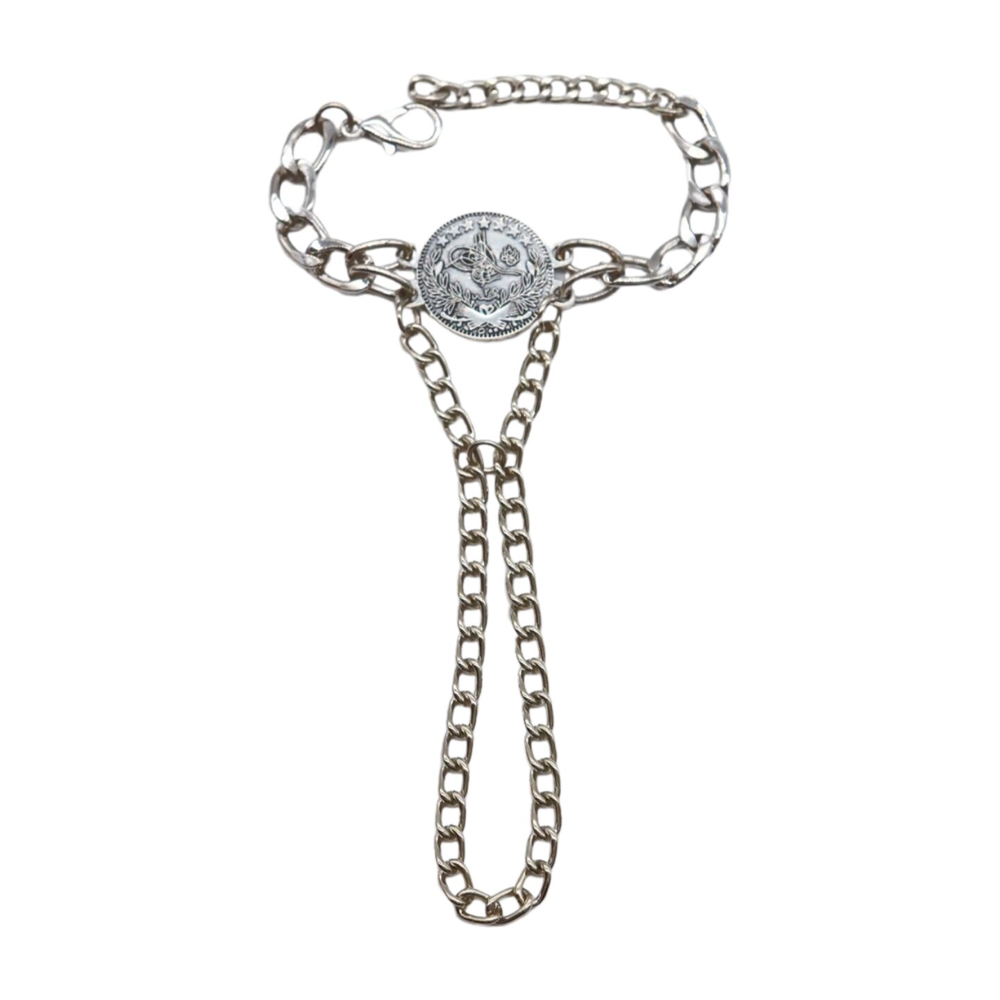 Boho Silver Coin Bracelet with Ring, Ethnic Hand Chain (Adjustable)