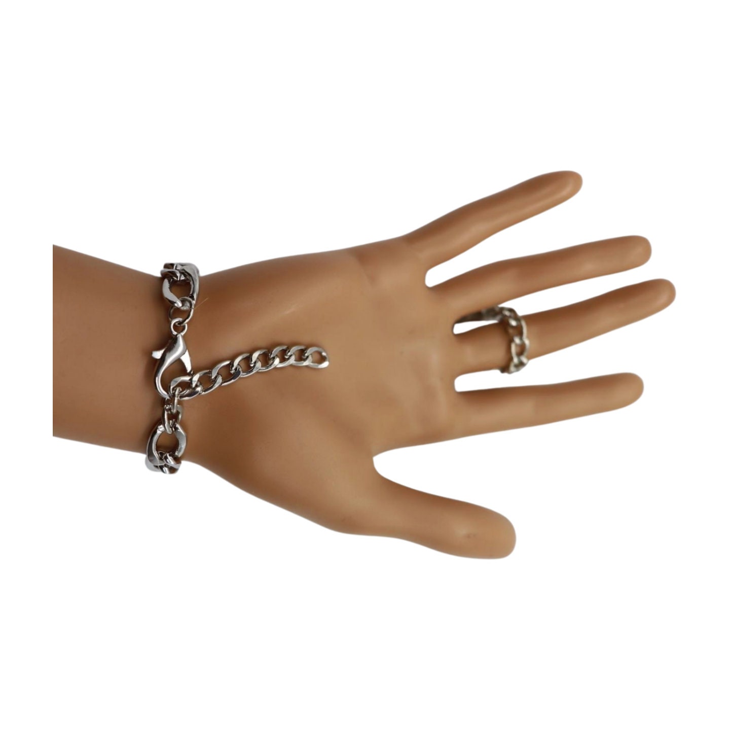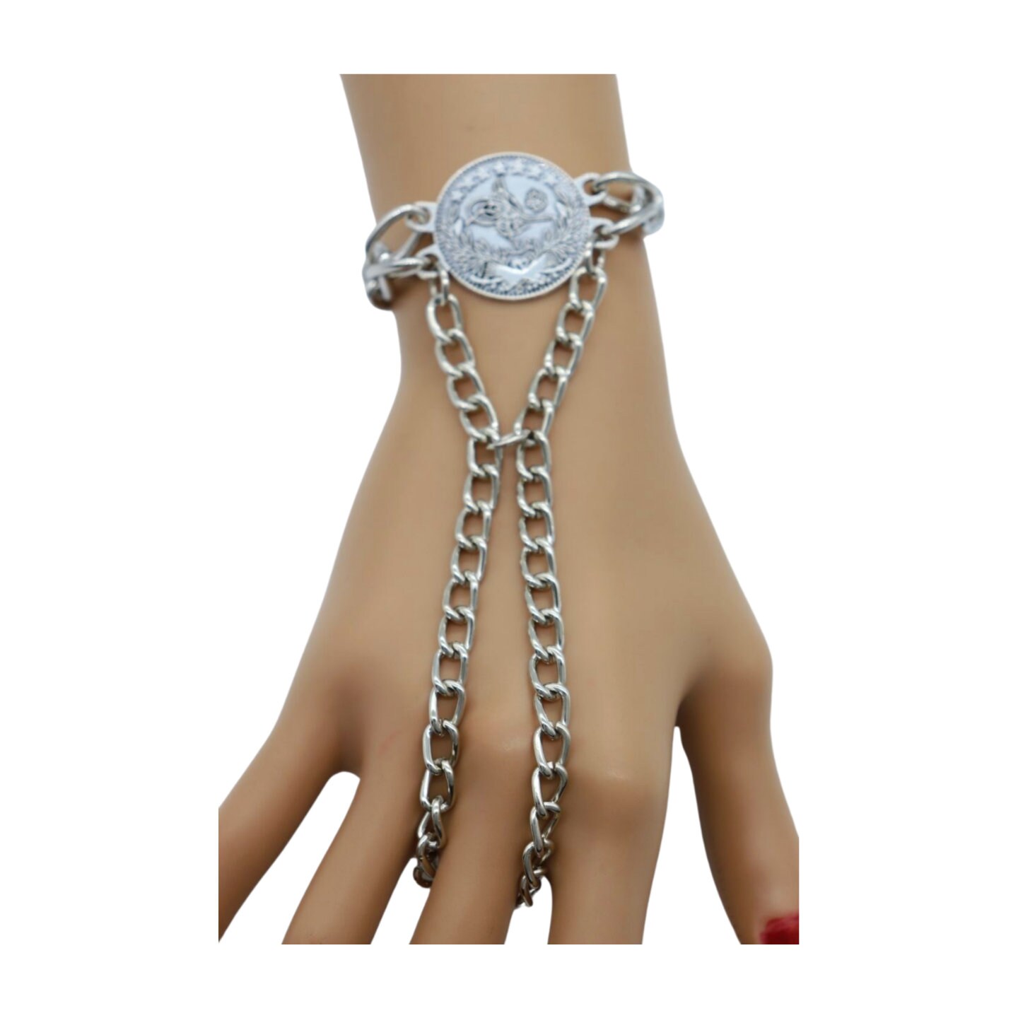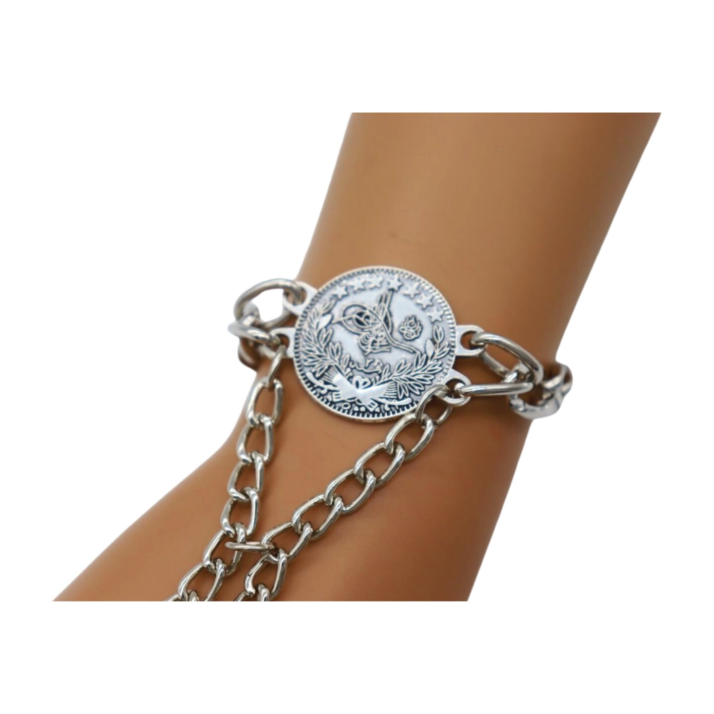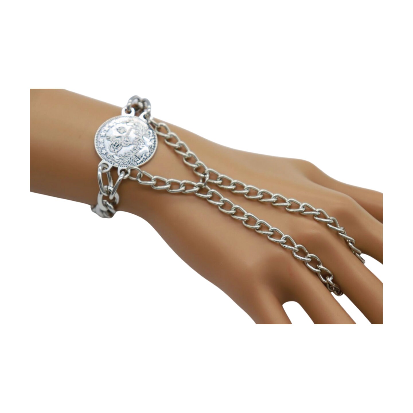 Boho Silver Coin Bracelet with Ring, Ethnic Hand Chain (Adjustable)