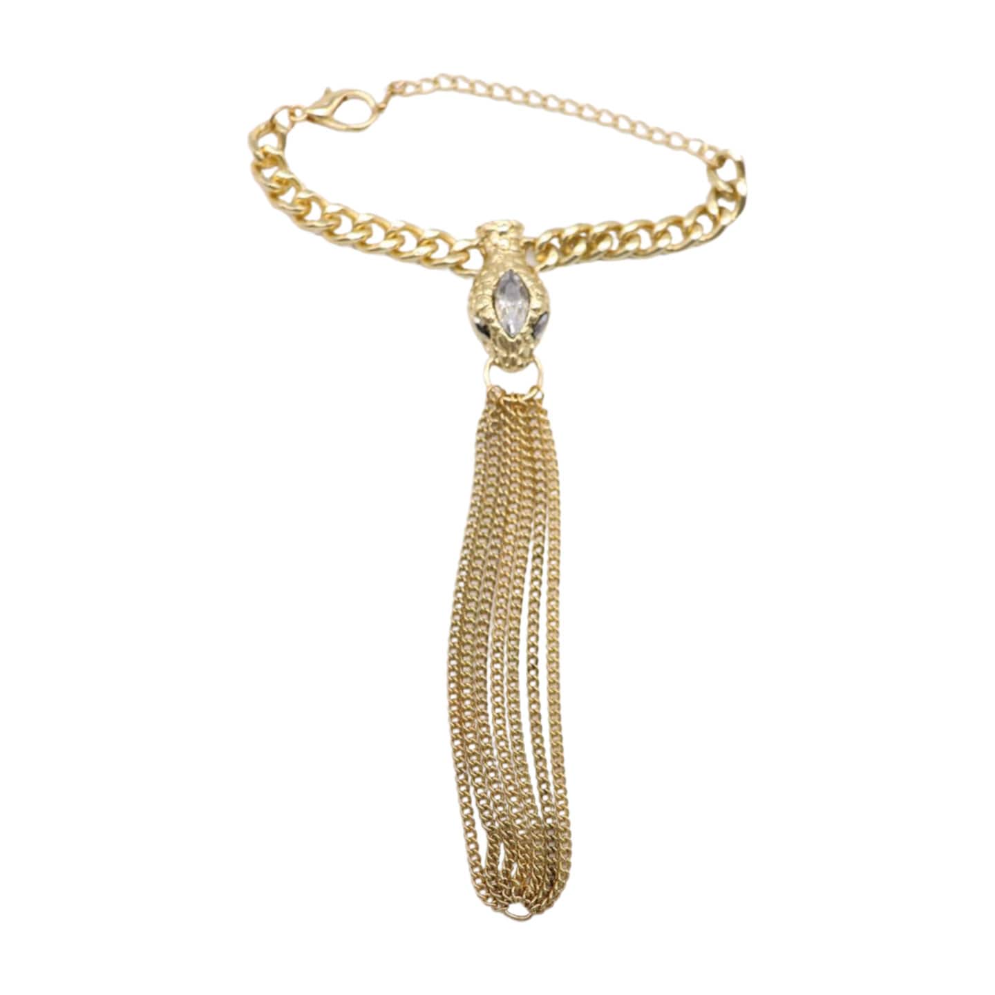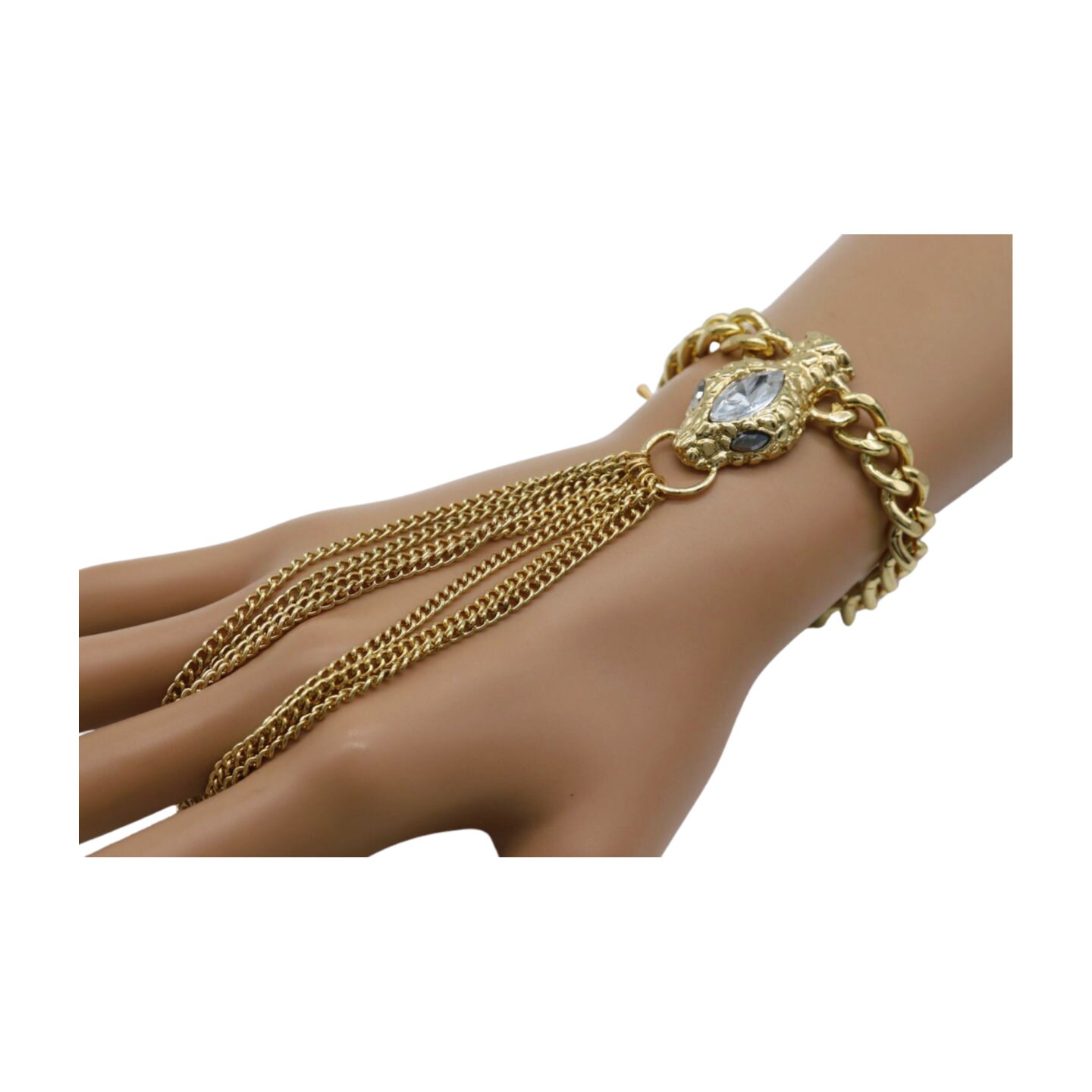 Gold Snake Head Hand Chain Bracelet: Rhinestone Bling Ring (Adjustable)