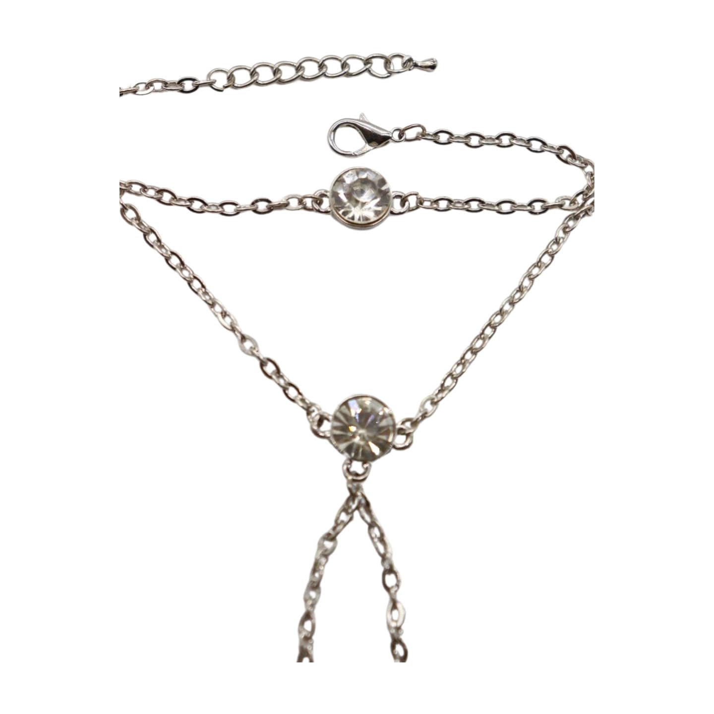 Introducing our Silver Metal Hand Chain Fashion Bracelet, a captivating accessory that combines elegance with a touch of glamour. This hand chain features two blingy, shiny beads, connected to a sleek slave ring, creating a sophisticated look that's perfect for party time. Crafted from silver metal chain links and beads, this bracelet exudes simplicity, class, and cool style.