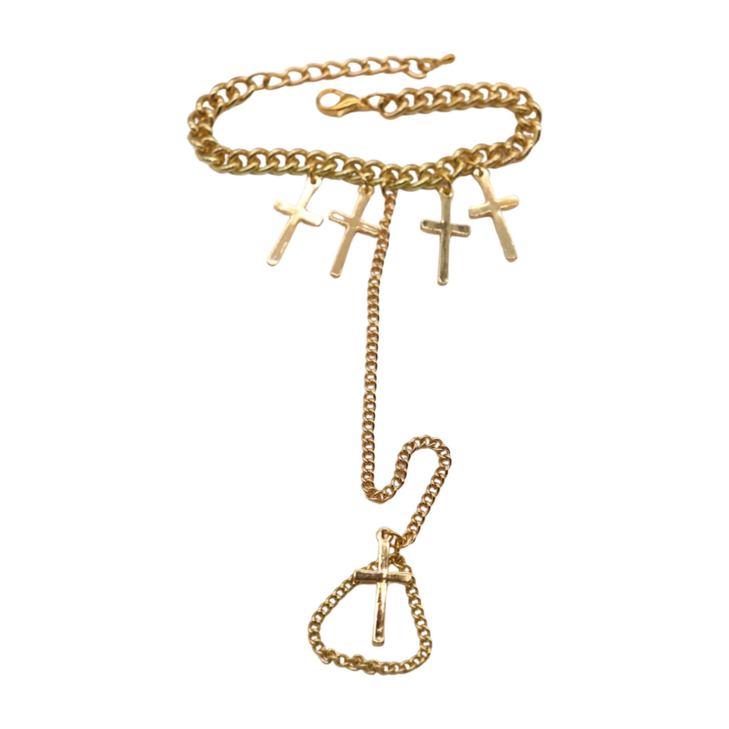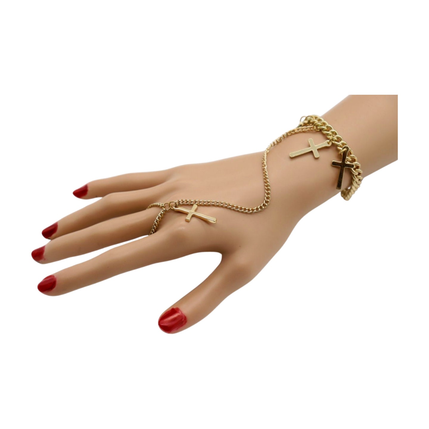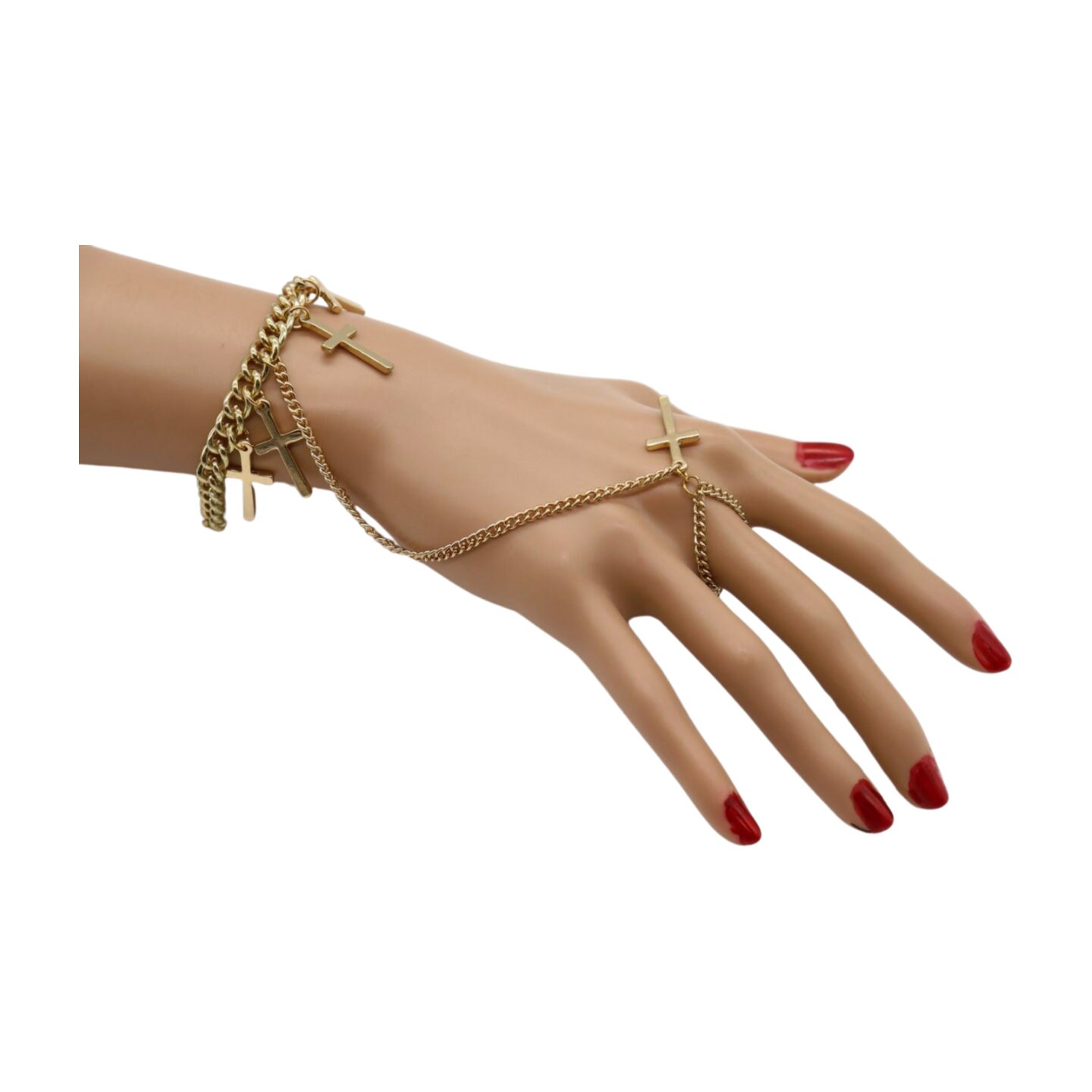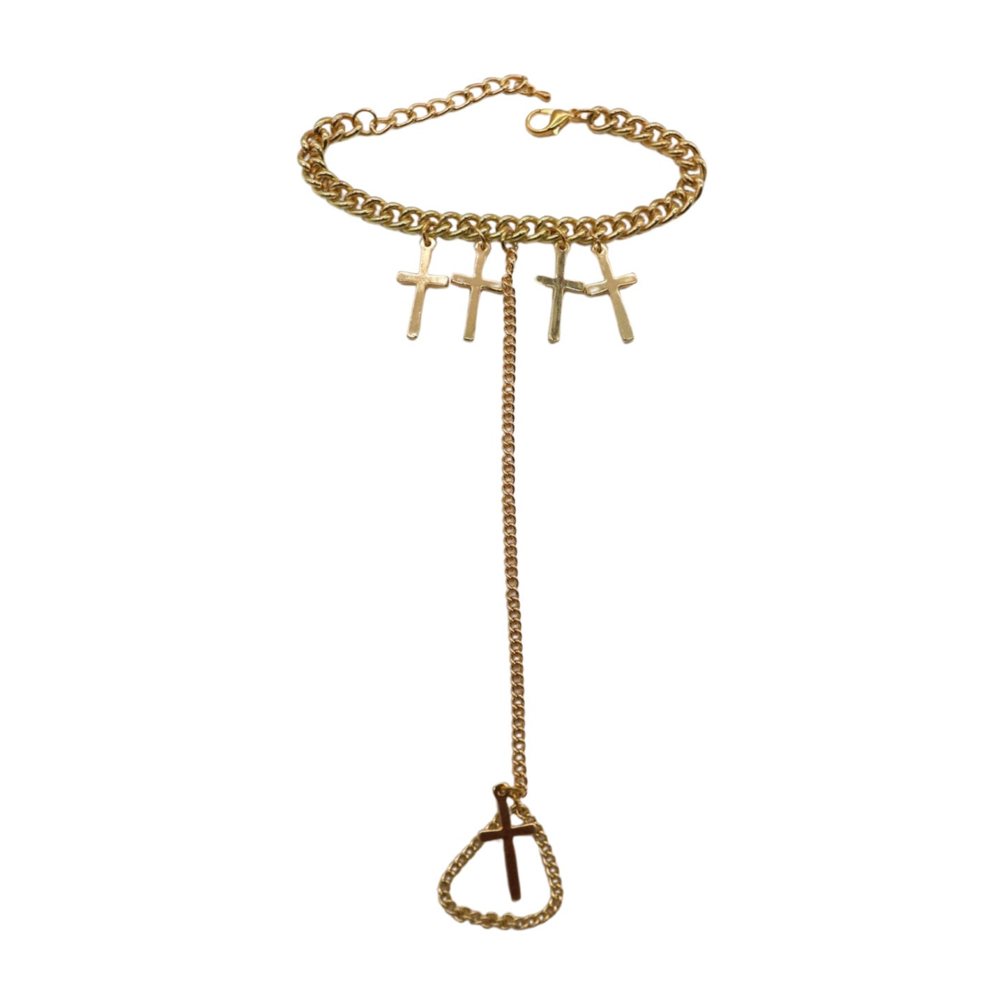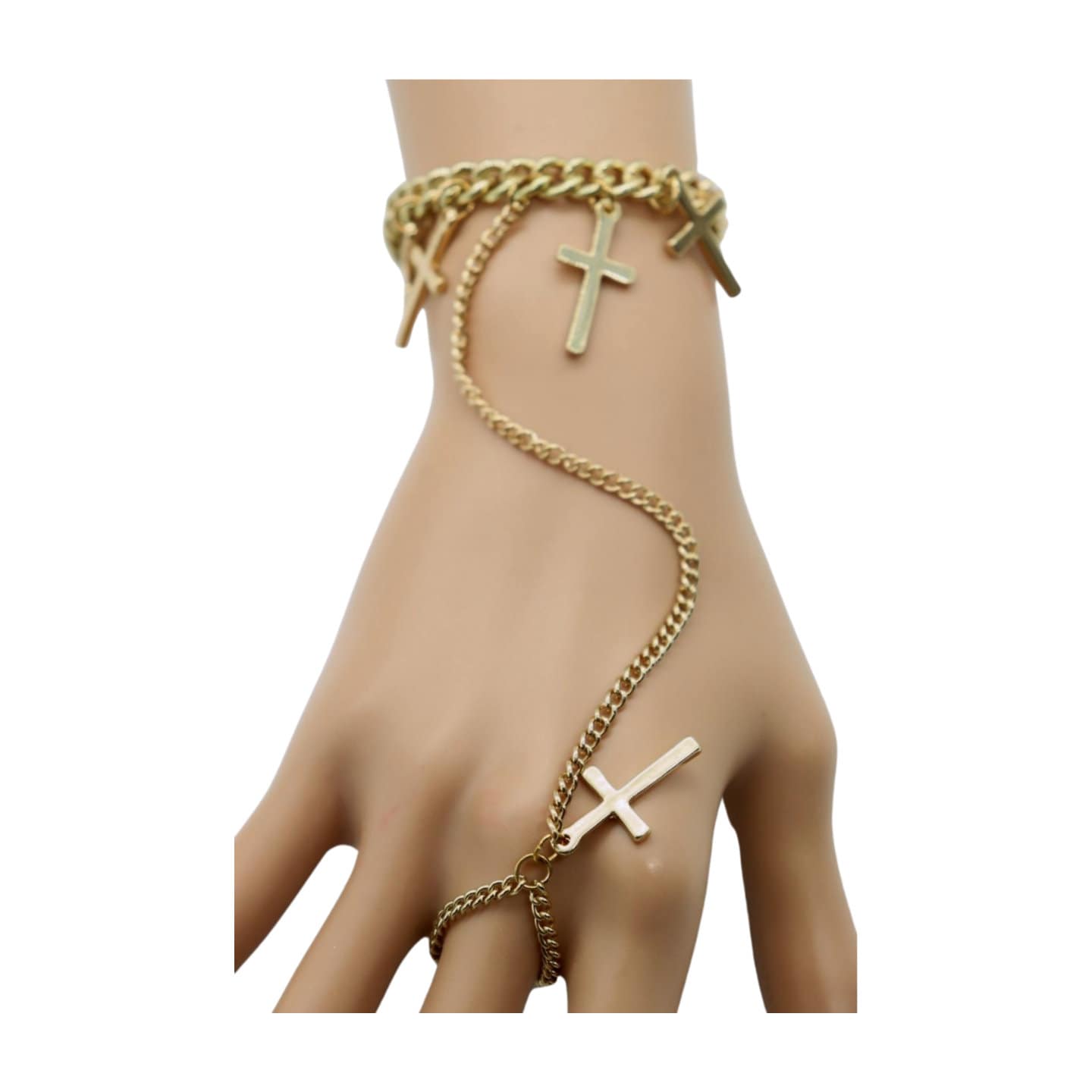 Unleash your inner style icon with our Women Religious Cross Charms Stylish Fashion Hand Chain Bracelet, a divine accessory that exudes celestial elegance and celebrity flair. This hand chain bracelet features intricate cross charms connected to a ring, embodying a blend of Western fashion and captivating bling jewelry. Crafted from shimmering gold metal, this bracelet is perfect for both day and night, making it a versatile and trendy jewelry accessory for any occasion.
