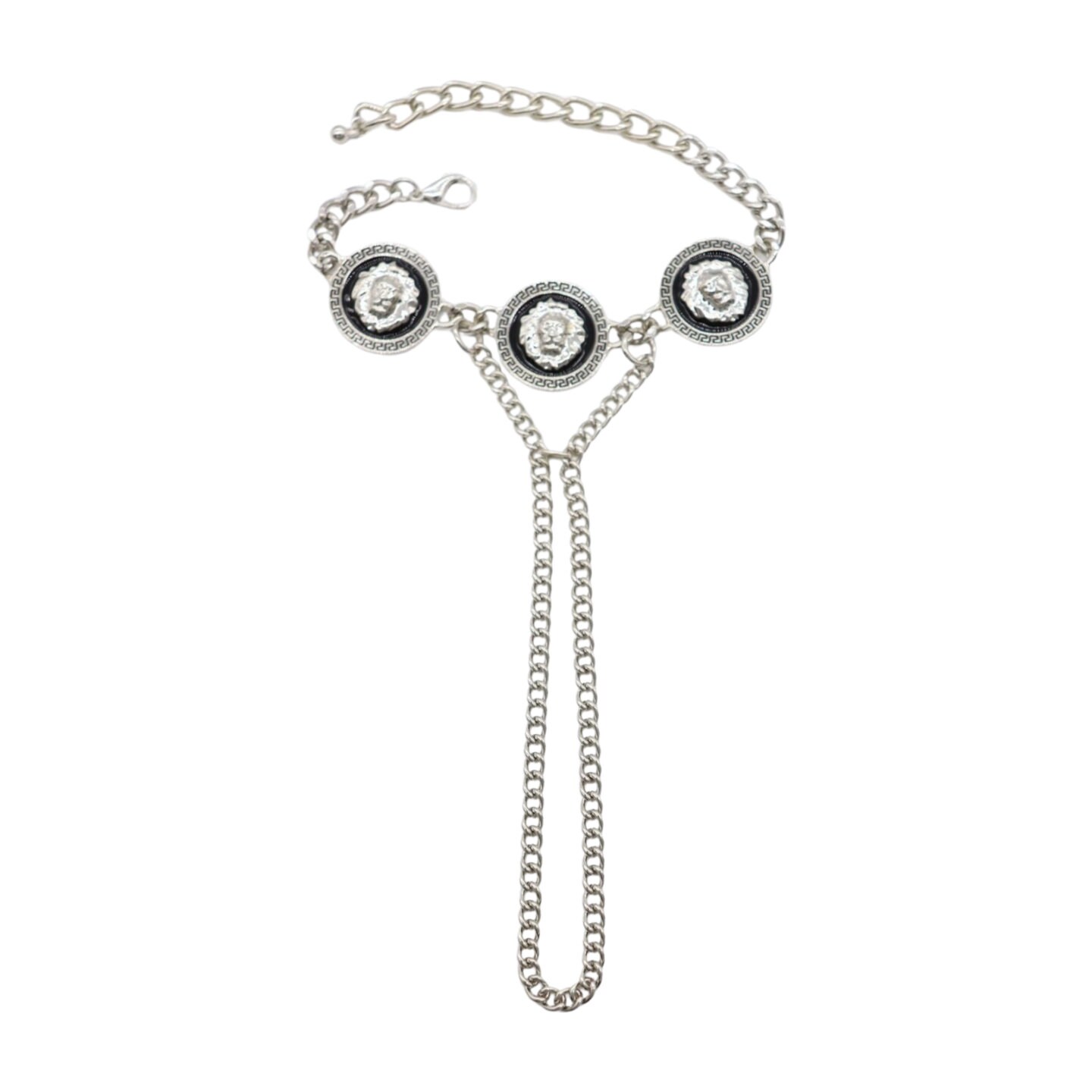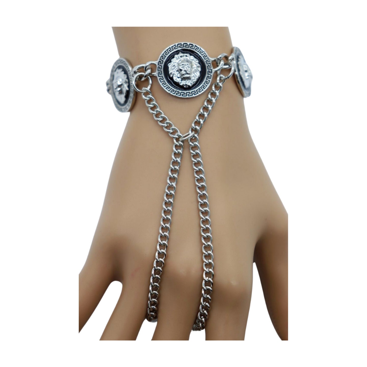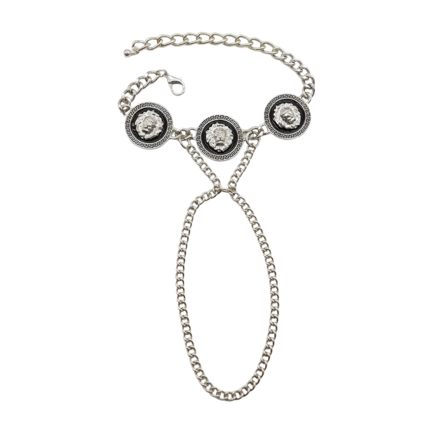 Trendy Fashion Statement: Make a bold statement with this hand chain bracelet, featuring three lion coin medallion charms that add an element of regal charm and sophistication to your look.