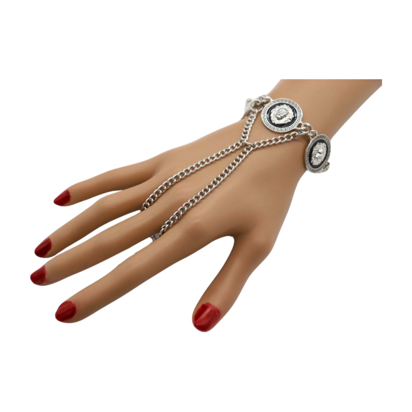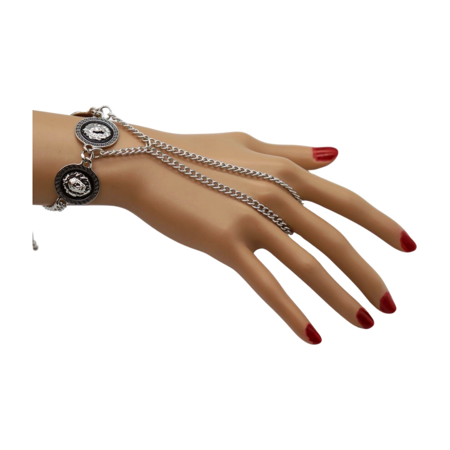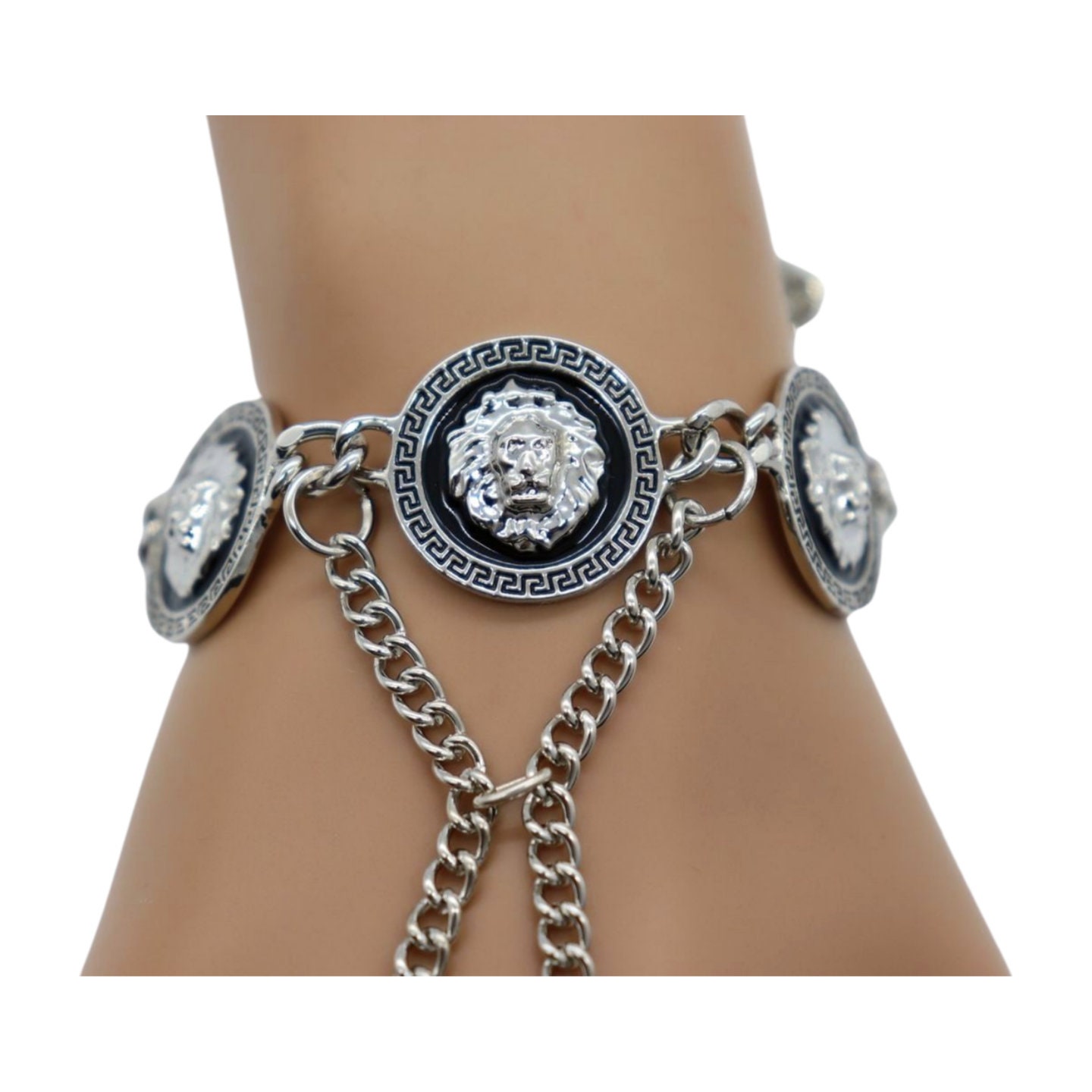 Trendy Fashion Statement: Make a bold statement with this hand chain bracelet, featuring three lion coin medallion charms that add an element of regal charm and sophistication to your look.
