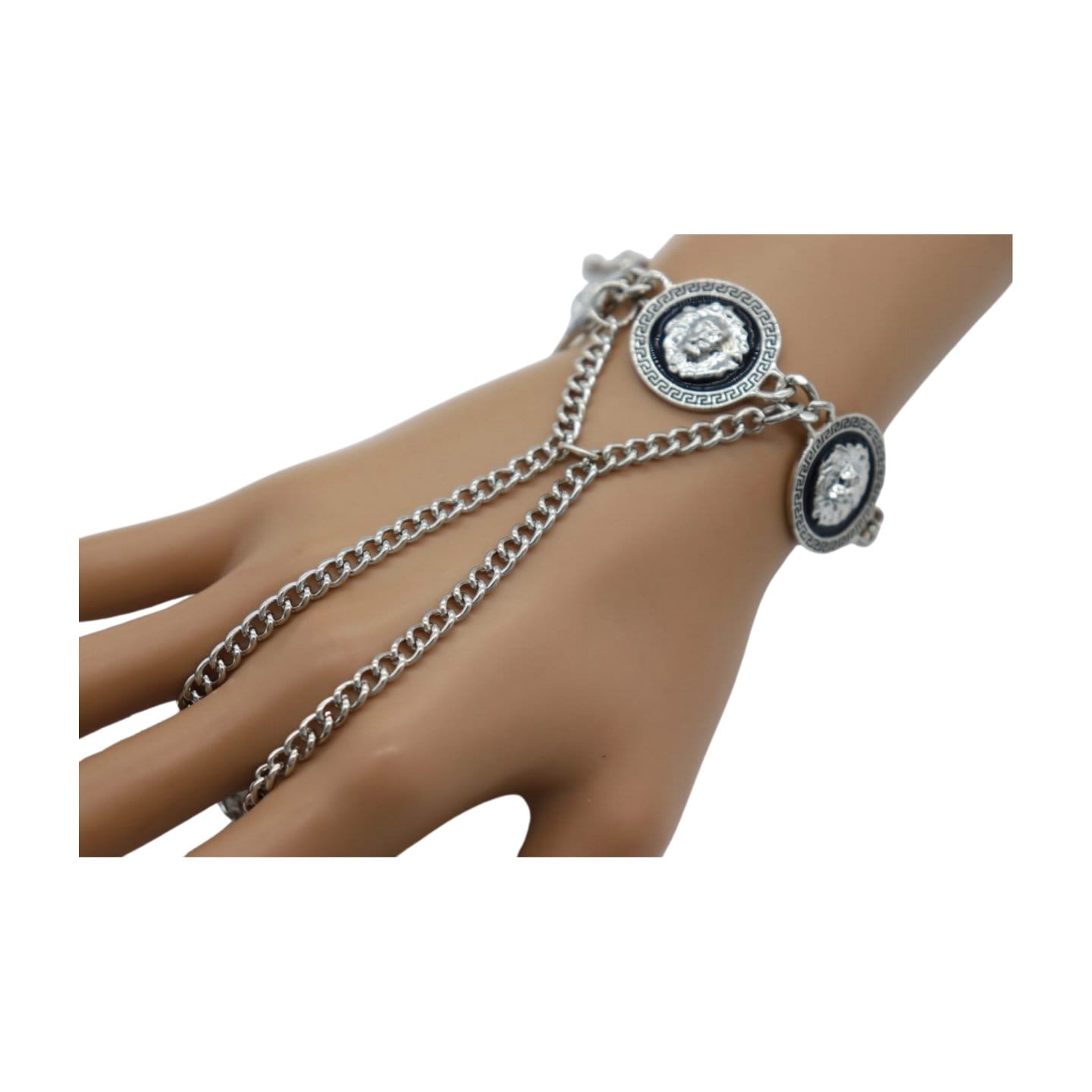 Elevate your style with our Women Hand Chain Jewelry Trendy Fashion Wrist Bracelet, a captivating accessory that merges sophistication with trendsetting fashion. This unique bracelet features three lion coin medallion charms connected to a sleek ring, creating a striking statement piece that exudes confidence and elegance. Crafted with meticulous attention to detail, this hand chain jewelry is perfect for adding a touch of glamour to any ensemble, whether it's day or night.