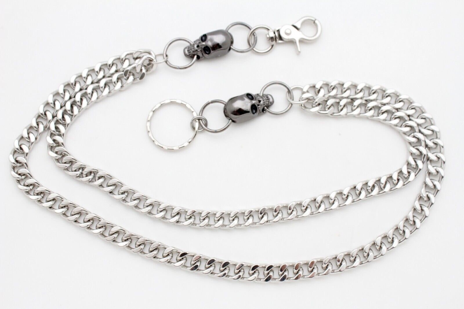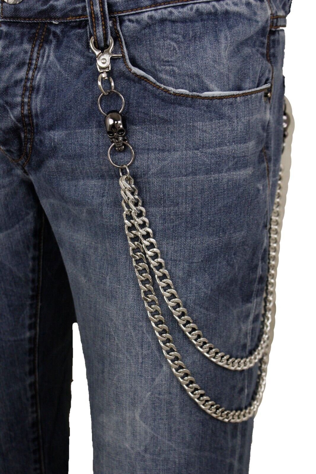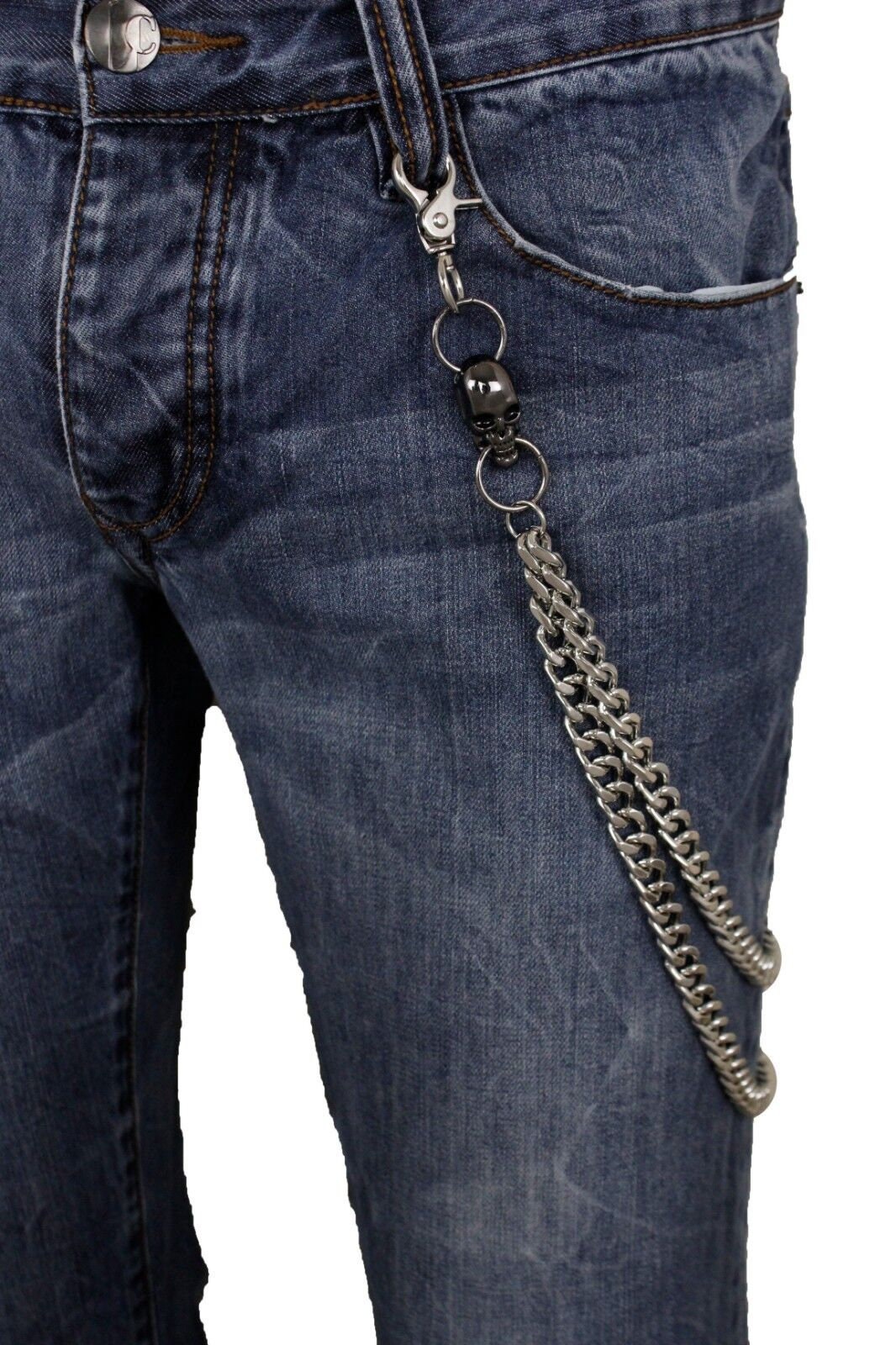 Elevate your biker style with our Men's Silver Wallet Chain adorned with Pewter Color Skull Charms, the perfect accessory for showcasing your love for the open road.