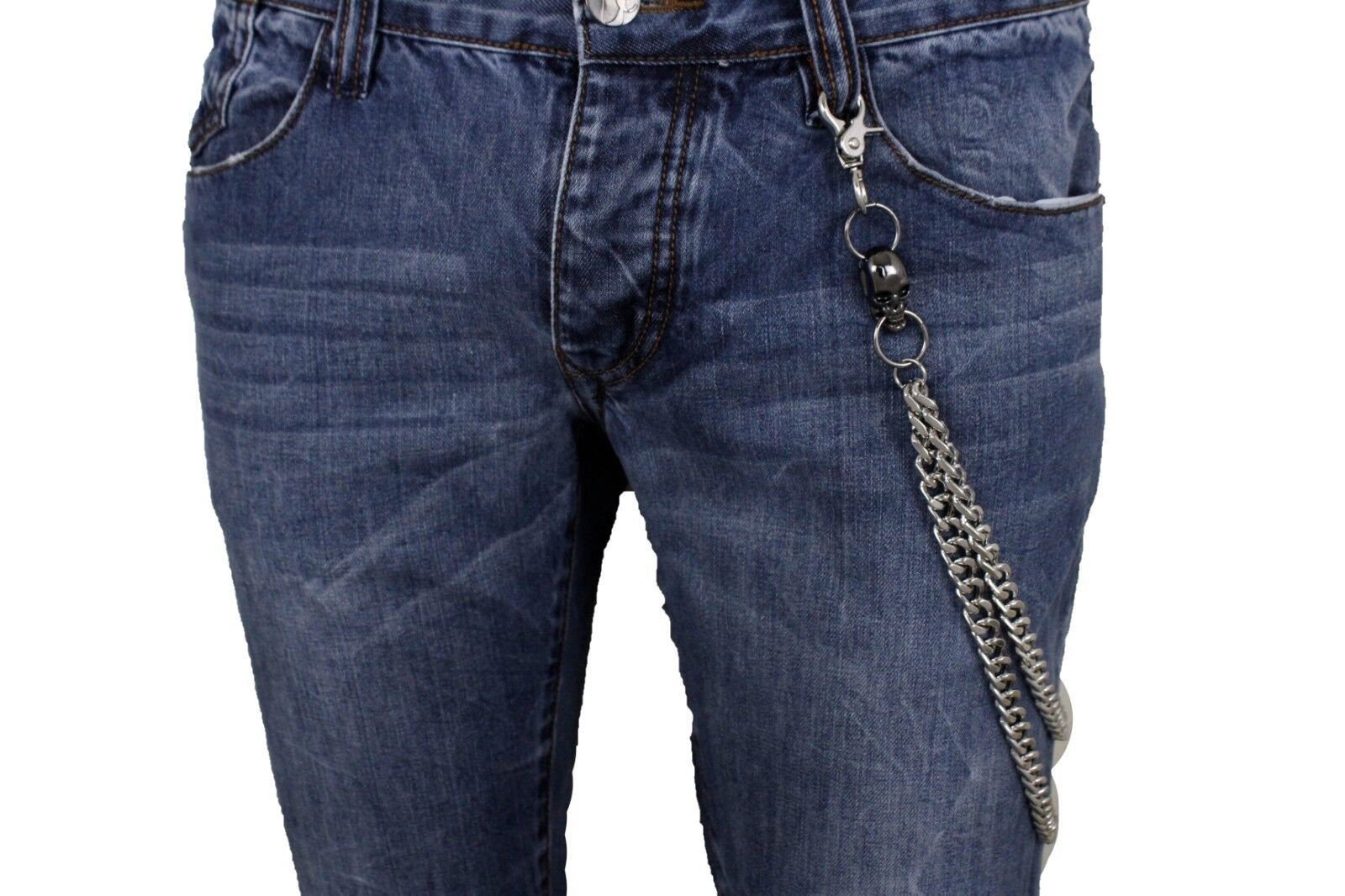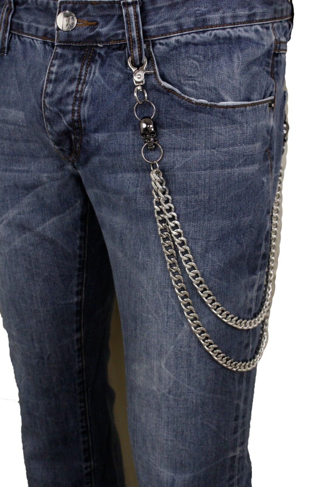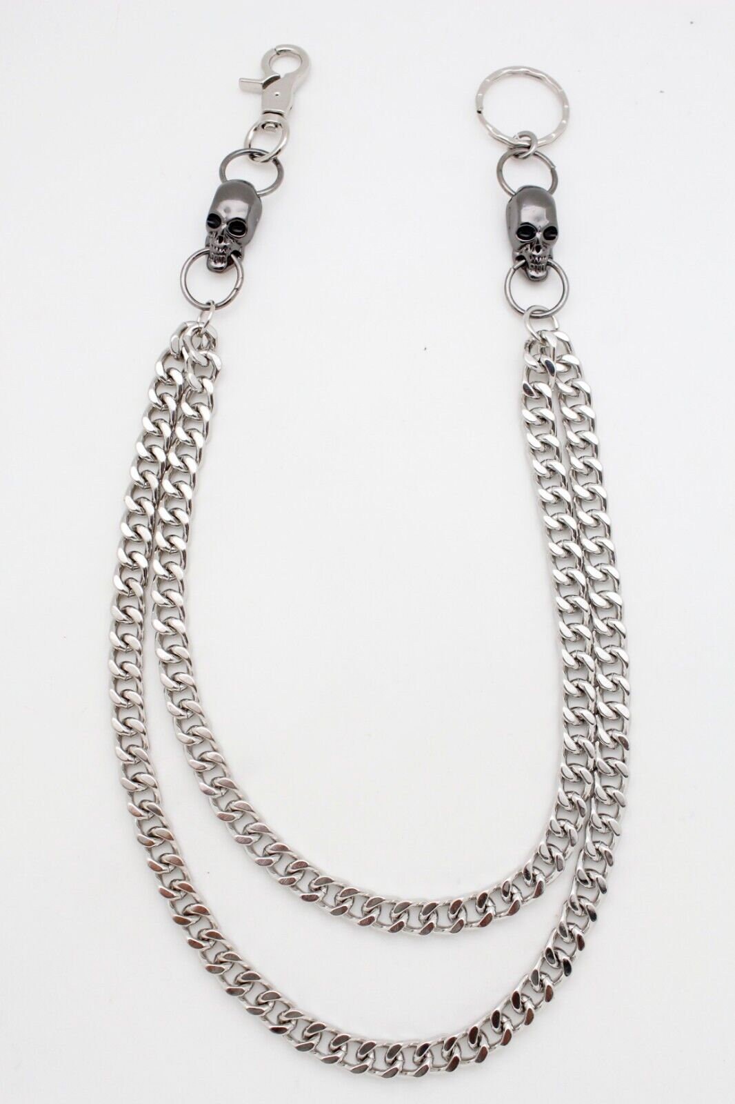 Elevate your biker style with our Men's Silver Wallet Chain adorned with Pewter Color Skull Charms, the perfect accessory for showcasing your love for the open road.