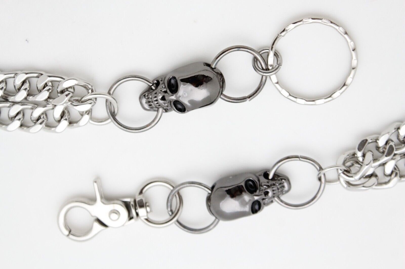 Biker Wallet Chain: Silver Metal Links, Pewter Skull Charms, 23"