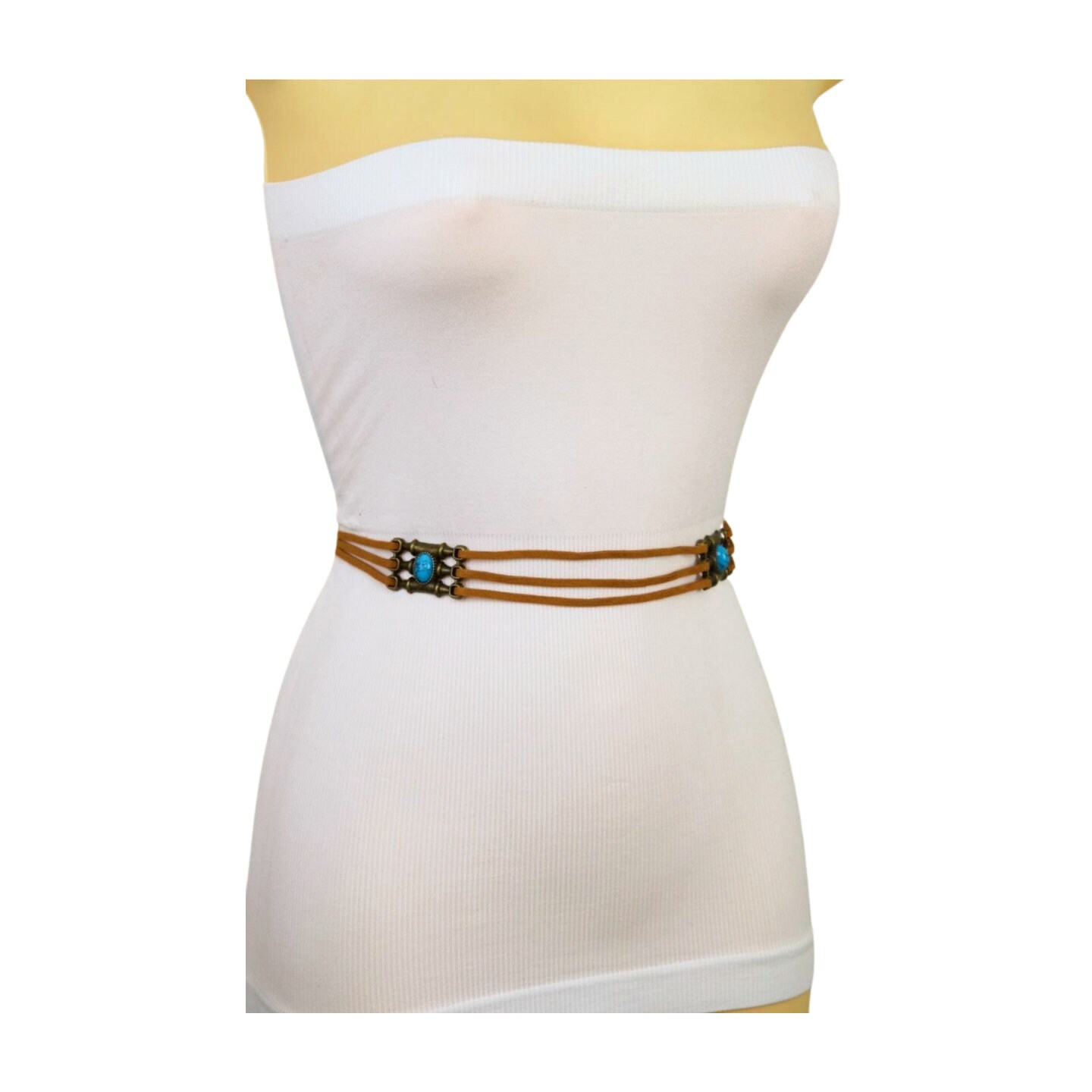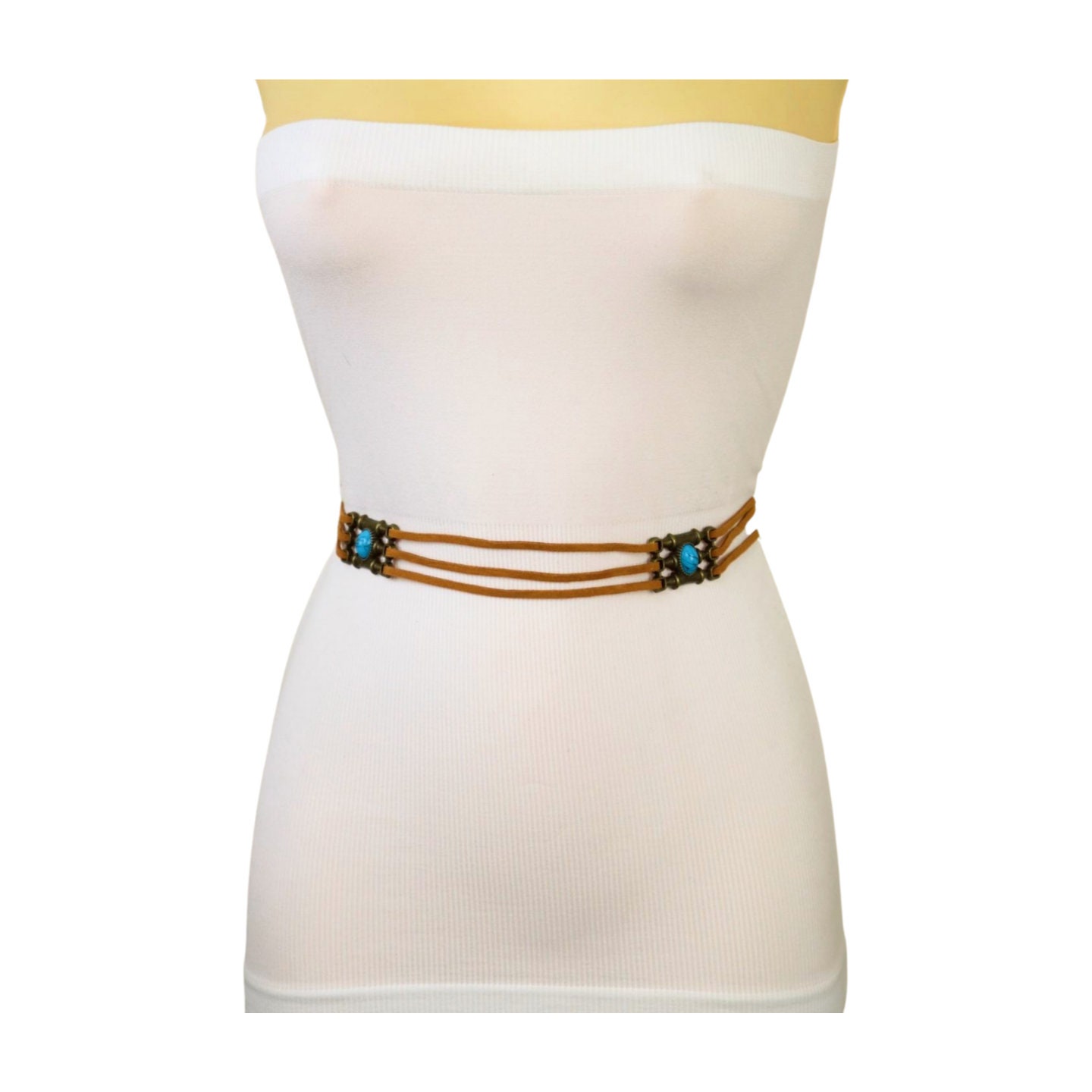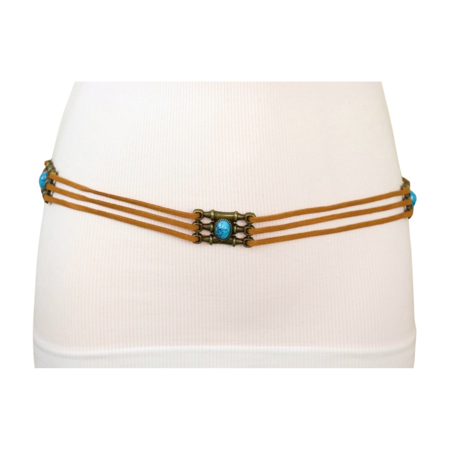 Color : Brown faux suede leather waistband fabric + antique rusty gold metal hardware charms + turquoise blue beads