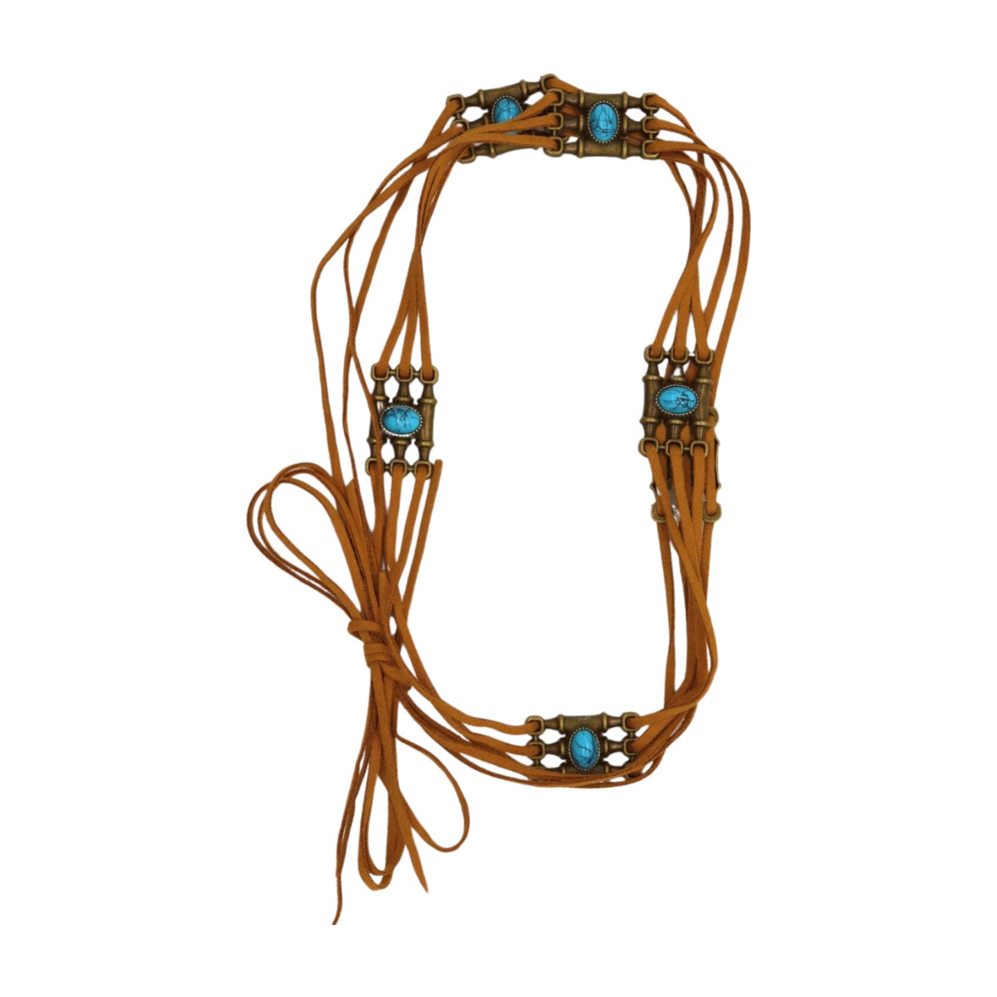 Charms: Adorned with antique gold metal charms and turquoise blue beads that enhance the belt’s rustic and boho aesthetic.