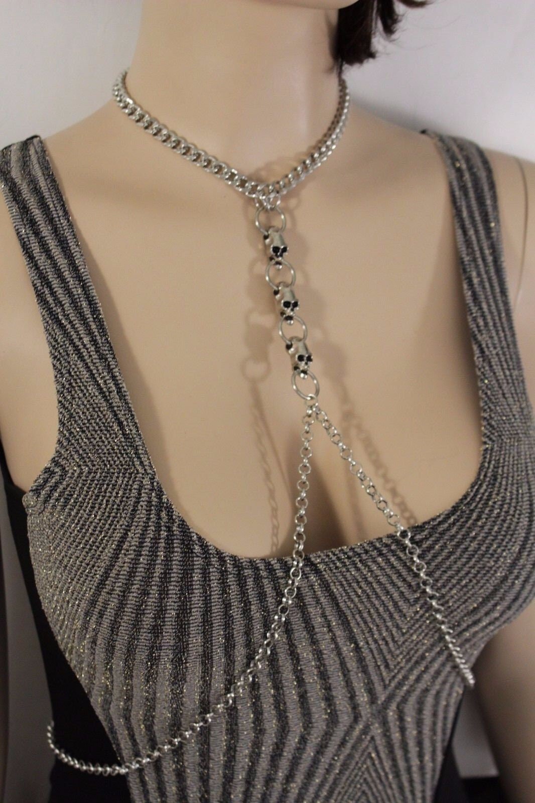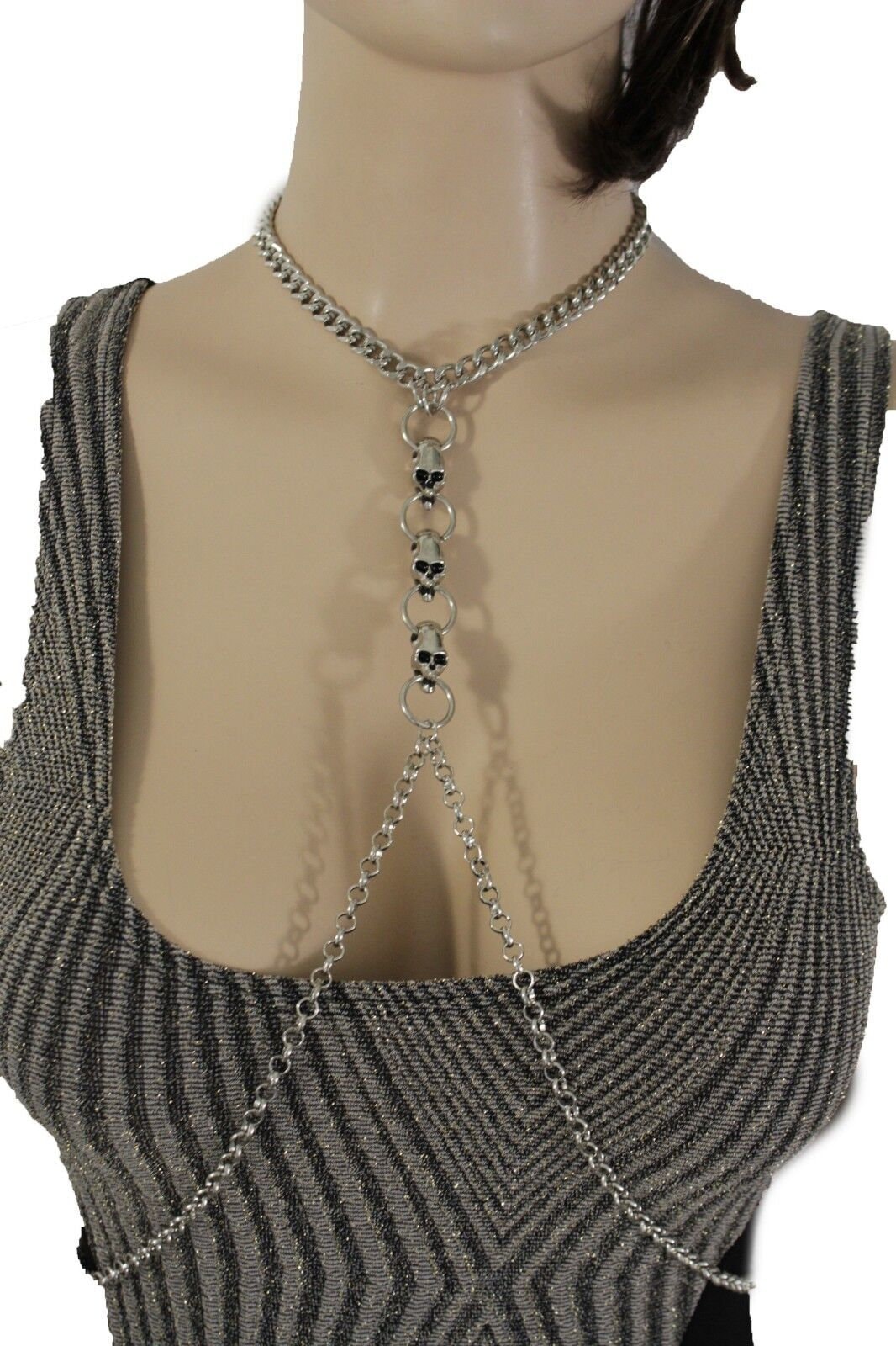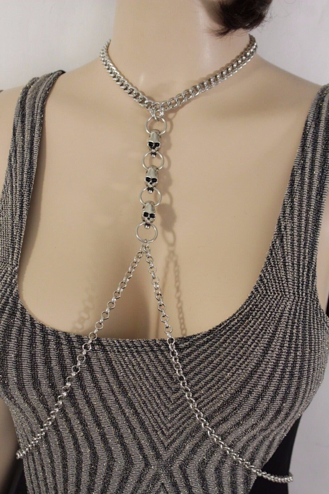 Hashtags: #WomenNecklace #BodyChainJewelry #GothicFashion #SilverChain #SkeletonSkulls #TrendyJewelry #HotAccessory