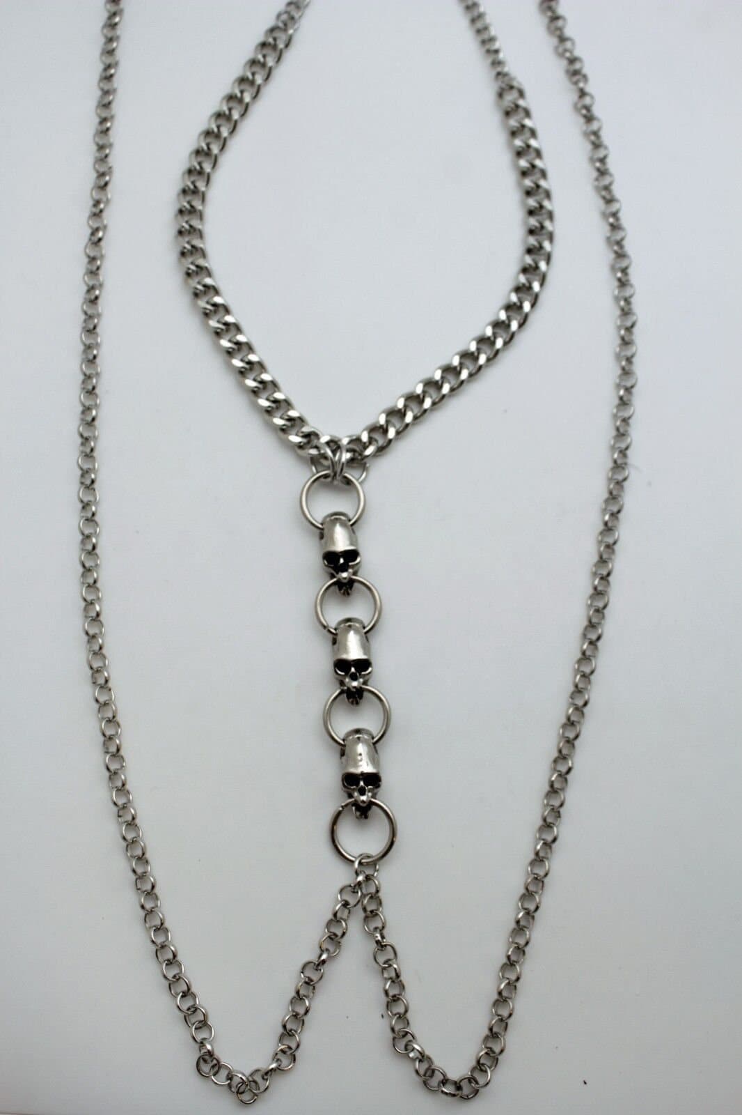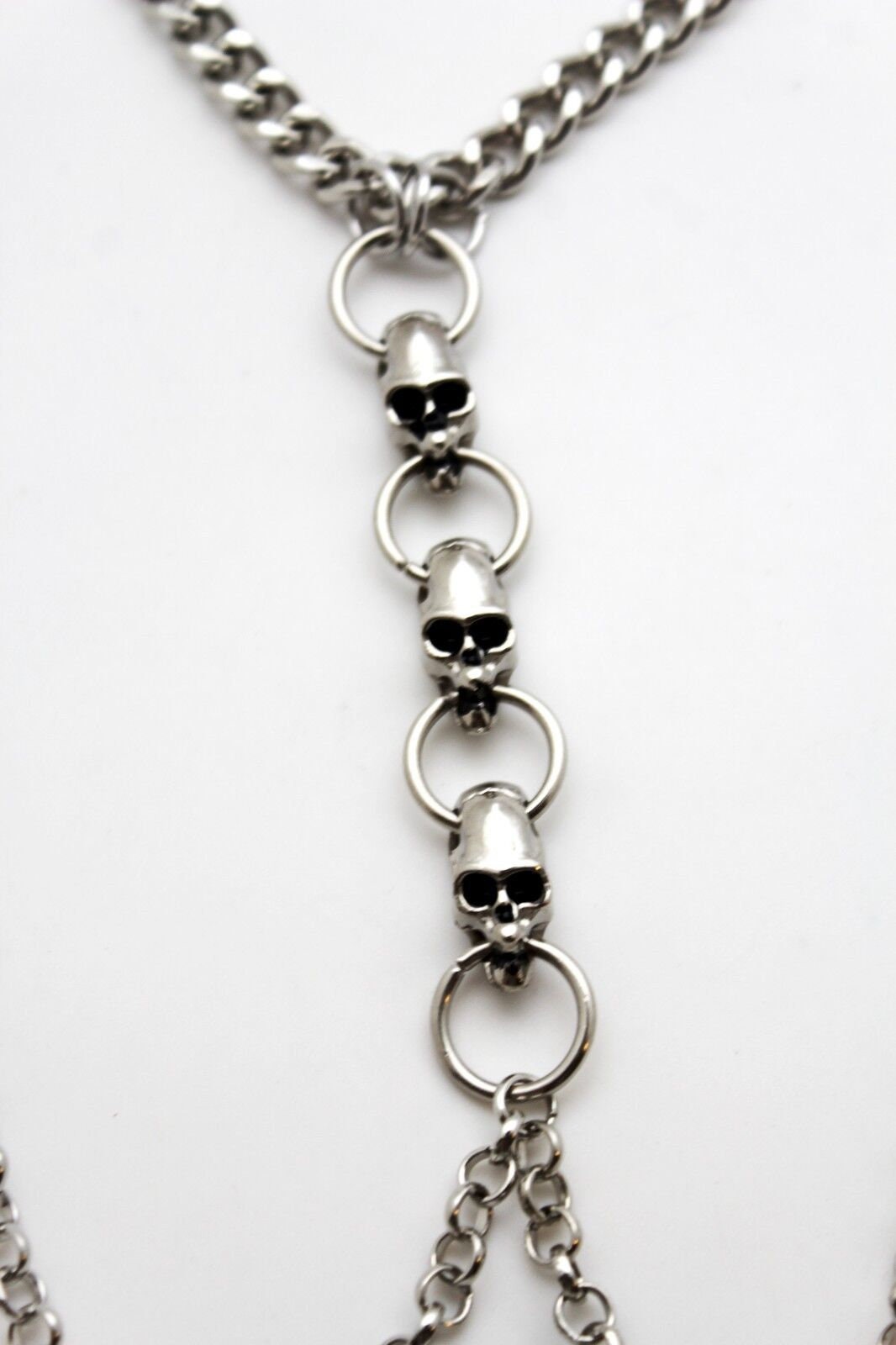 Gothic-inspired body chain necklace with skeleton skulls design.