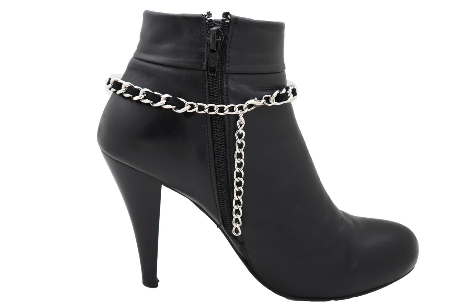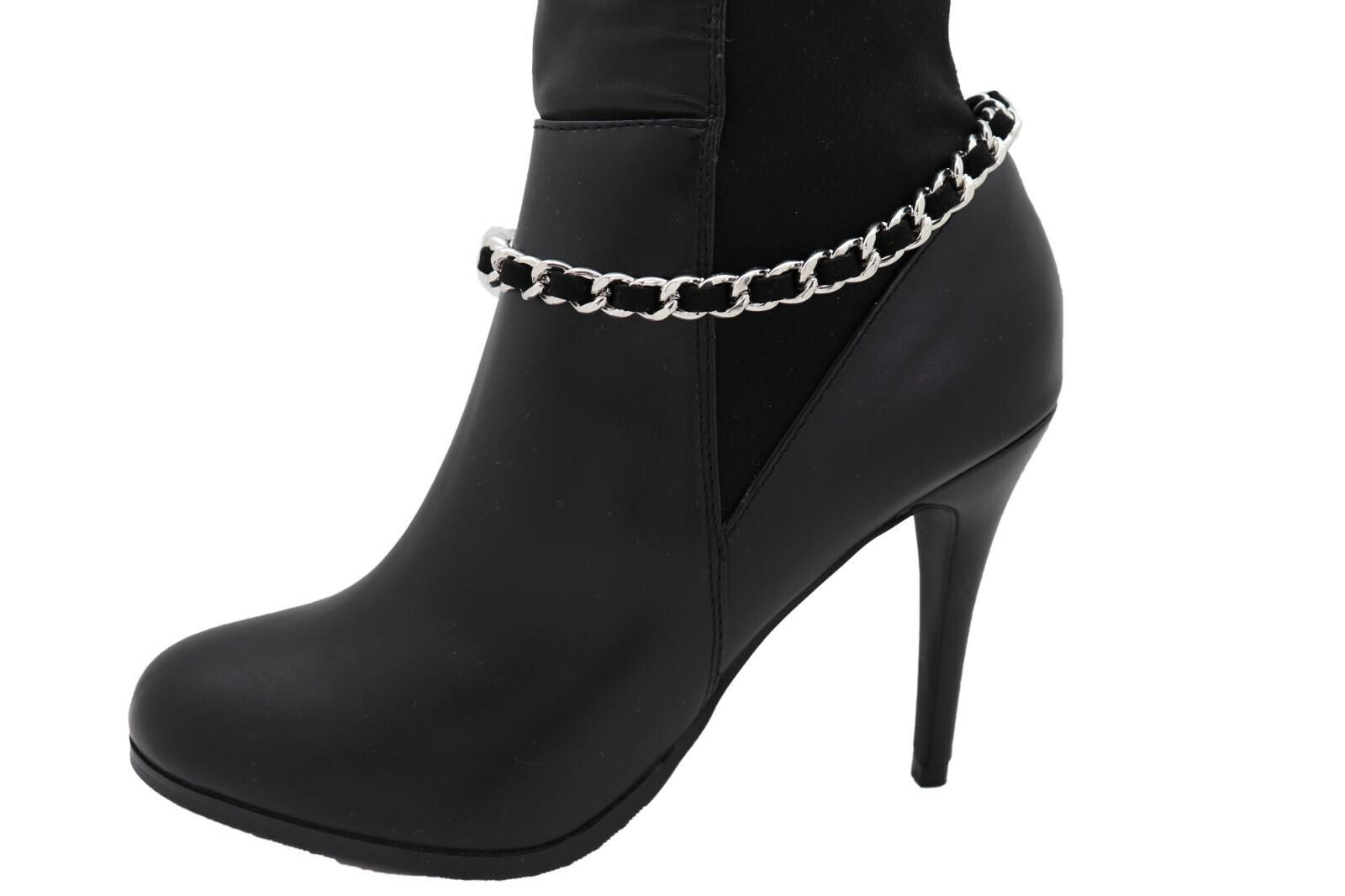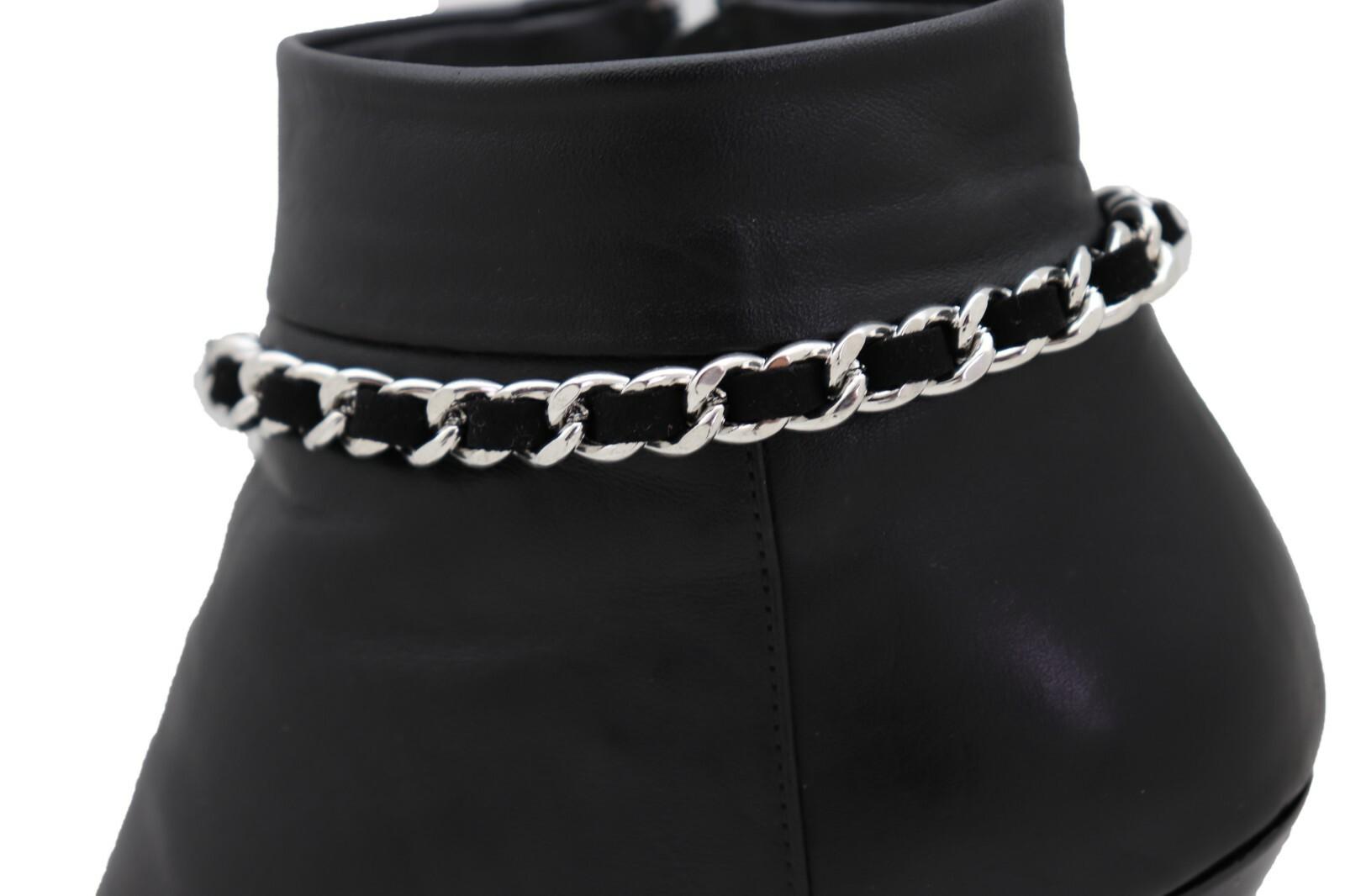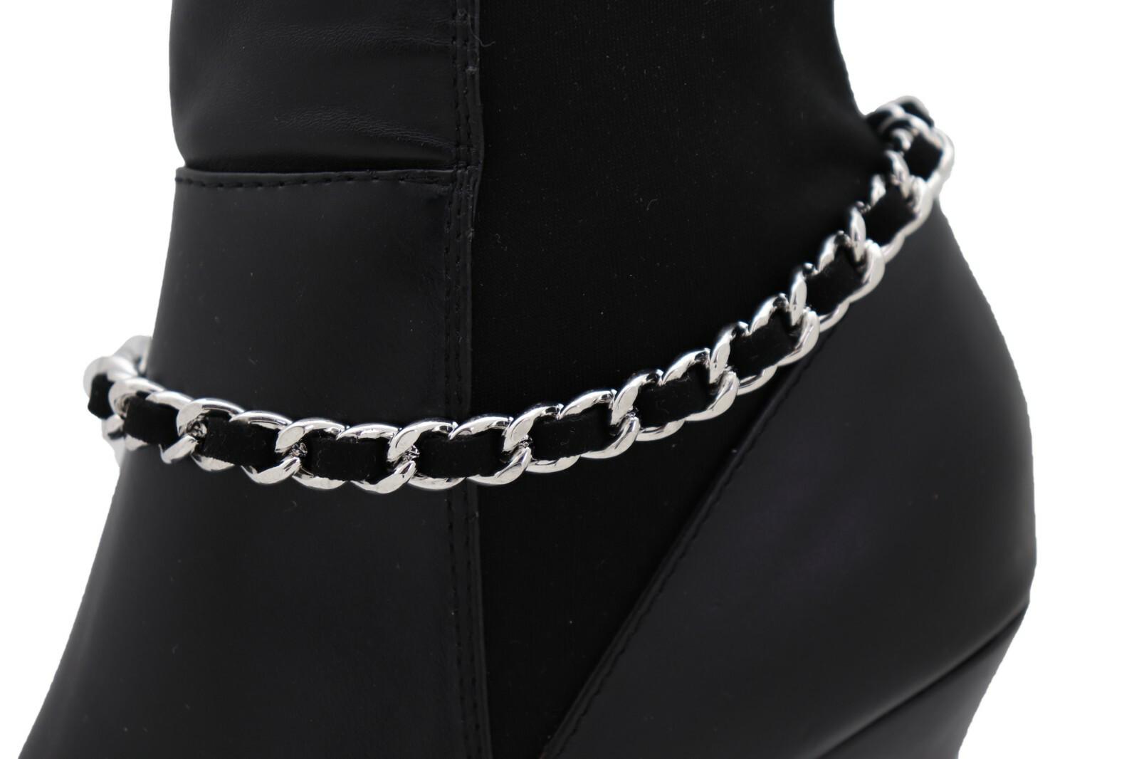 Country Luxe Boot Bracelet Pair, Silver Chain + Black Fabric Weave, Adj. 11–15 In, Western Boot Strap Anklet Set (2PCS)