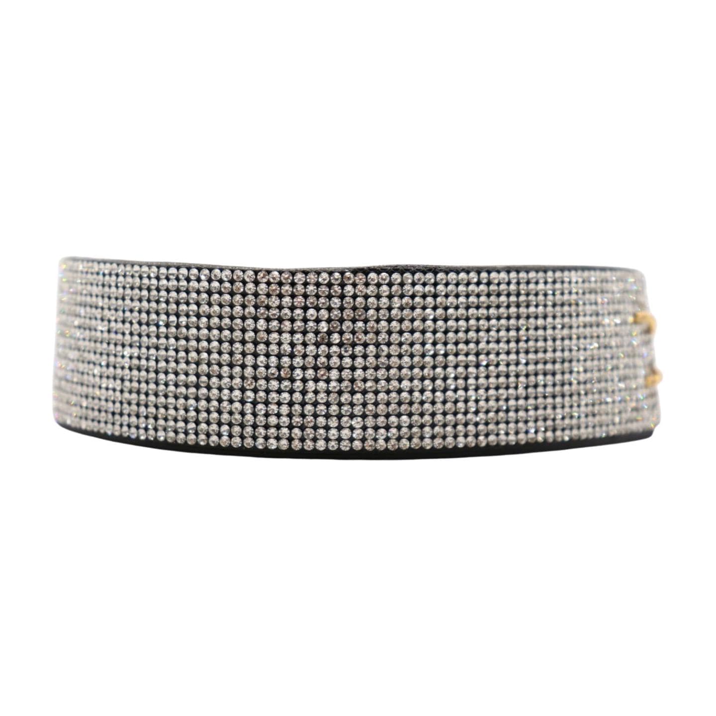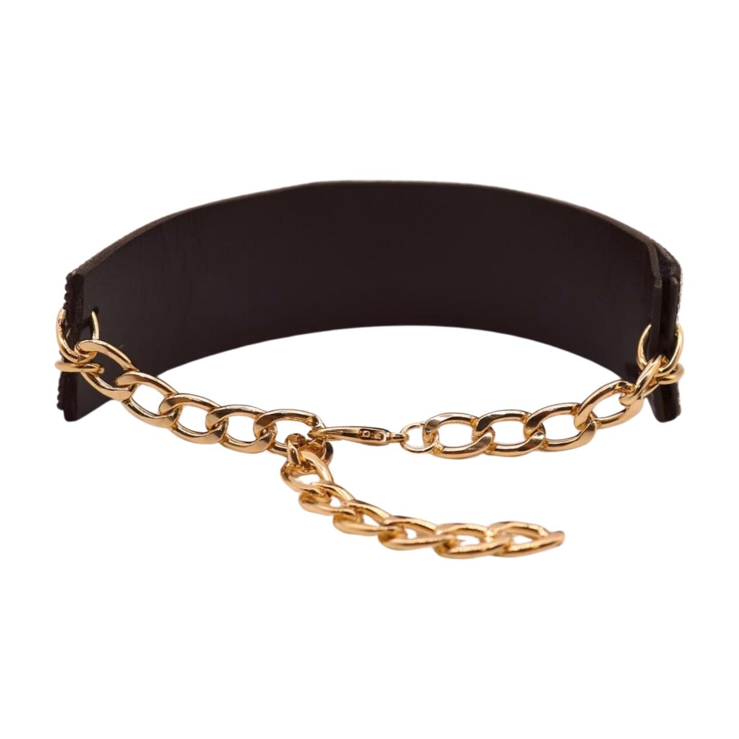 Chic Western Bling: Gold chain links, black faux leather, and rhinestones create a bold, stylish accessory perfect for making a statement.