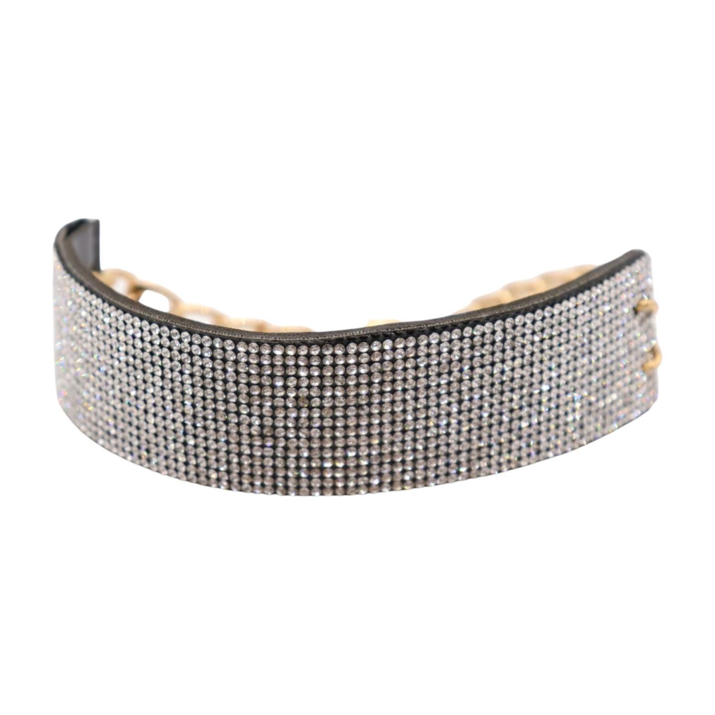 Color: Gold metal chain links + black faux leather band + silver rhinestones
