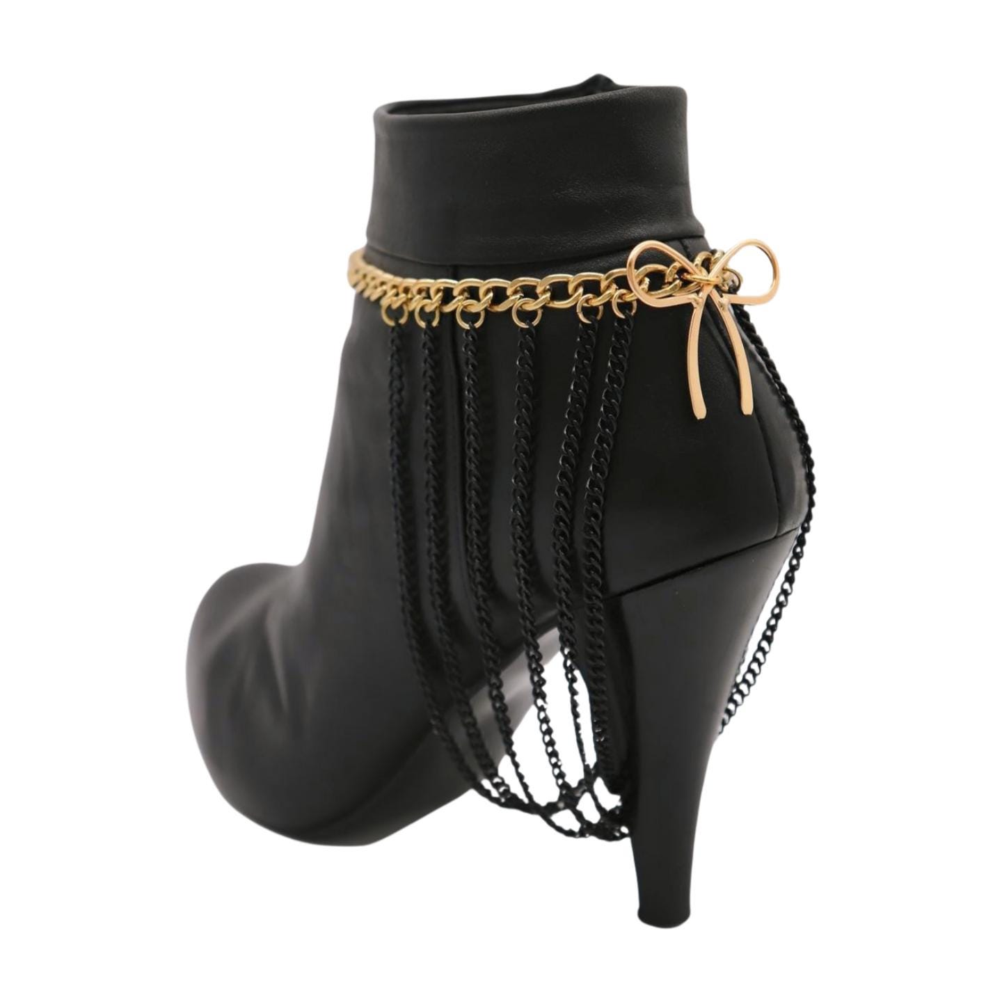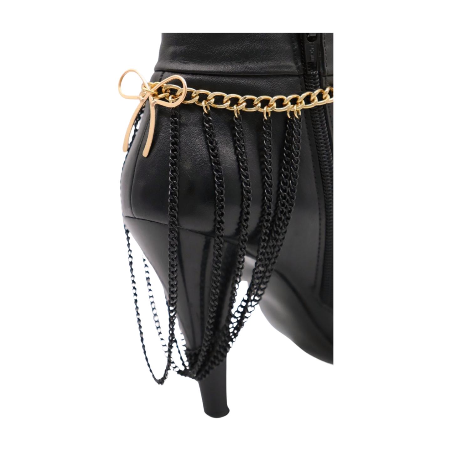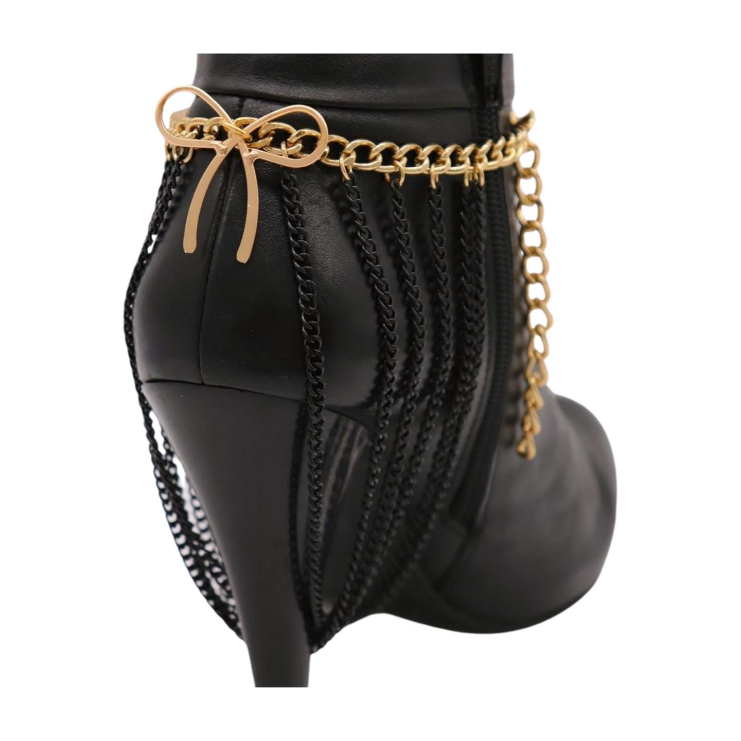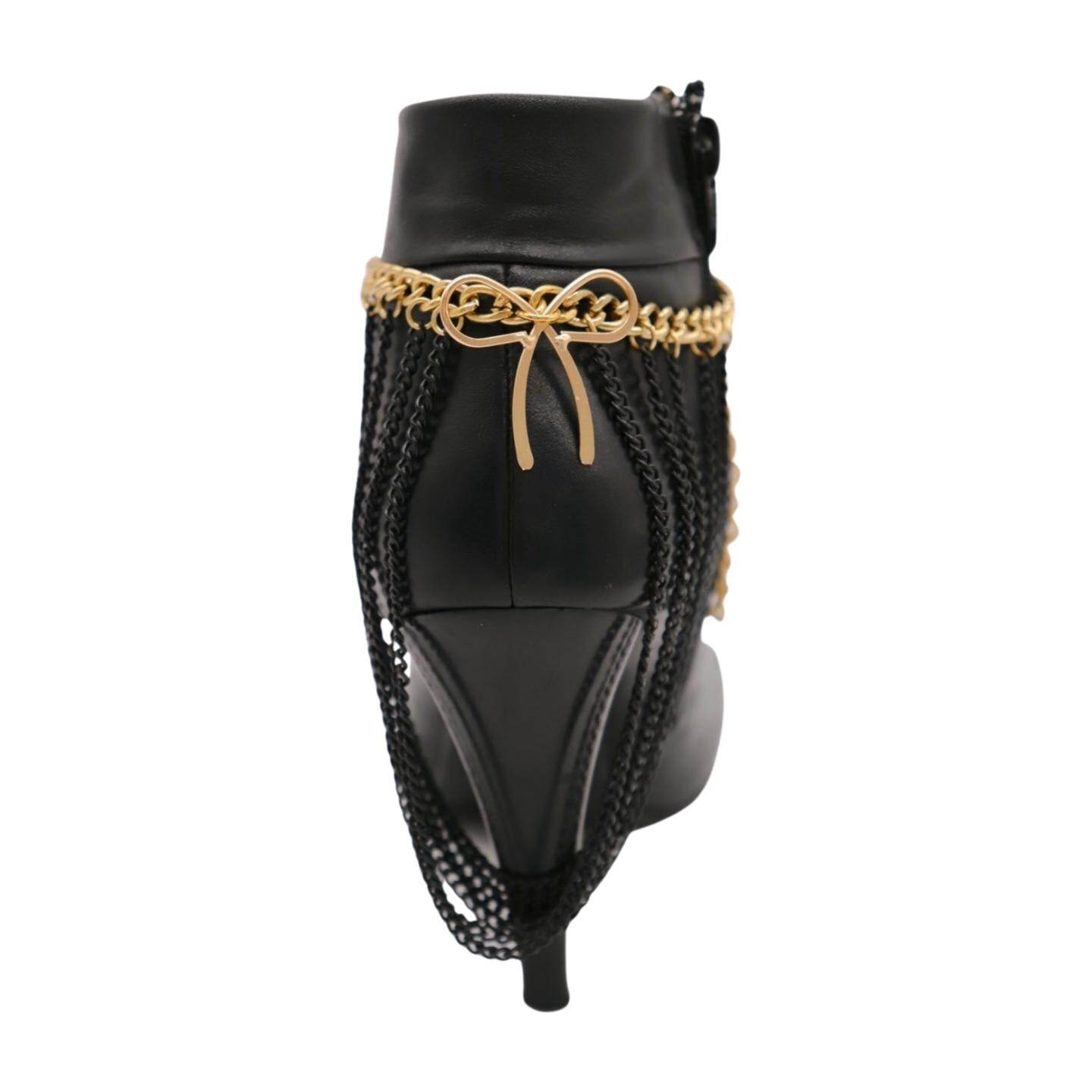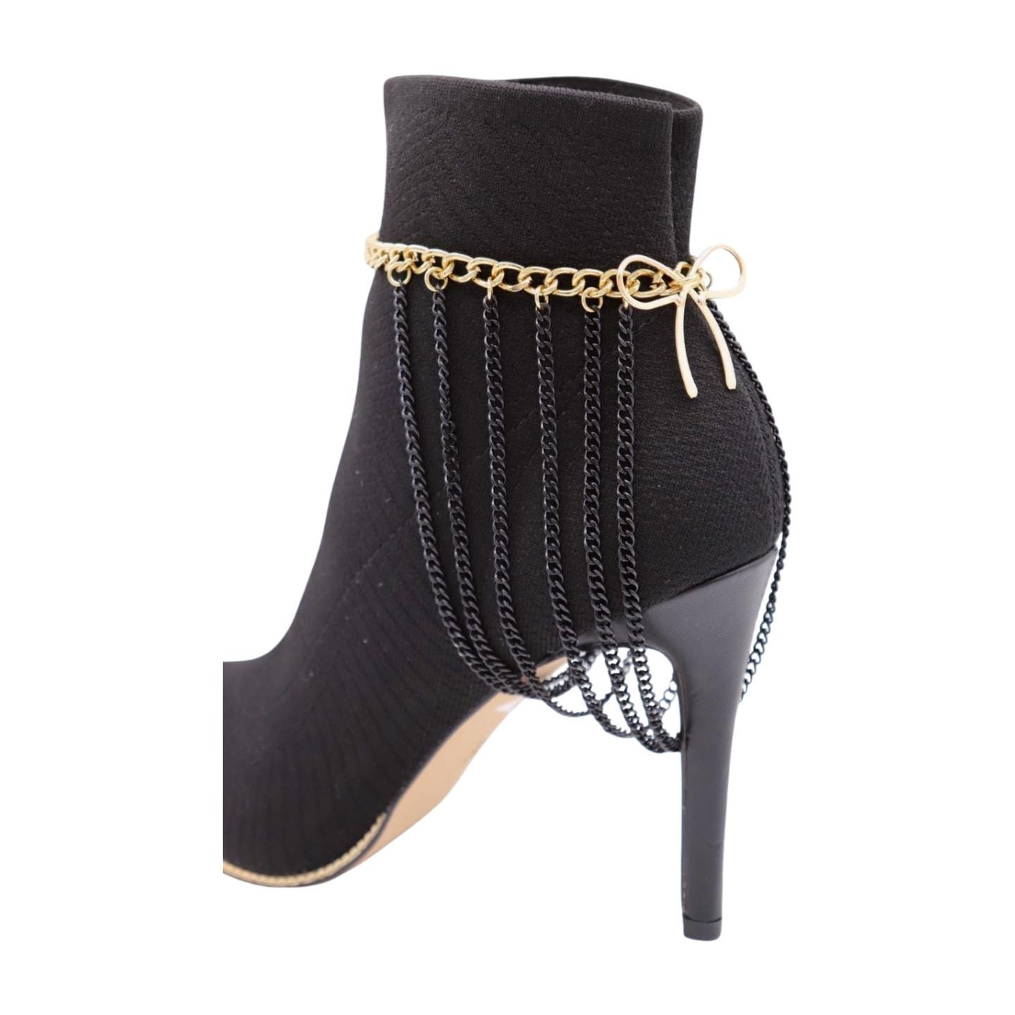 Black and gold boot chain anklet bracelet pair with bow charm draped chains BC198