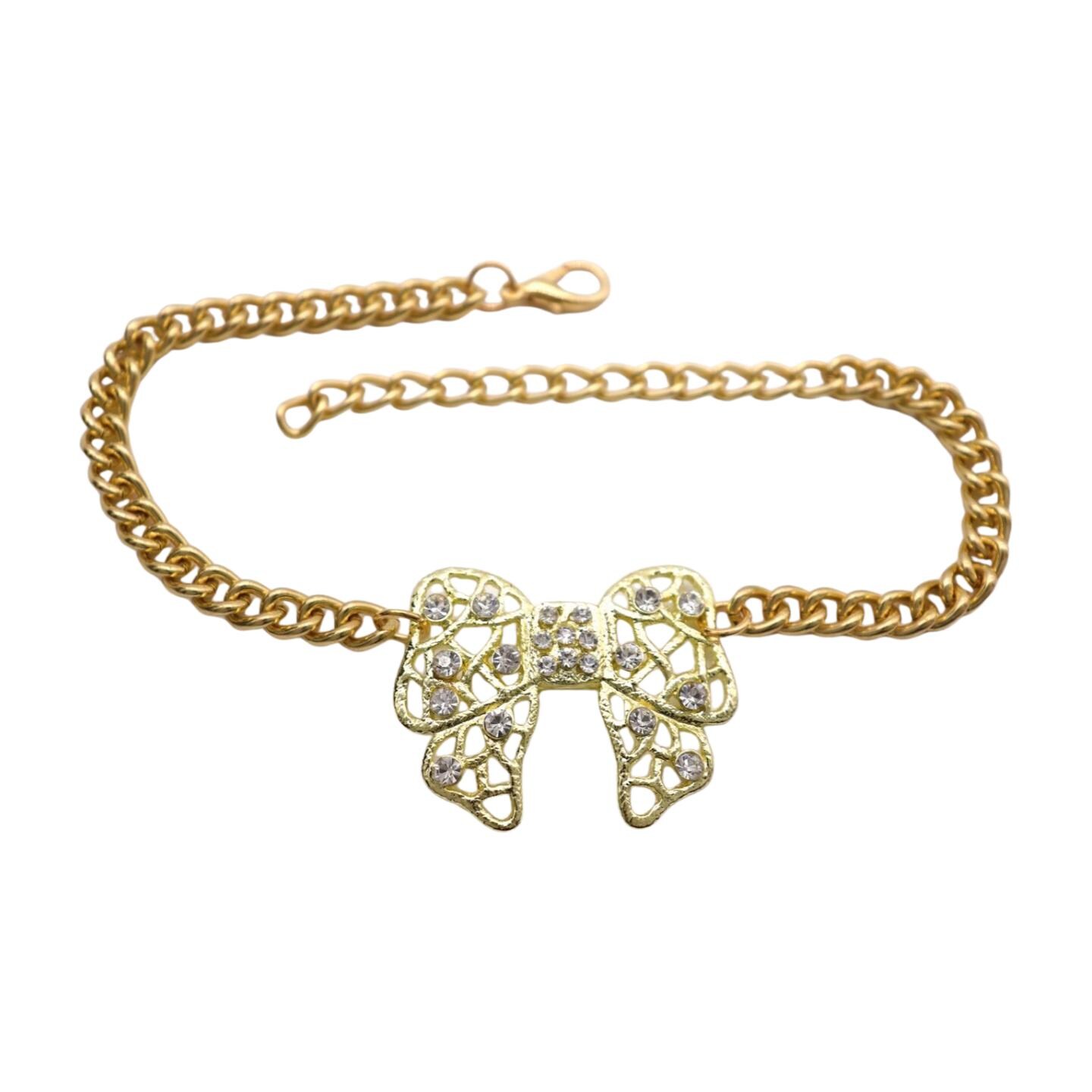 Color: Gold metal chain links with bow tie ribbon charm + silver rhinestones