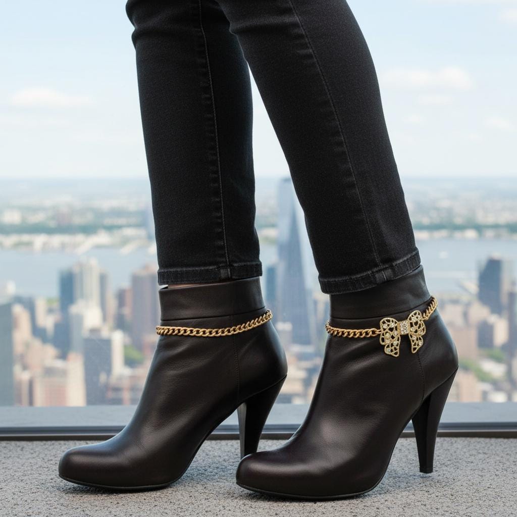 A lovely gift for someone who loves bows, gold accessories, and standout boot jewelry