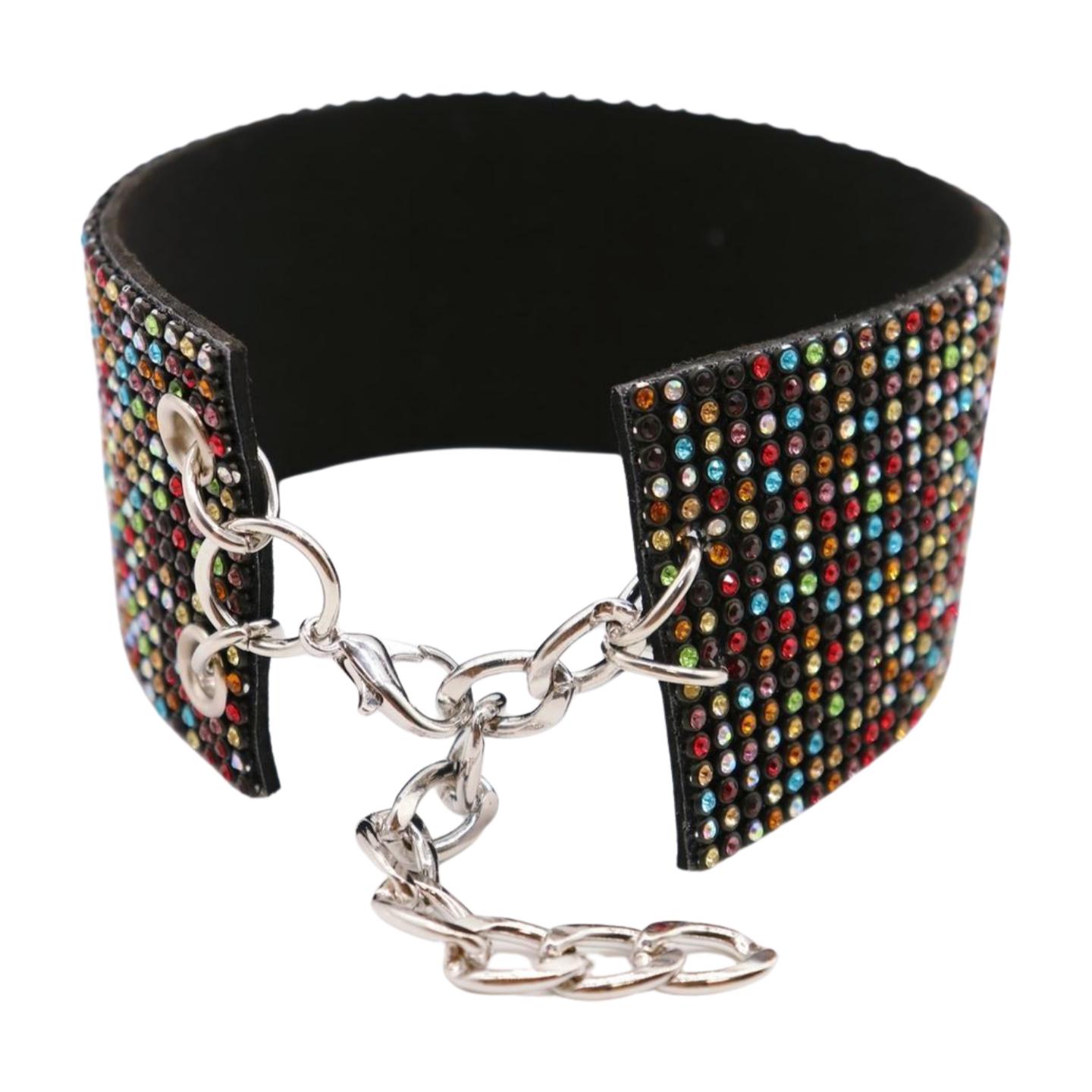 Color: Silver metal chains + black faux leather fabric + multicolor rhinestones