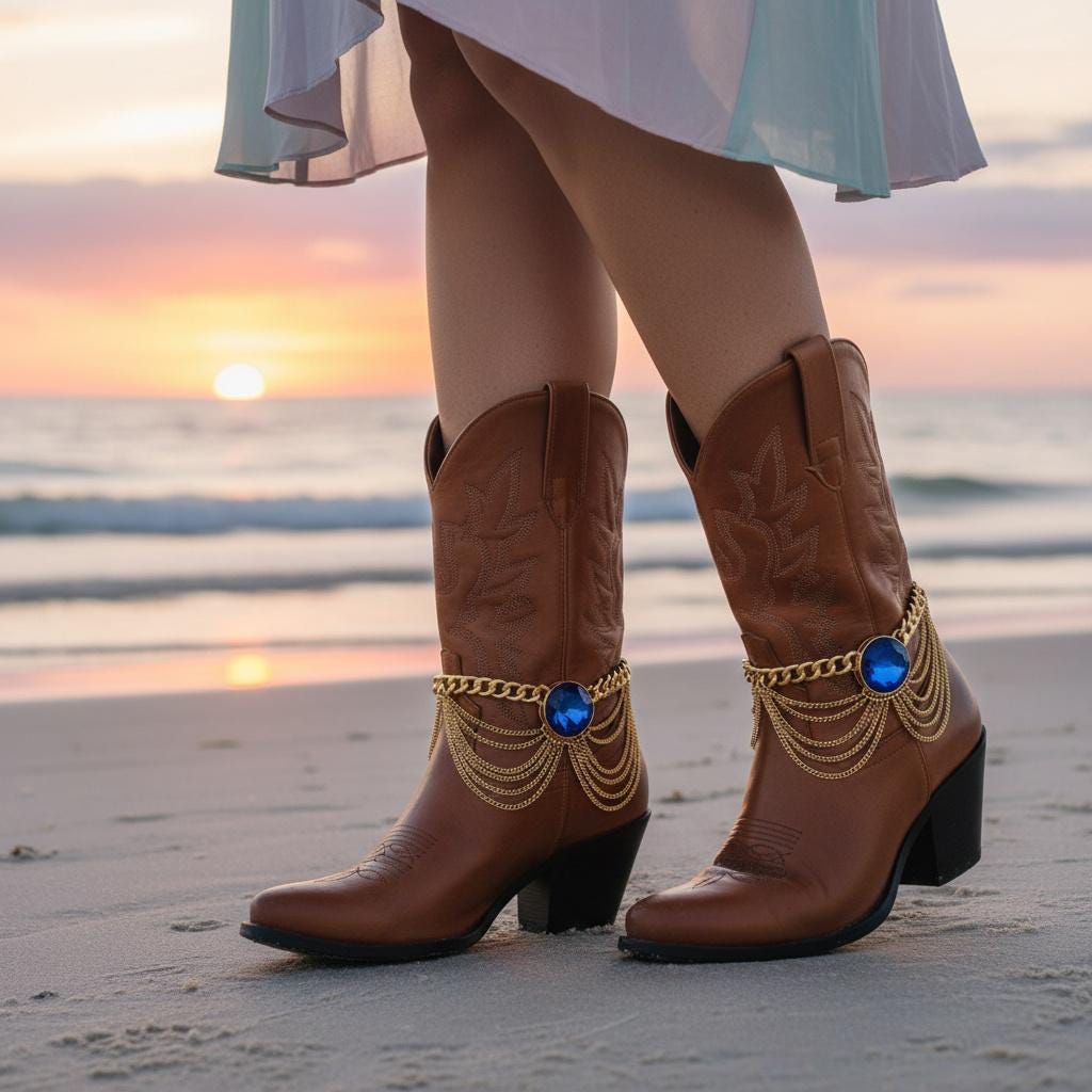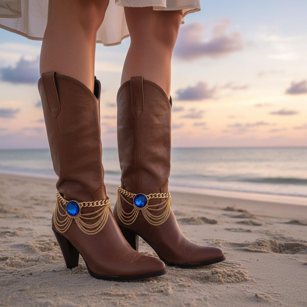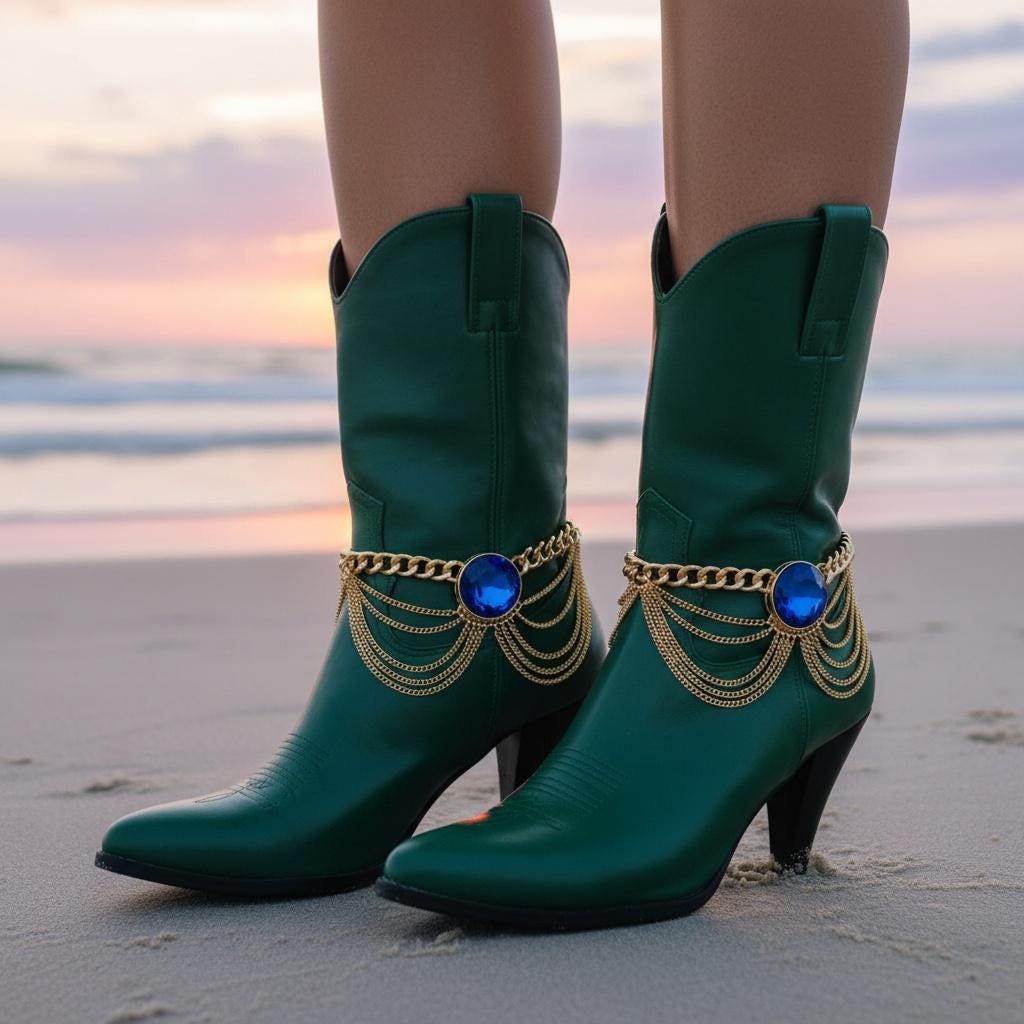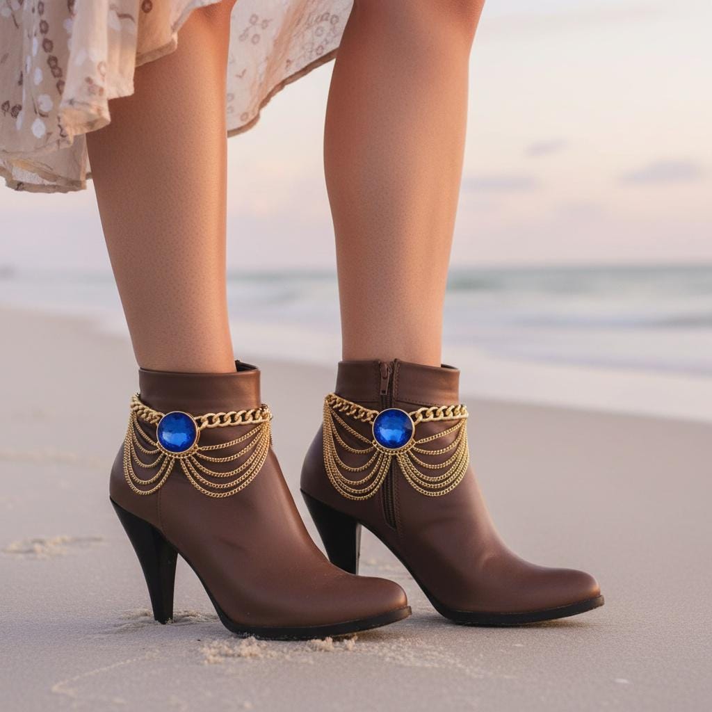 Meet your new “boots, but make it jewelry” moment. This pair of gold-tone boot chain bracelets was designed to turn any boot into a styled look in seconds—no straps, no fuss, just clip-on glam. The layered wave chains create that draped, swishy silhouette that looks amazing in motion, and the bold blue centerpiece is the kind of color-pop detail that makes outfits feel intentional.