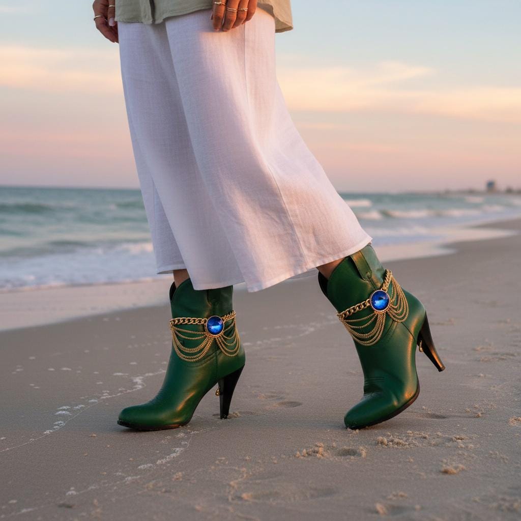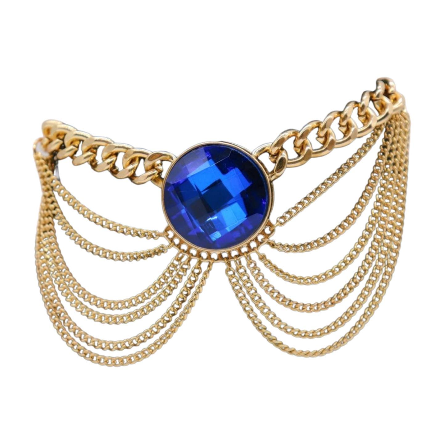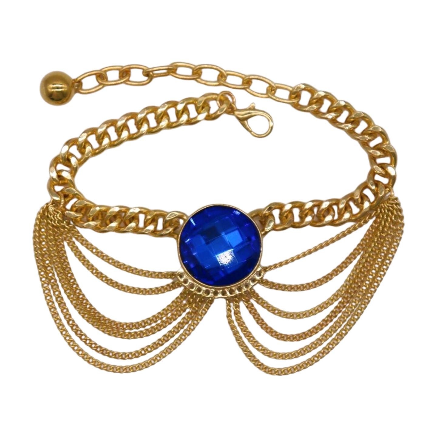 Meet your new “boots, but make it jewelry” moment. This pair of gold-tone boot chain bracelets was designed to turn any boot into a styled look in seconds—no straps, no fuss, just clip-on glam. The layered wave chains create that draped, swishy silhouette that looks amazing in motion, and the bold blue centerpiece is the kind of color-pop detail that makes outfits feel intentional.
