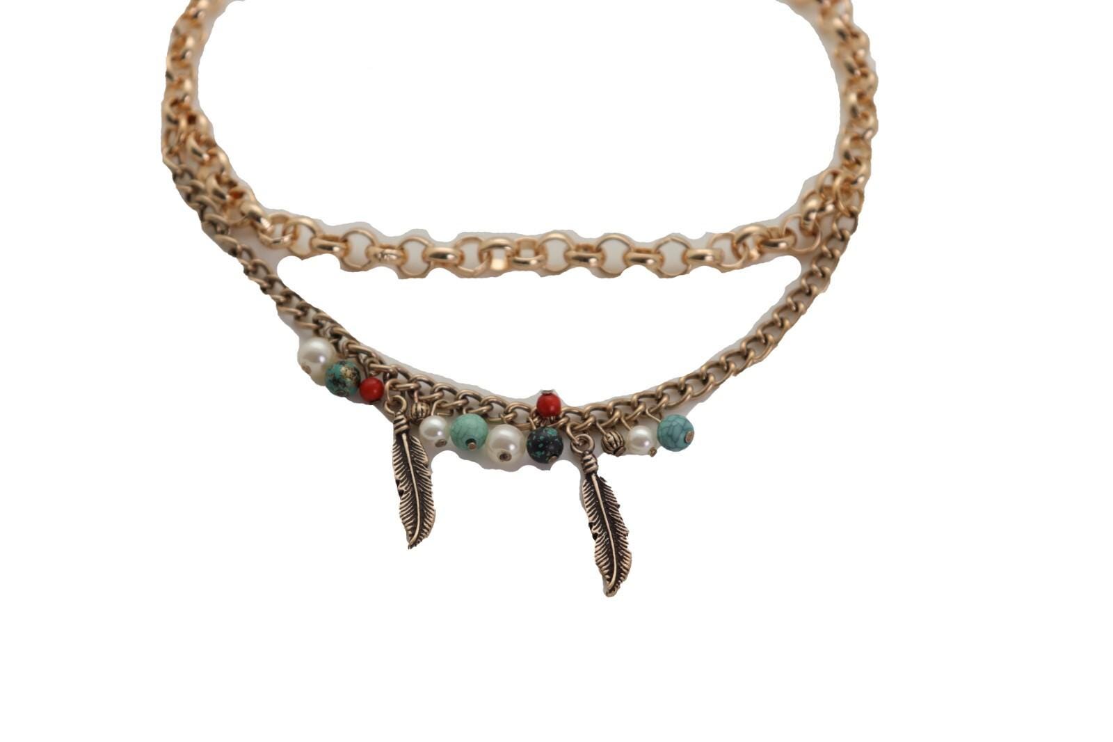 BC143 Is A Handmade-In-The-U.S.A. Boot Chain Bracelet Pair In Antique Rustic Gold Tone, Finished With Two Feather Charms And A Bead Mix (Turquoise, Cream, And Red) For That Southwestern, Boho Western Look.