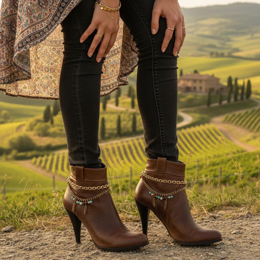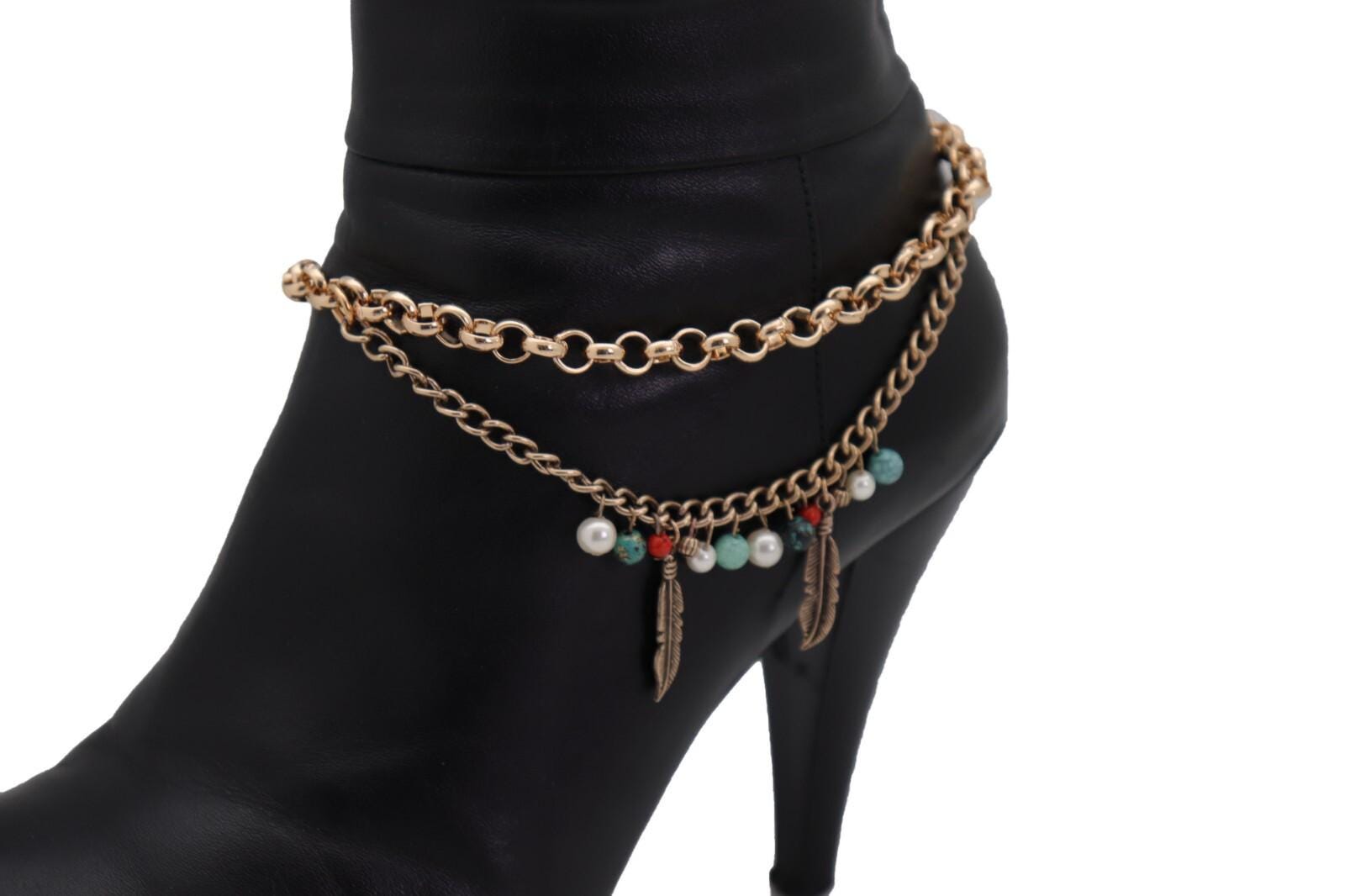 Antique Gold Boot Chains, Southwestern Feather & Turquoise, USA Handmade (Pair)
