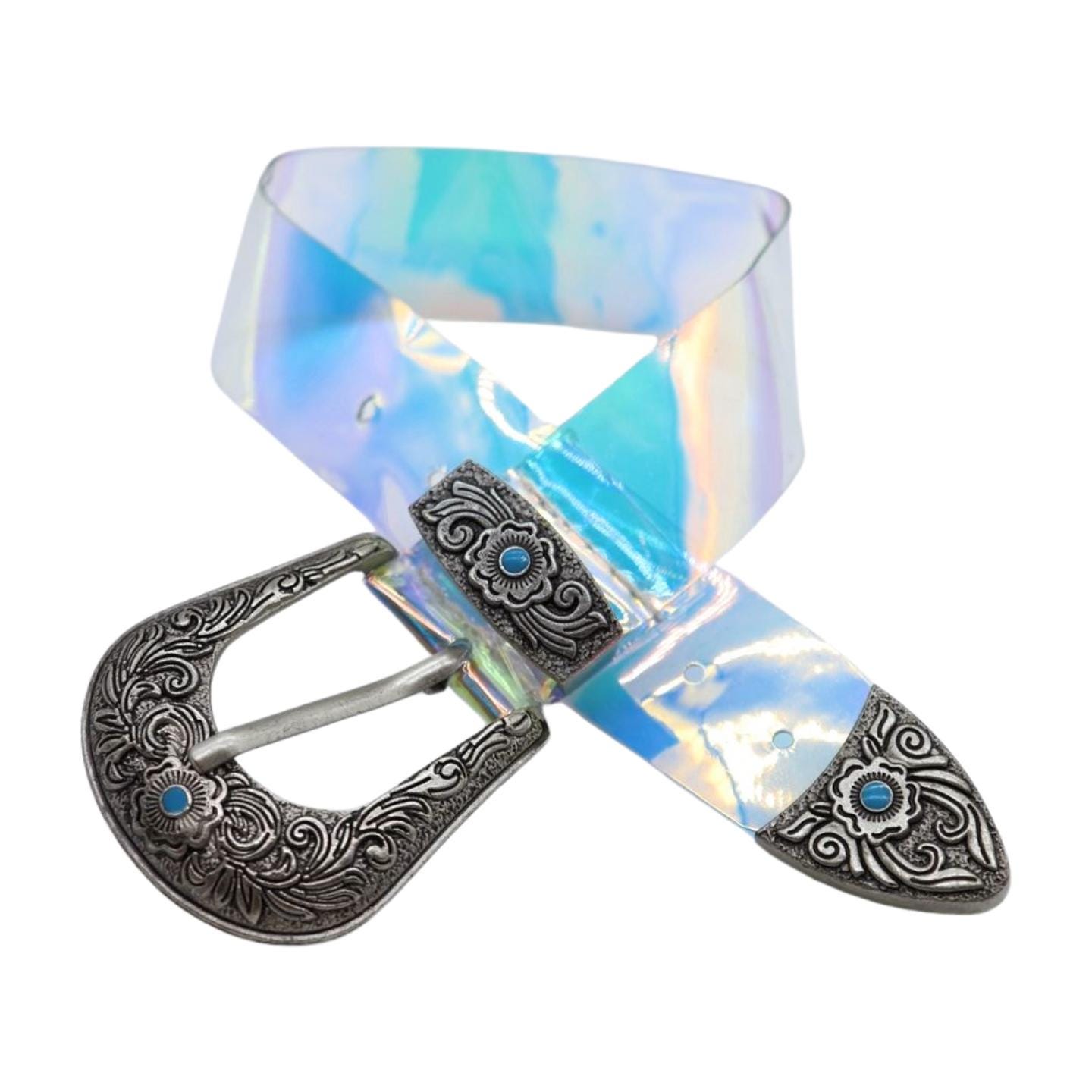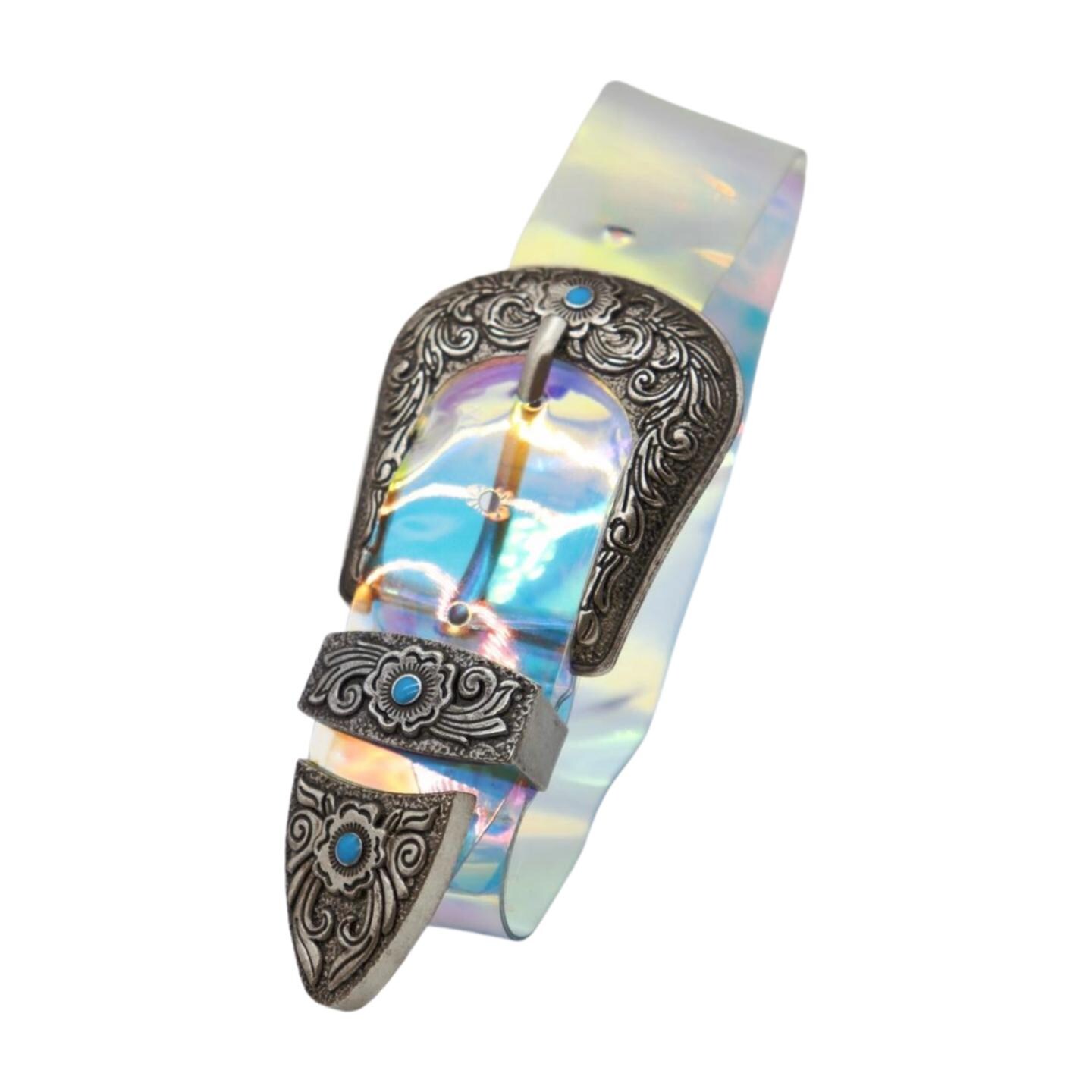 Silver Belt Buckle with Turquoise Detail: The intricate turquoise filigree adds a beautiful touch to the rugged silver buckle, making it a perfect Western bling accessory.