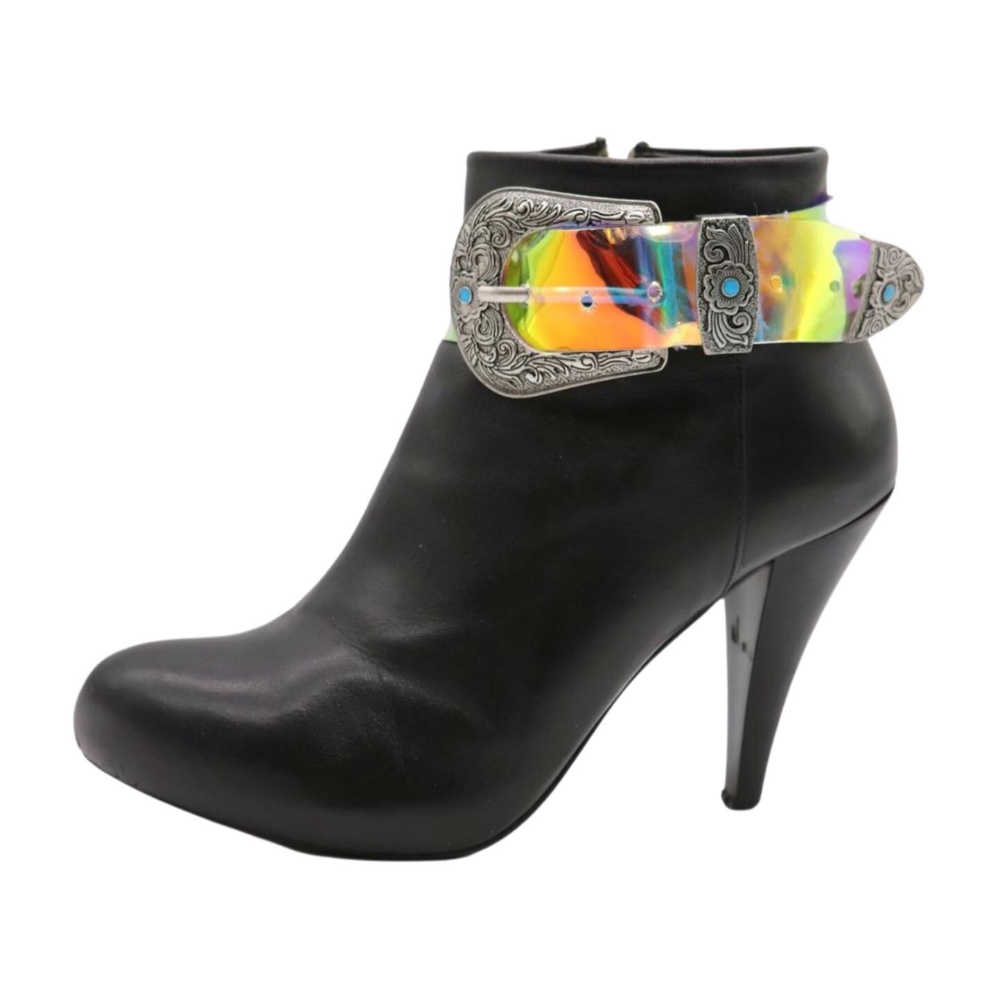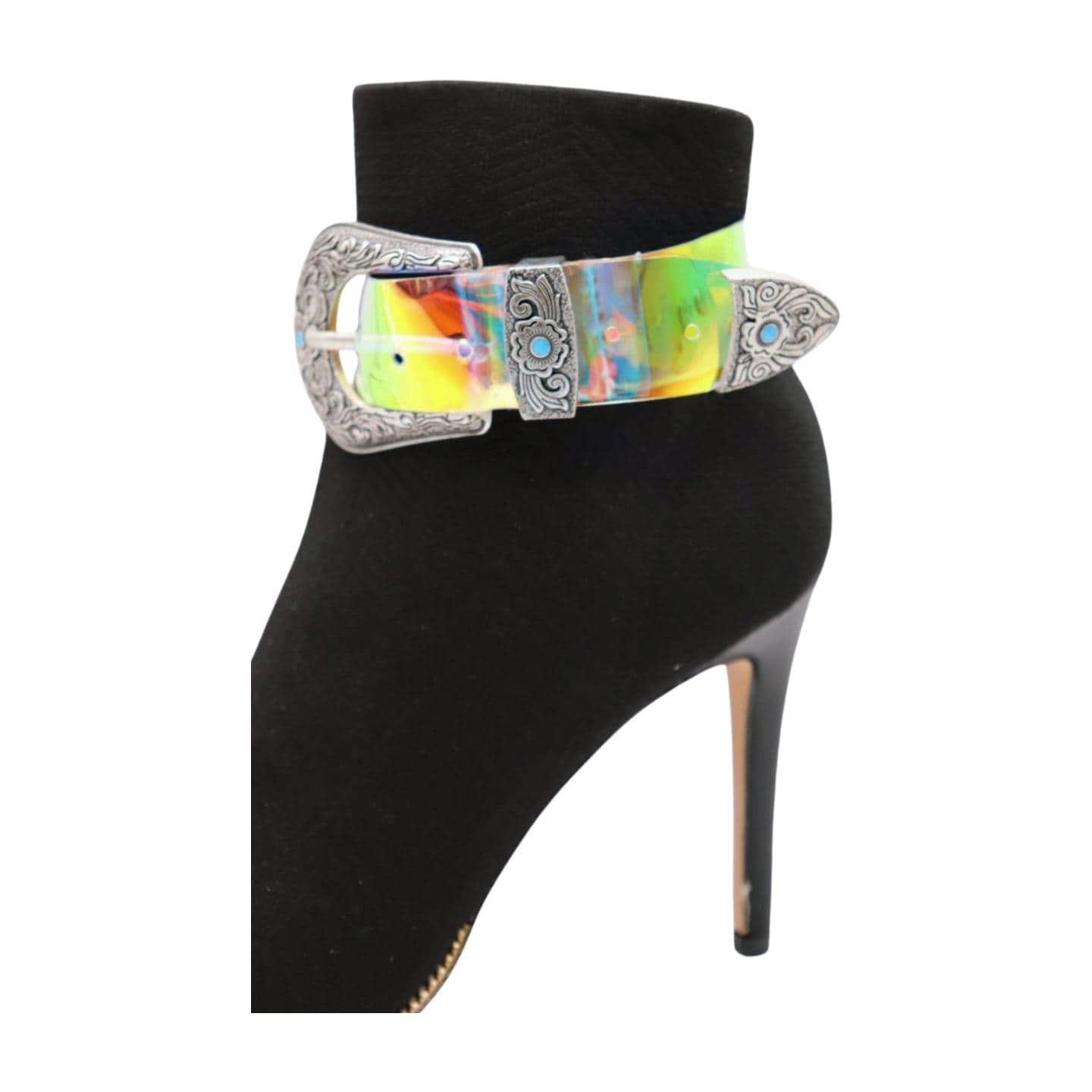 Embrace your inner cowgirl with this Western Boot Strap Bracelet, featuring a classic silver belt buckle with intricate turquoise dots and filigree detailing. Perfect for adding a Western-inspired twist to your boots or high heels, this bracelet is designed to make a statement at rodeos, country concerts, or everyday outings. Made with a metallic shine plastic band strap, it brings both style and durability to your favorite footwear.