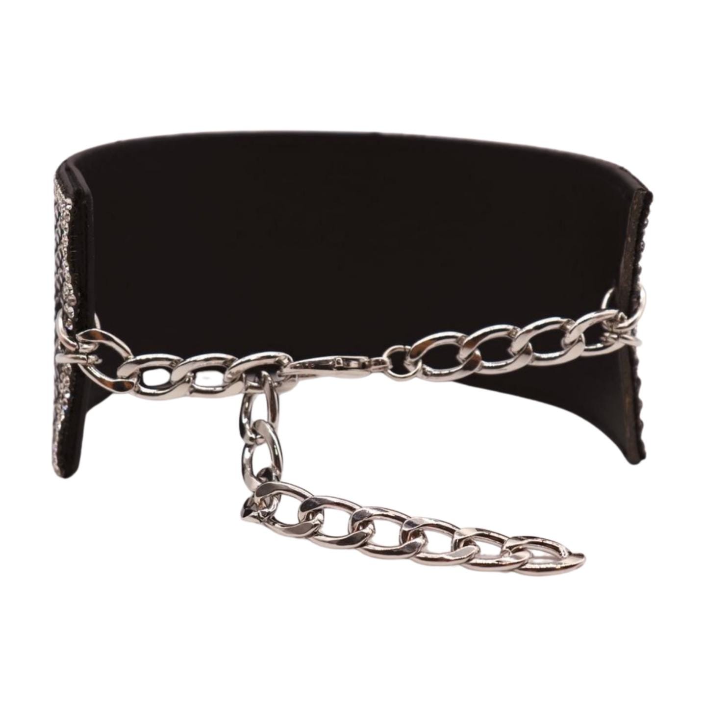 Color: Silver metal chain links + black faux leather band + silver rhinestones + black beads