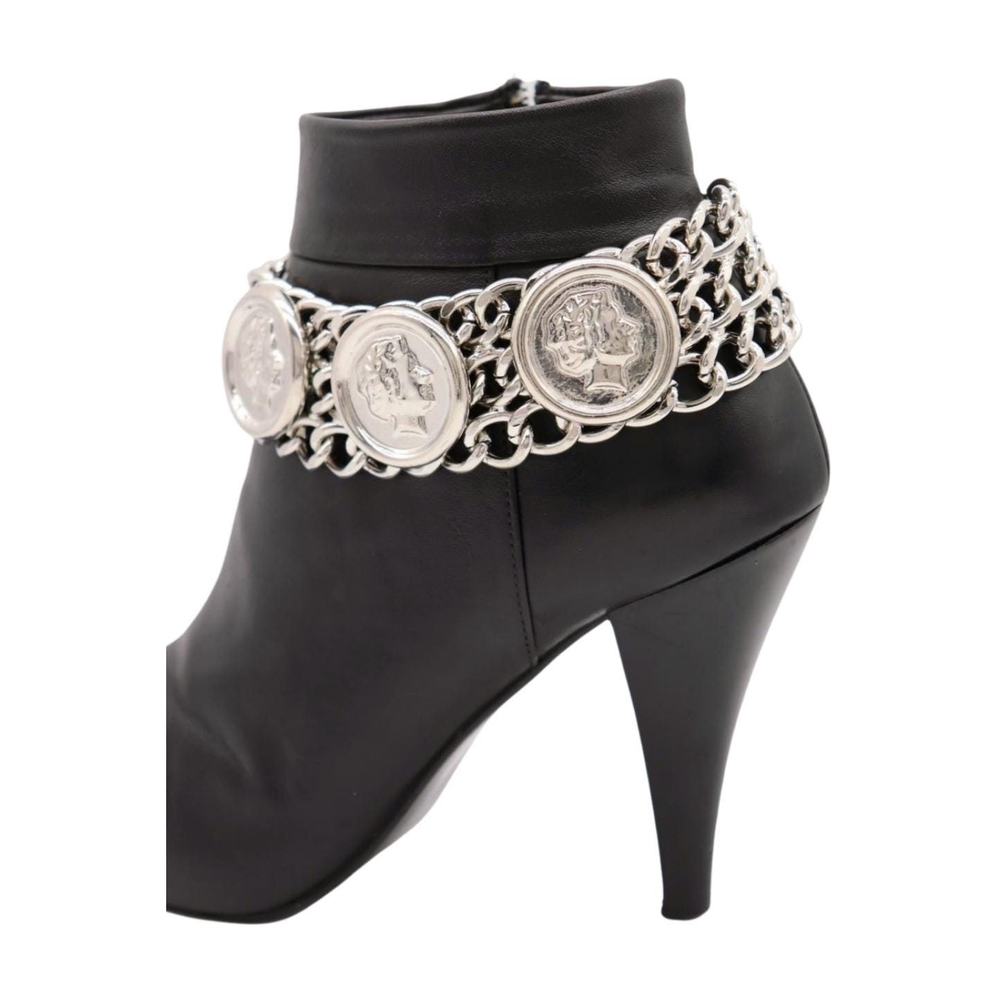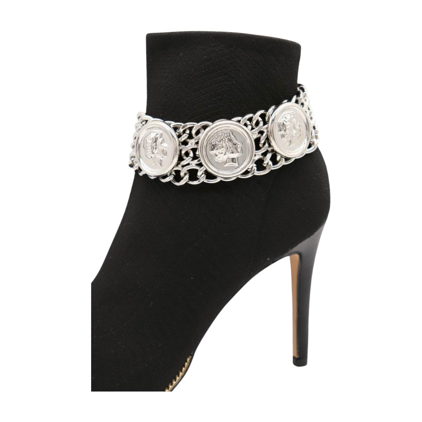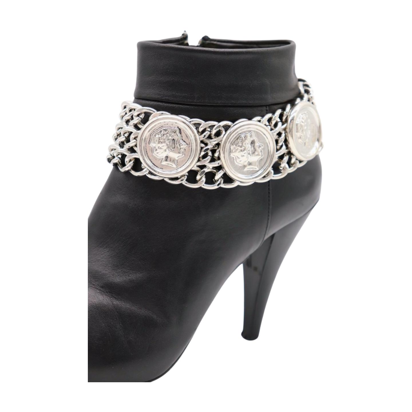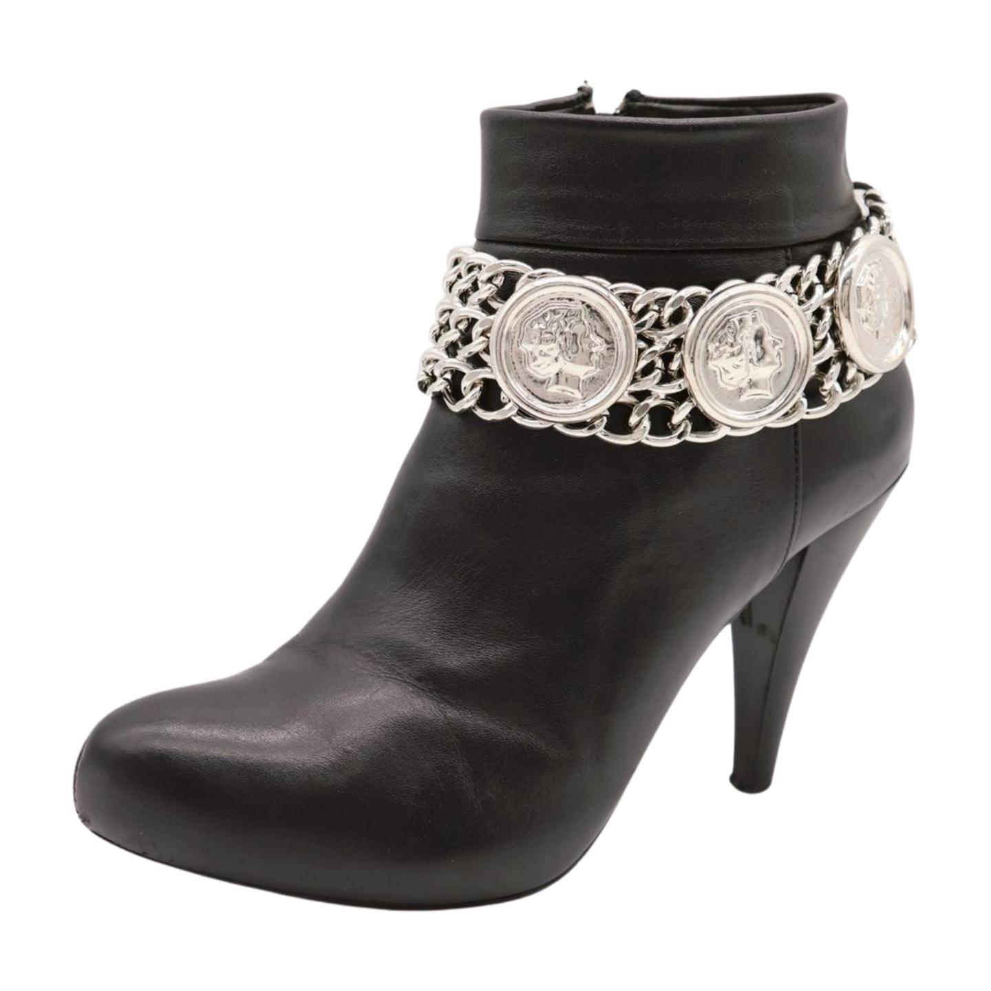 Women’s Silver Metal Boot Chain Bracelet with Coin Medallion and Charms – Bold Statement Anklet