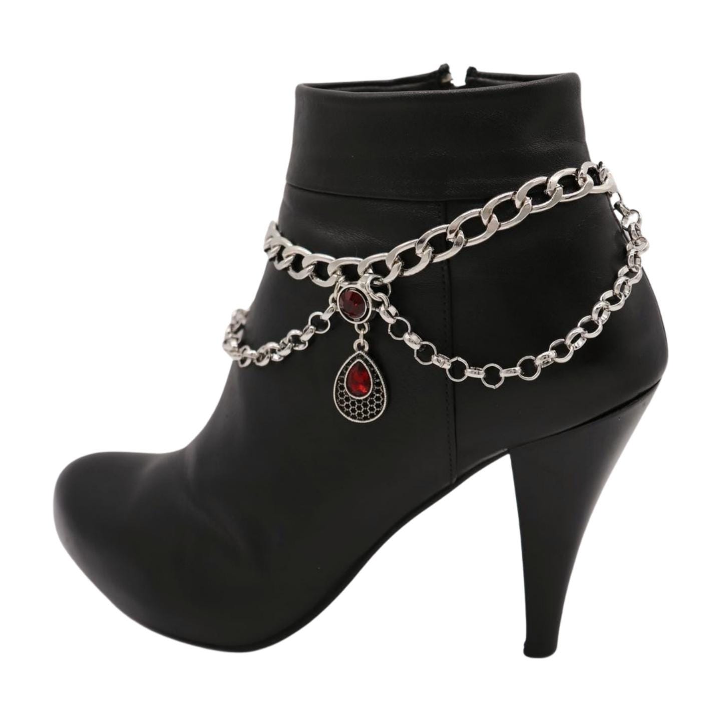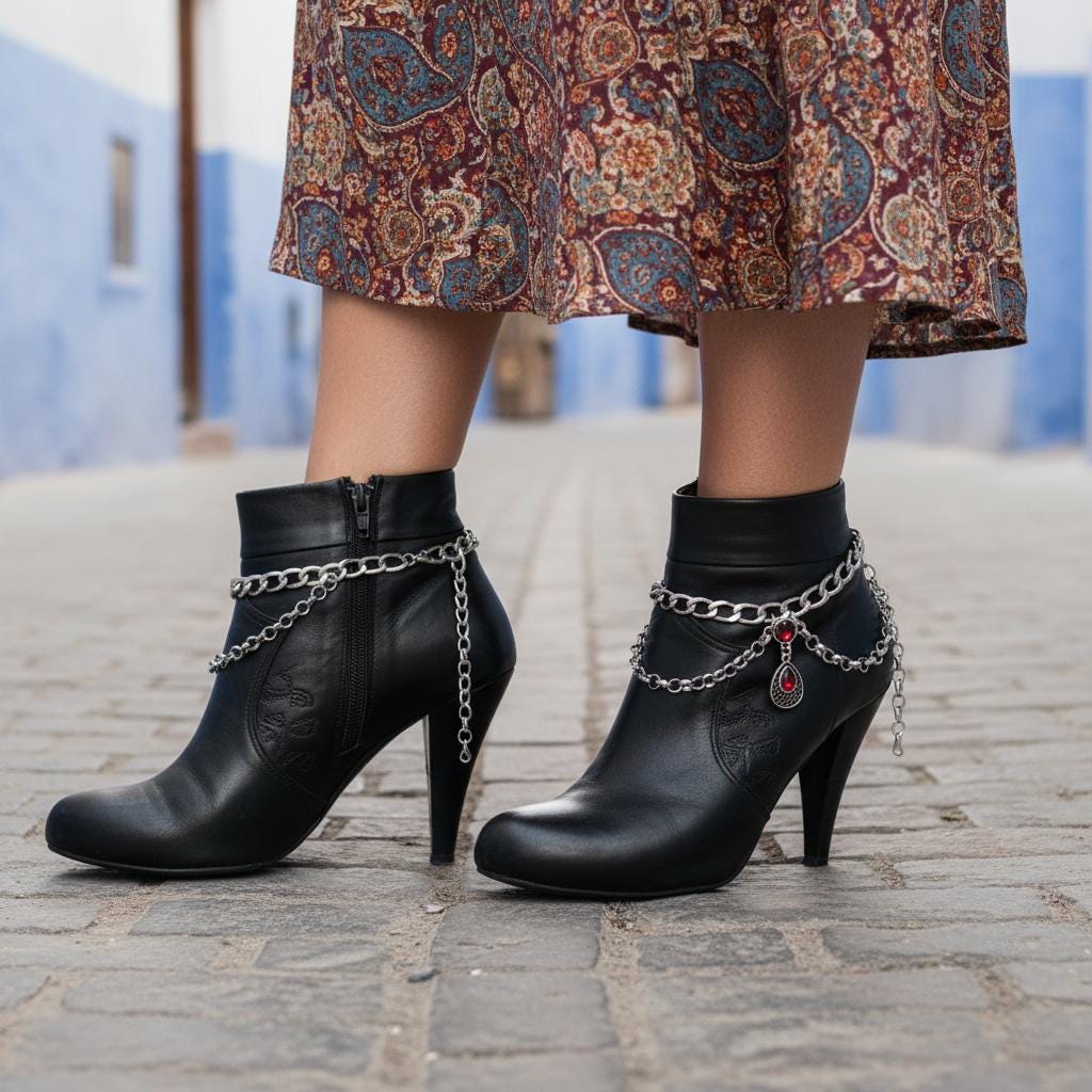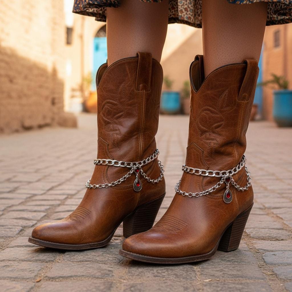Add a bold finishing touch to your boots with this handmade boot chain bracelet set. The bc174 design features silver-tone chain links with a layered wave drape and a vintage-inspired red drop charm that creates a clean statement at the ankle. It’s made to style ankle boots, cowboy boots, and riding boots for day-to-night outfits, Western nights out, and festival looks.