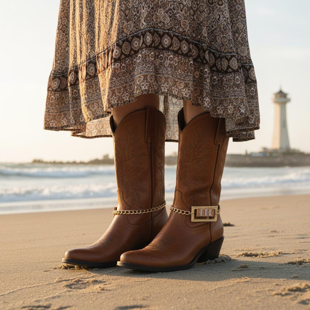 Meet your boots’ new favorite plus-one: a gold-tone boot chain bracelet pair featuring a geometric rectangular bling charm with rose-tone accents and clear rhinestone sparkle. This set is made for the days you want your outfit to look styled on purpose—without doing the most.