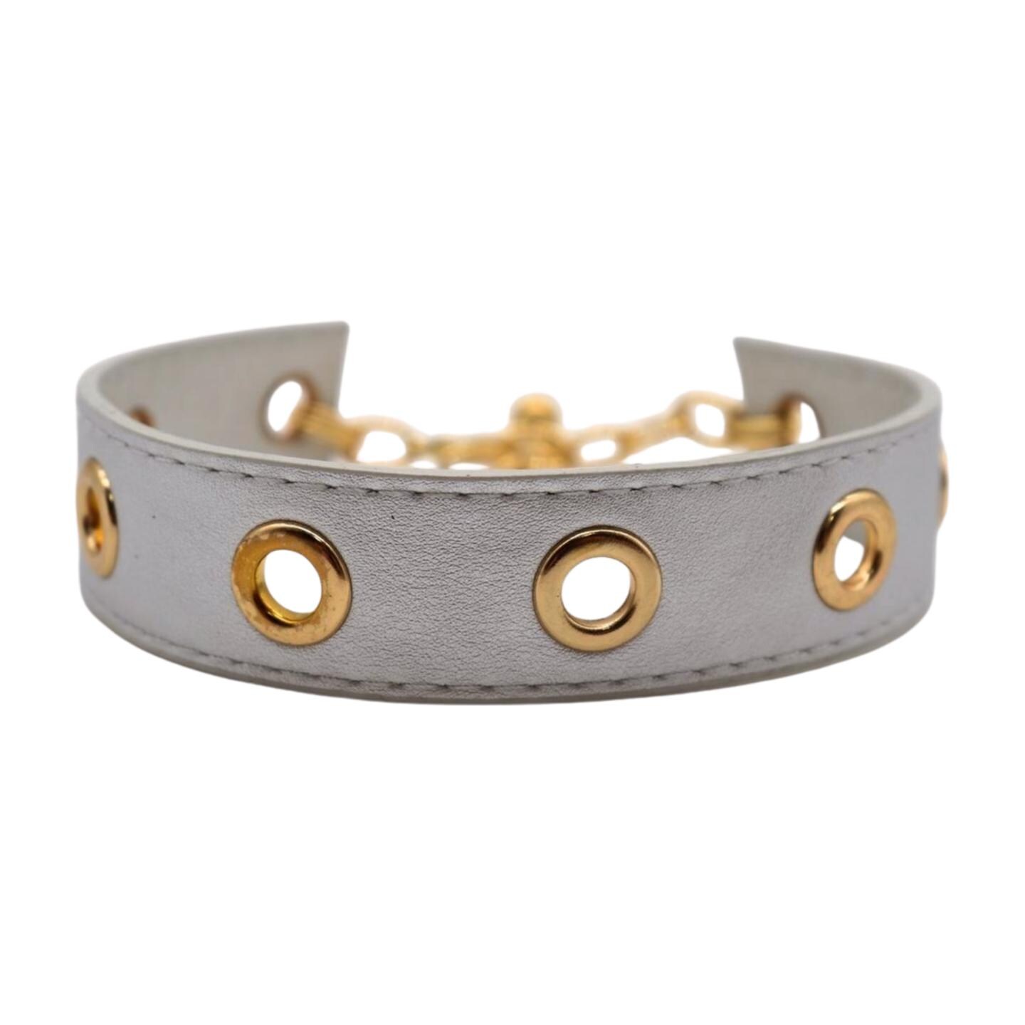Color: Gold metal chain links and hardware + silver faux leather band
