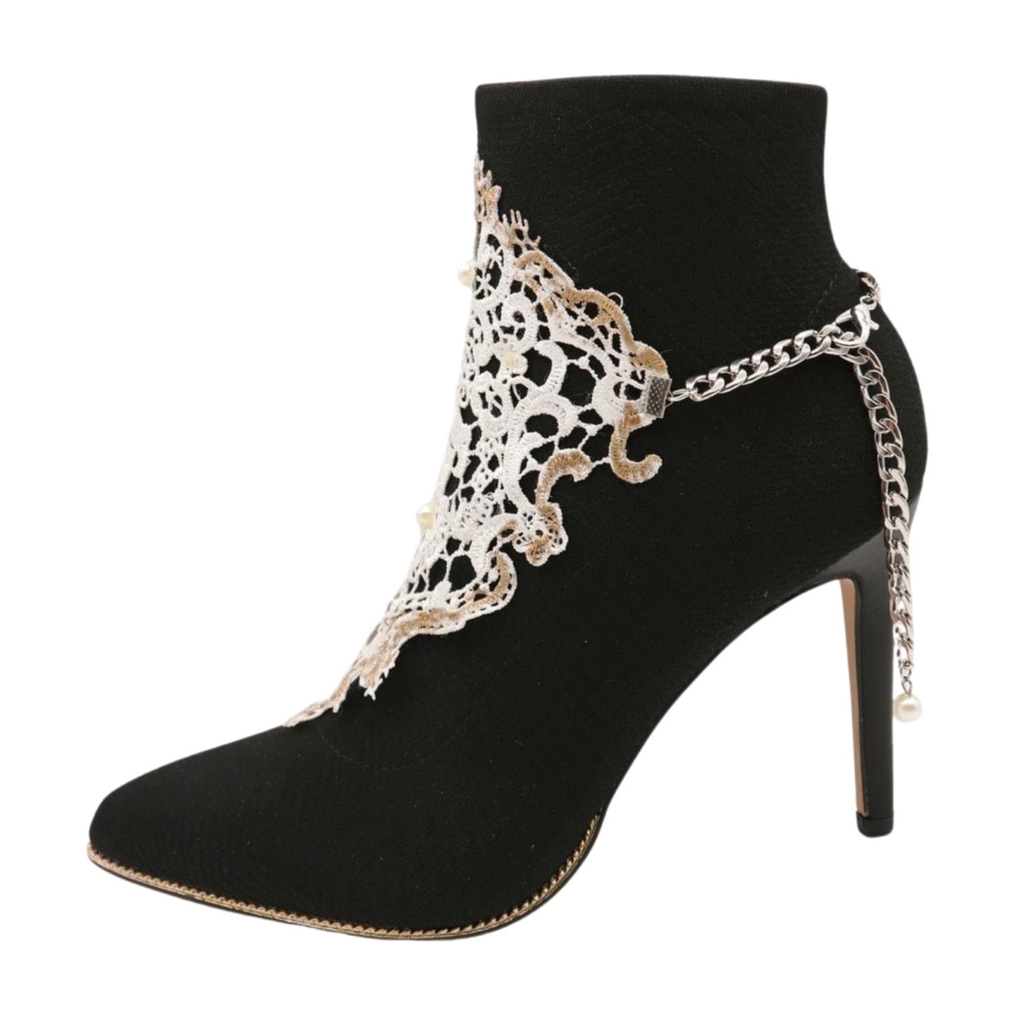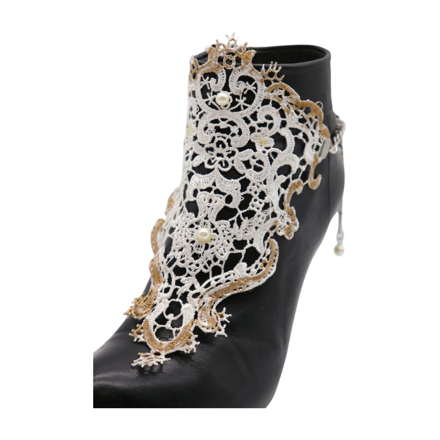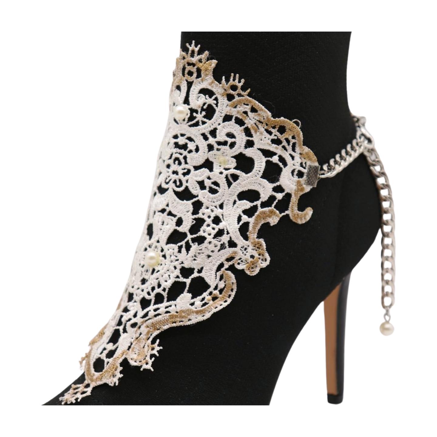 This White Lace and Pearl Boot Chain Bracelet is a must-have for those looking to add a unique, chic accessory to their footwear collection.