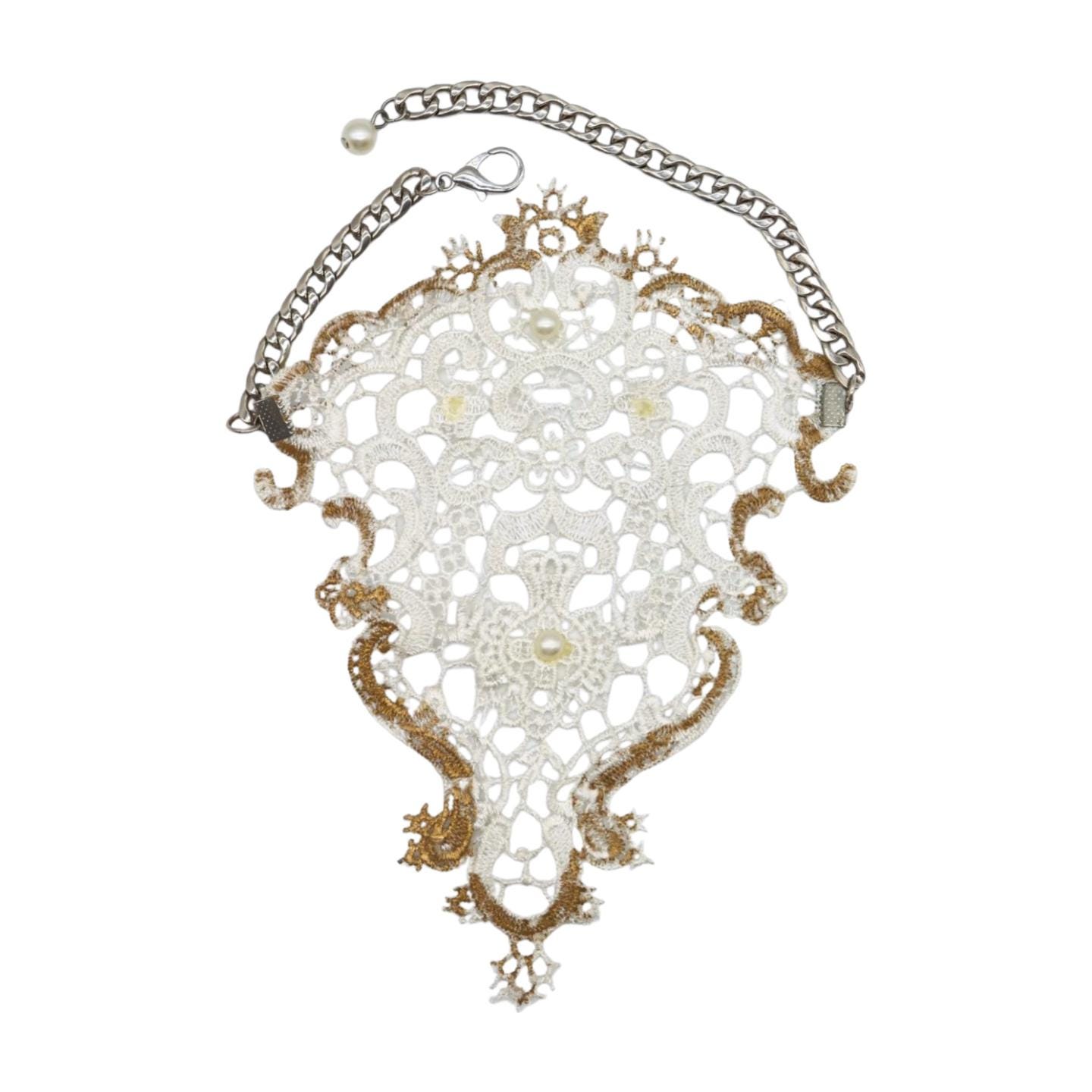 Color: Silver metal chain links + white lace fabric + cream imitation pearl beads