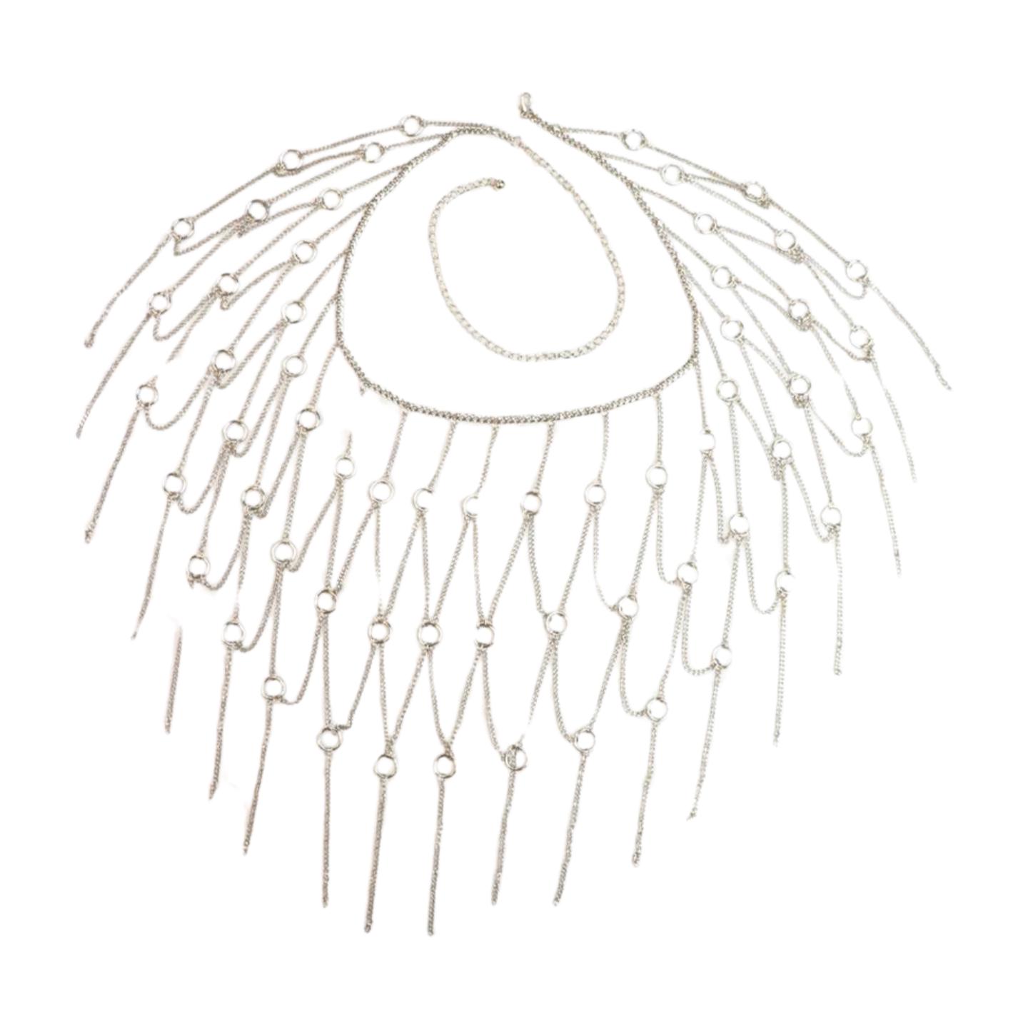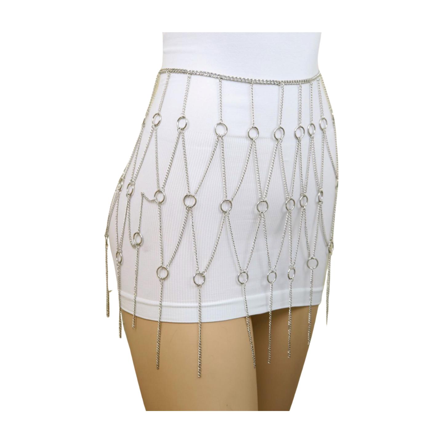 Turn heads and make a bold entrance with this ultra-stylish women's chain skirt belt featuring silver-tone metal links, long hanging tassel fringe, and geometric circle ring charms. This adjustable fashion piece is the perfect blend of edgy, sexy, and elegant—ideal for layering over a fitted dress, bodysuit, swimsuit, or leggings.