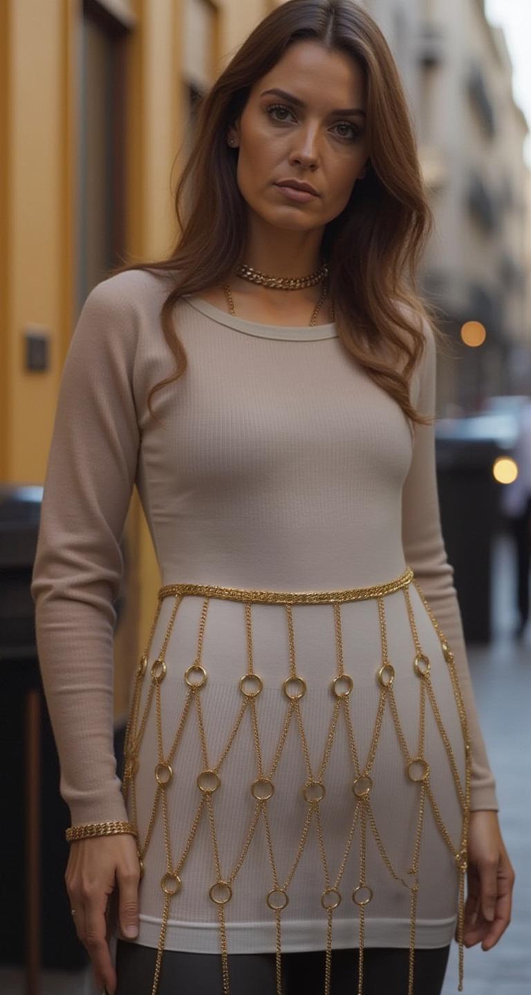 Golden Glamour: Shimmering gold chains sway with every step, adding drama and allure.