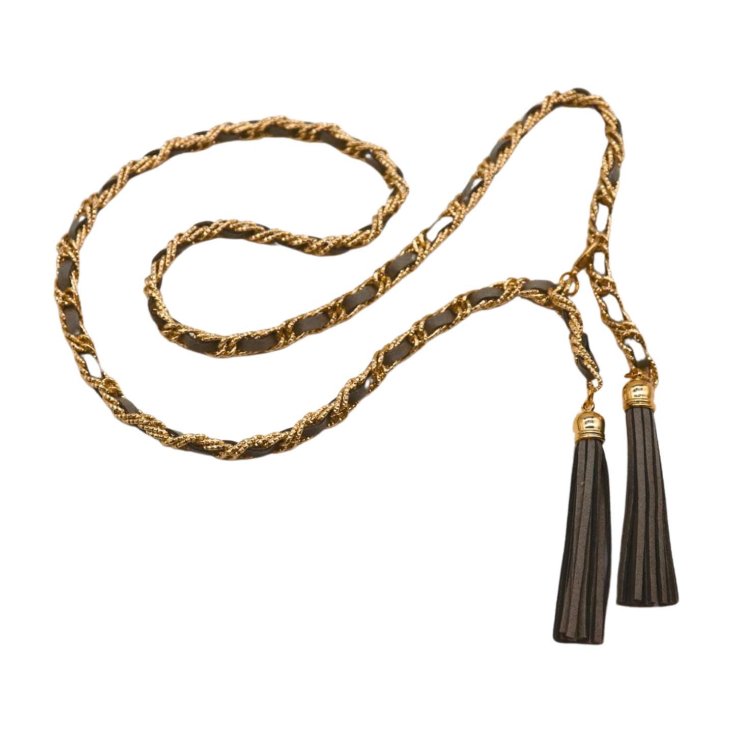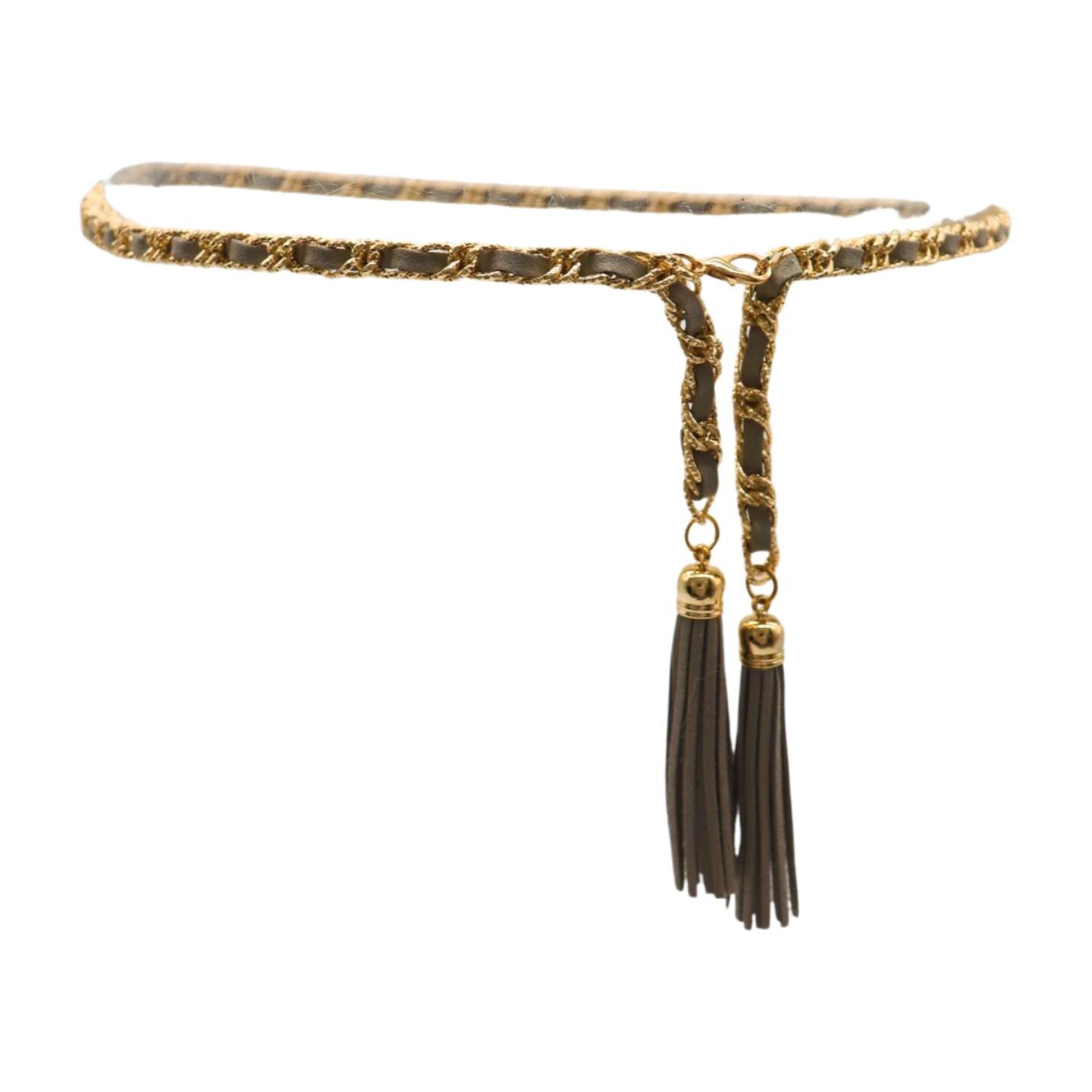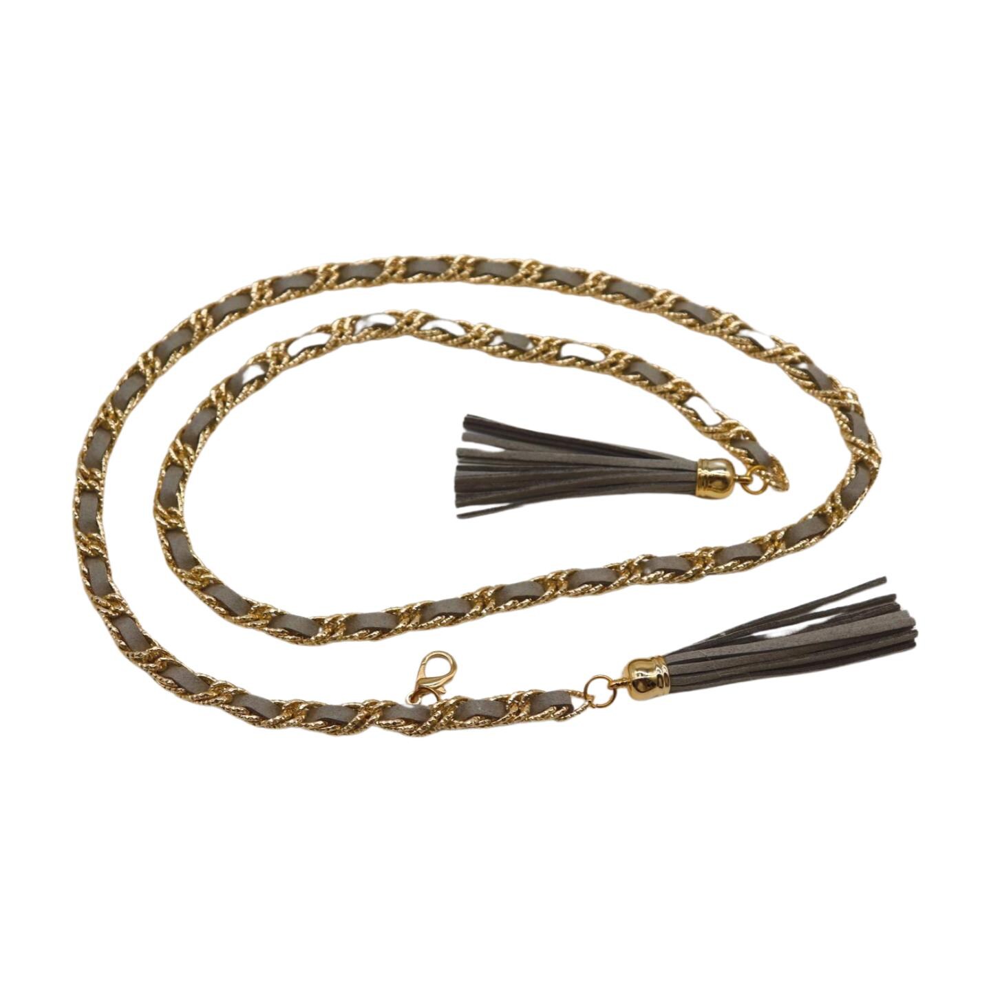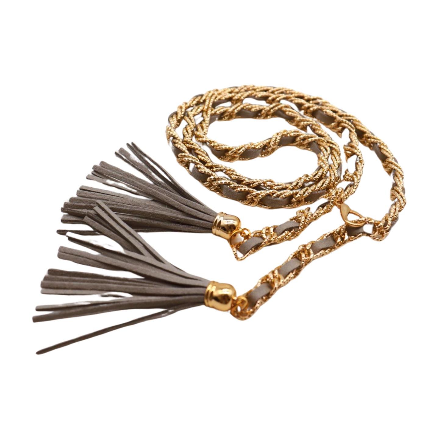 Elevate your look instantly with this chic women's gold chain wrap belt, designed with sleek gray faux leather and elegant long tassel details. This fashion-forward belt features a lightweight yet bold gold-tone chain, braided through a faux leather band, and finished with long, stylish tassel drops that swing with every step – creating the ultimate boho-chic-meets-luxury-celebrity statement.