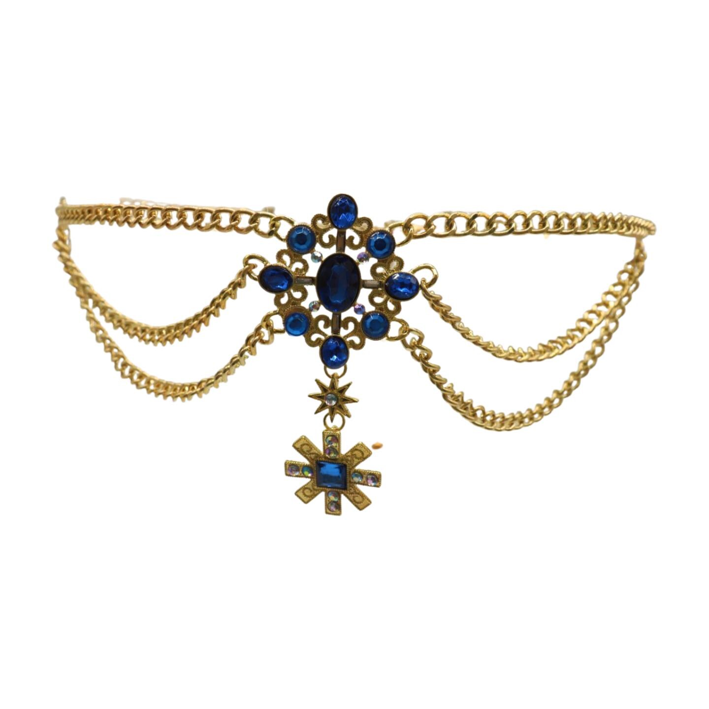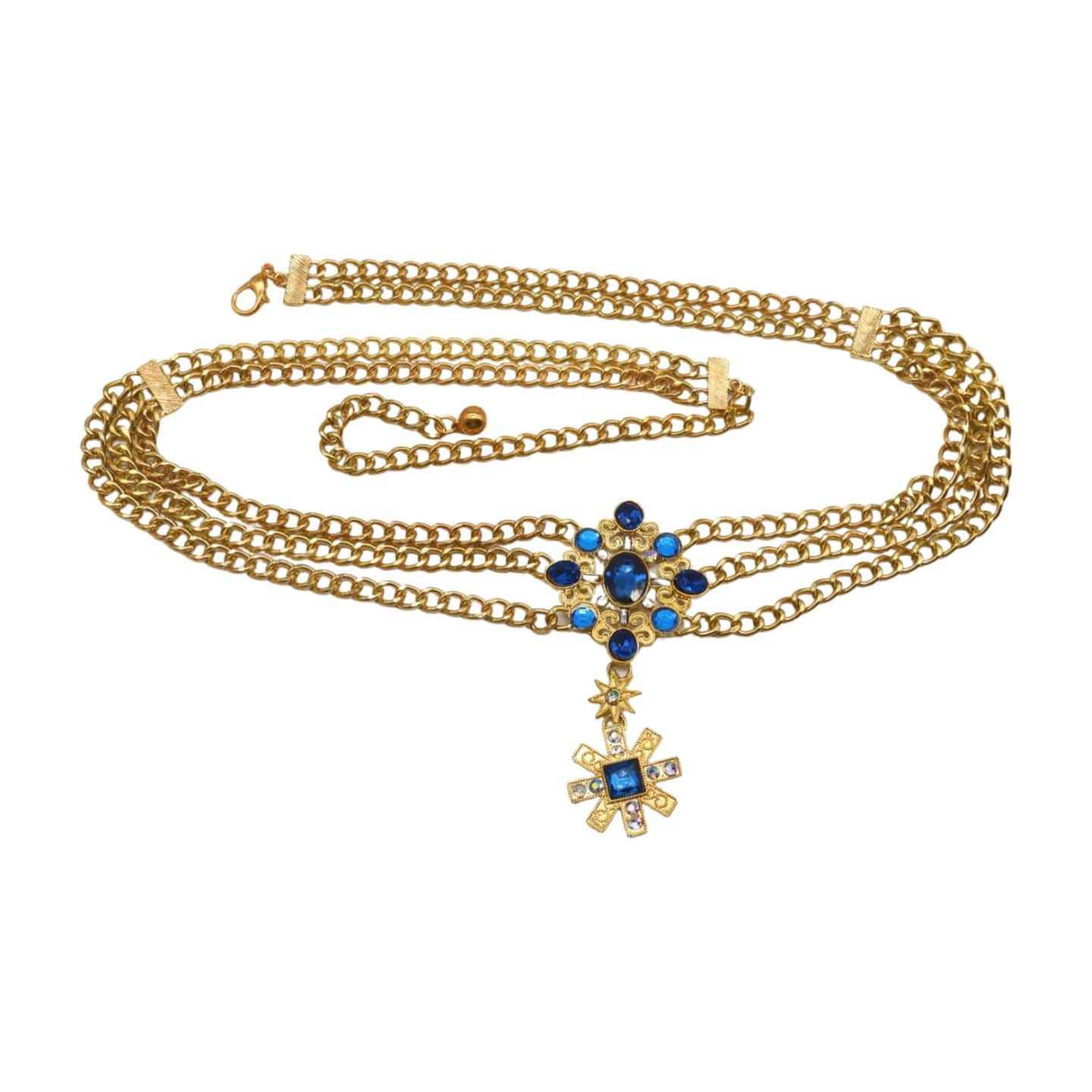 This belt combines fashion-forward design with timeless cultural elegance. Three cascading rows of antique gold-plated metal chains frame your waist, centered by an intricate floral medallion adorned with sparkling blue rhinestones. Hanging gracefully below is a stunning cross pendant with matching stones and shimmering silver crystal accents, capturing attention and adding movement to your silhouette.
