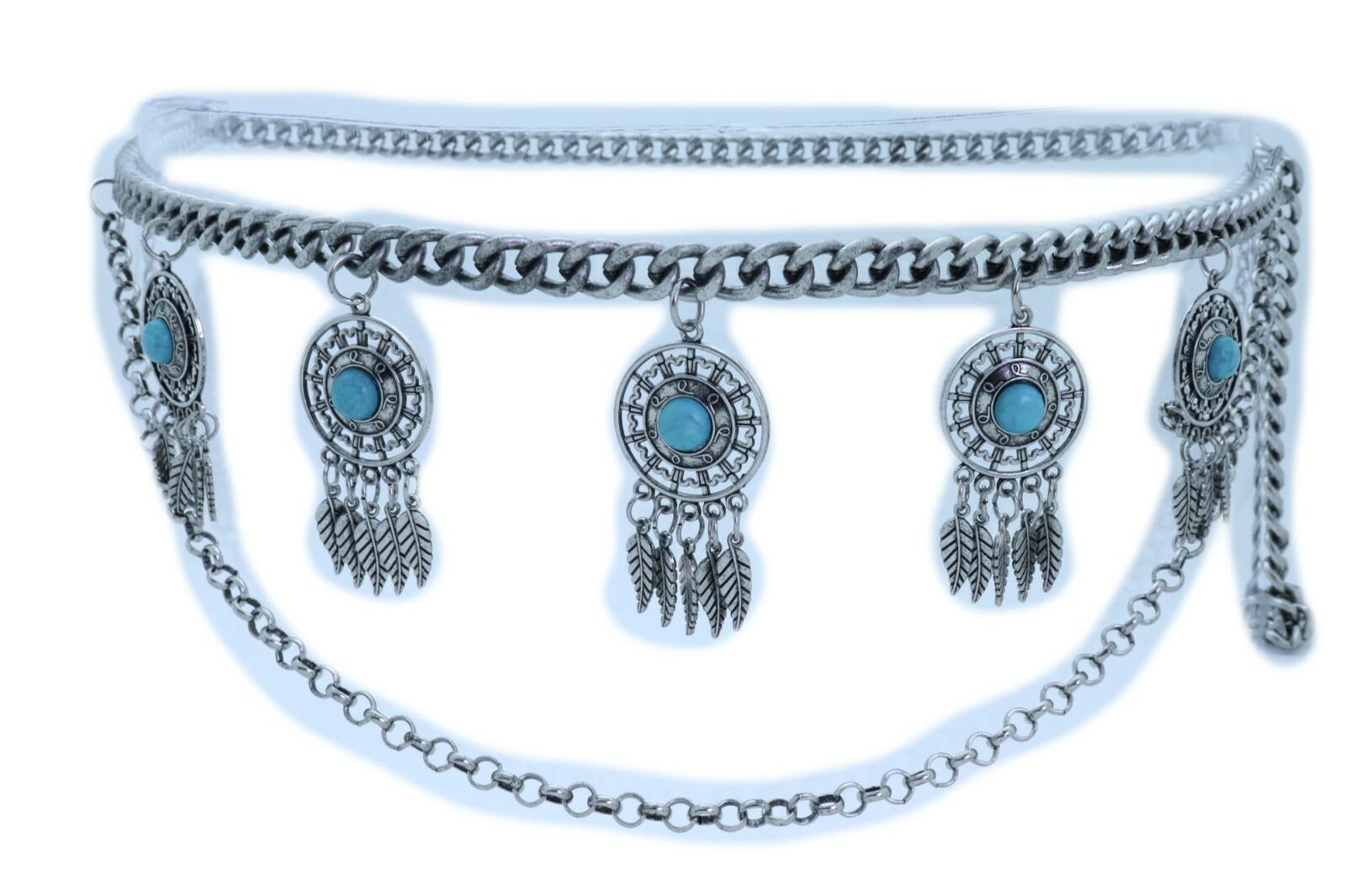 Step into the spotlight with this stunning boho-chic silver chain belt! Featuring dream catcher-style charms, vintage silver feathers, and turquoise blue beads, this piece captures the soul of Native American and Southwestern fashion with a modern, edgy twist. Whether you're rocking it at a music festival, casual brunch, night party, or beach event – this belt brings out your wild, free-spirited energy.