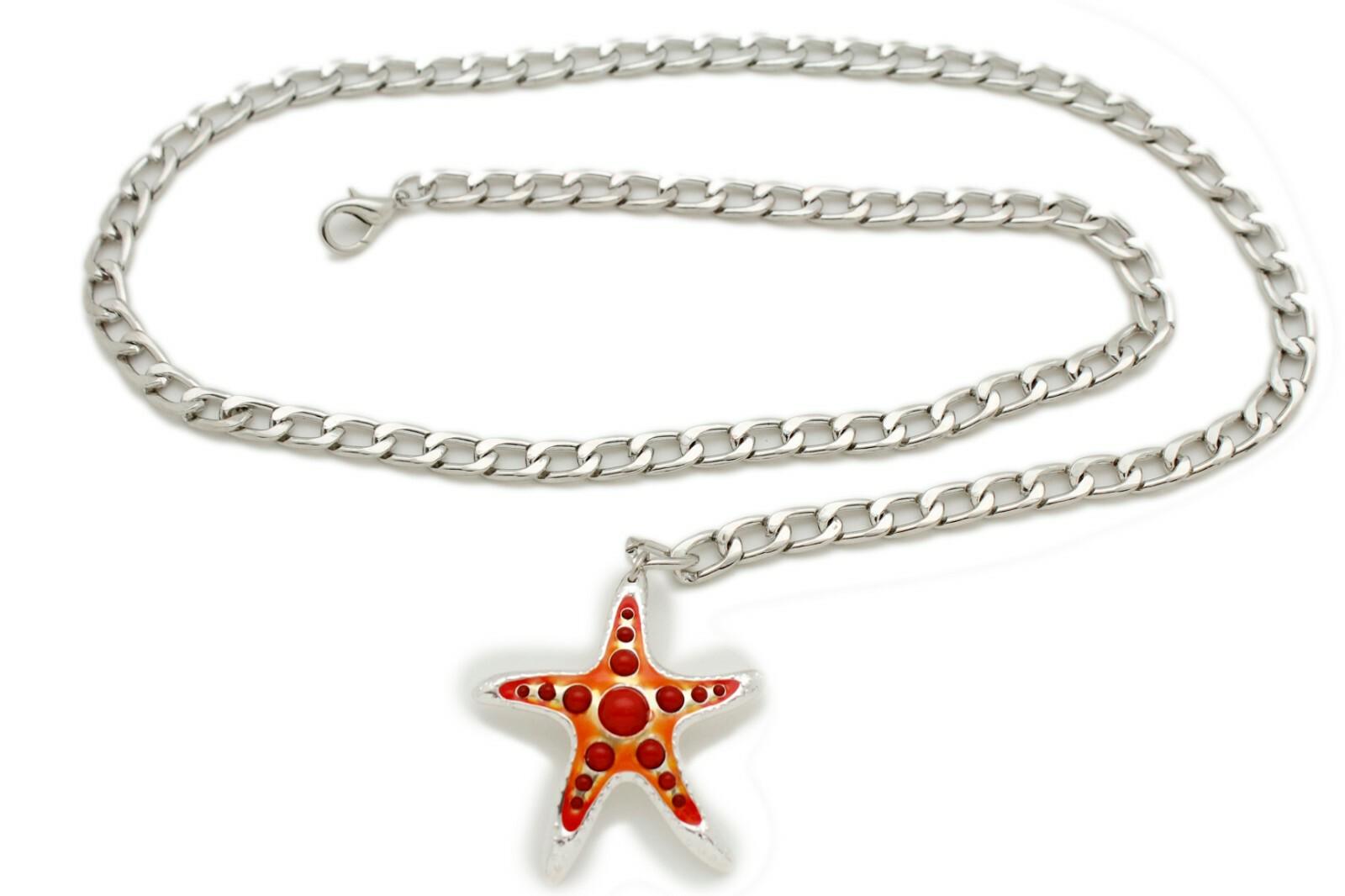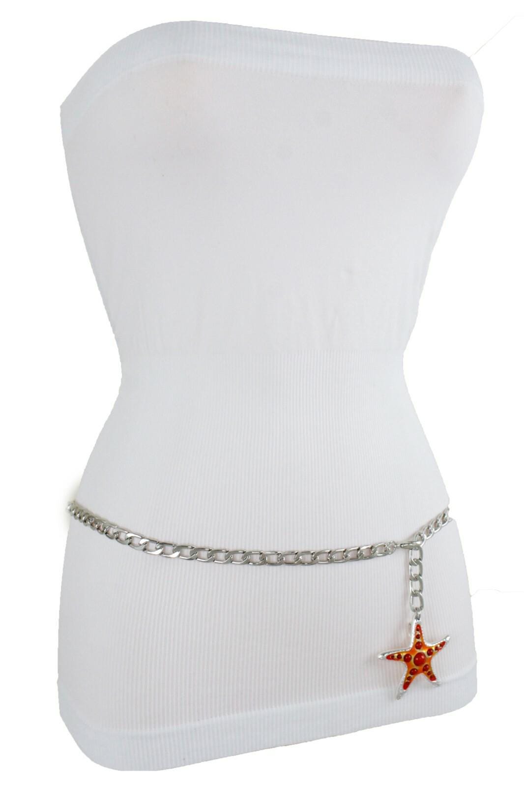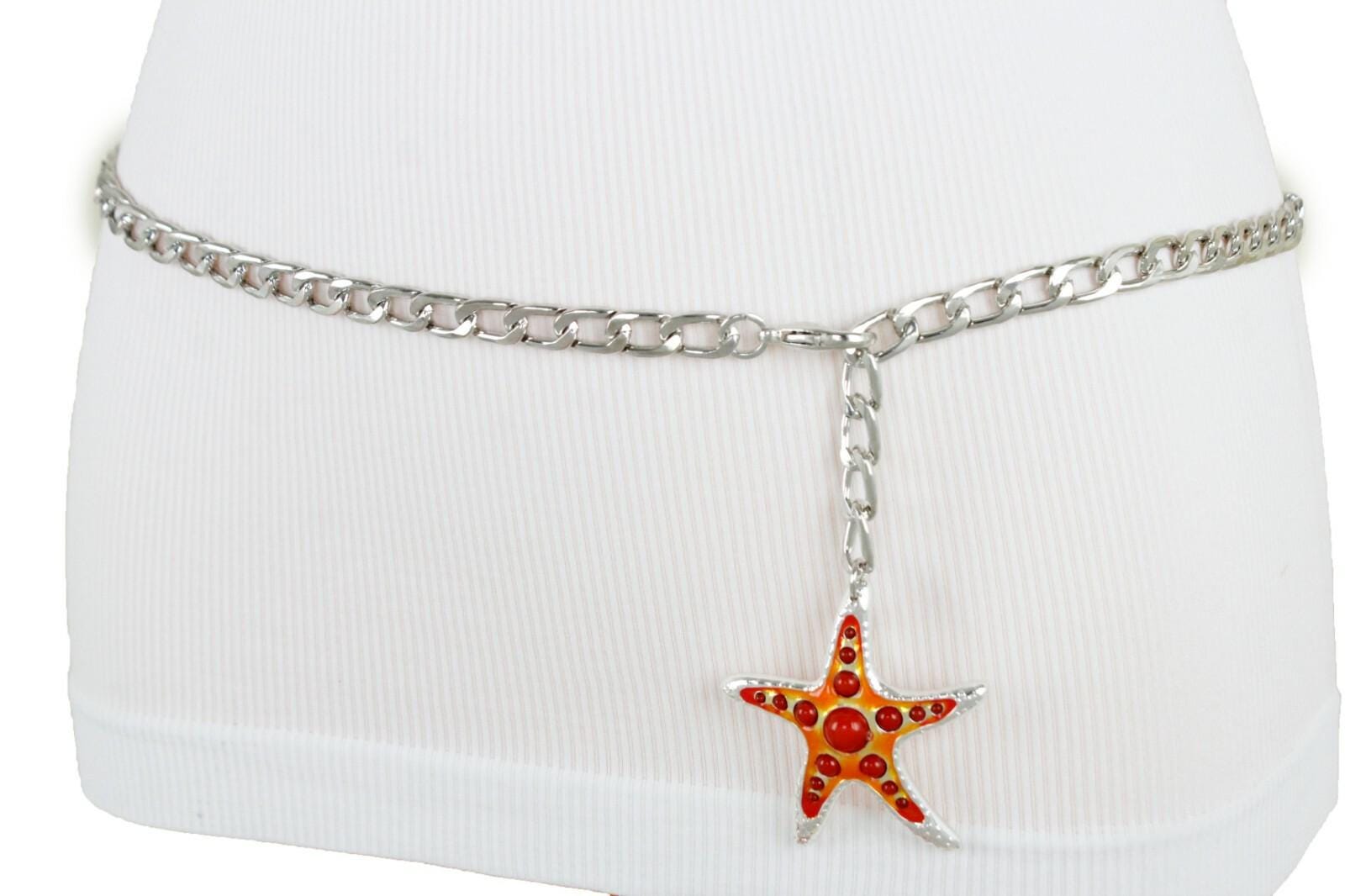 Silver Chain Waist Belt: Orange-Red Starfish Charm, Adjustable Beach Jewelry