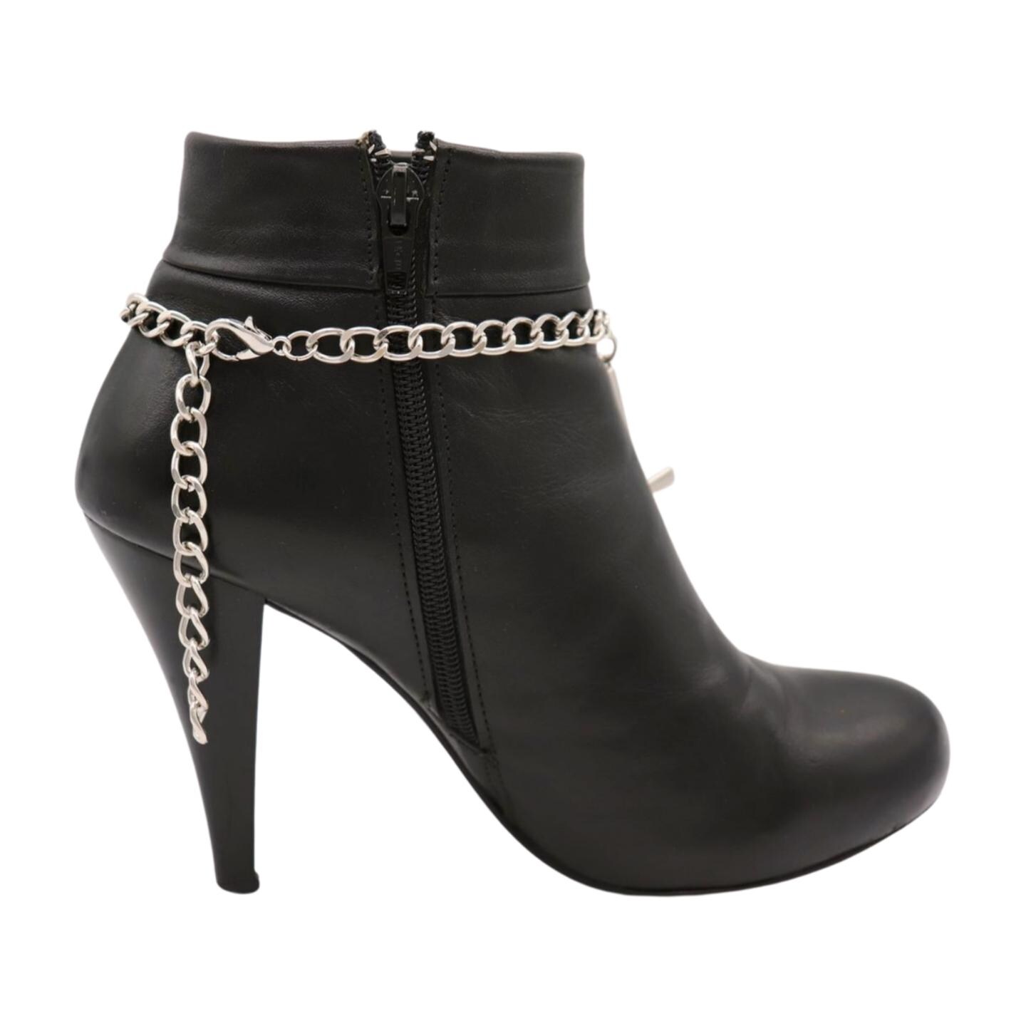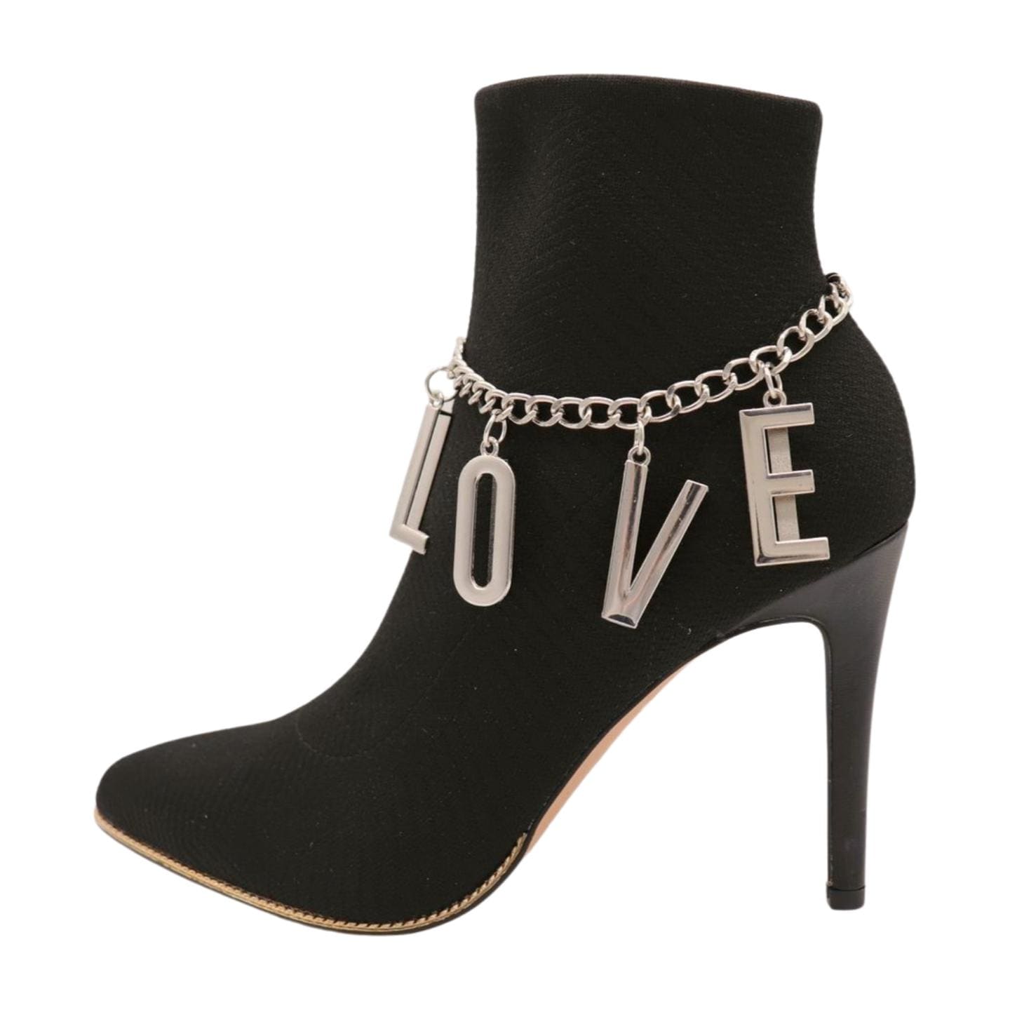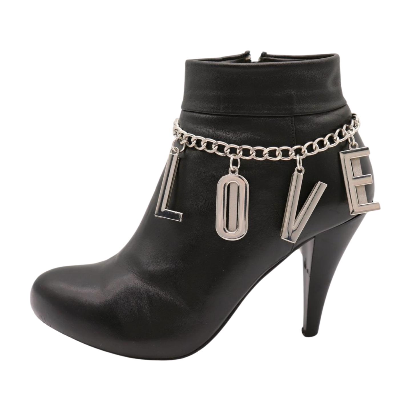 LOVE Boot Chain Anklet Bracelet Set – Silver Metal Shoe Charm Jewelry – Western Cowgirl Biker Style – Adjustable Boot Straps for Ankle or Heel Boots – 1 Pair – Women’s Fashion Accessories