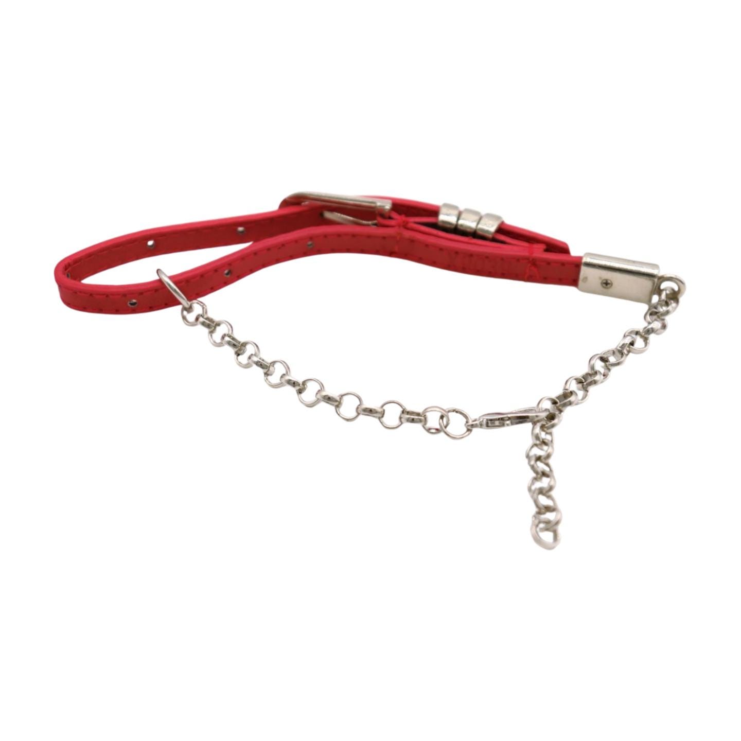 Color: Silver metal chain links and buckle + red faux leather band