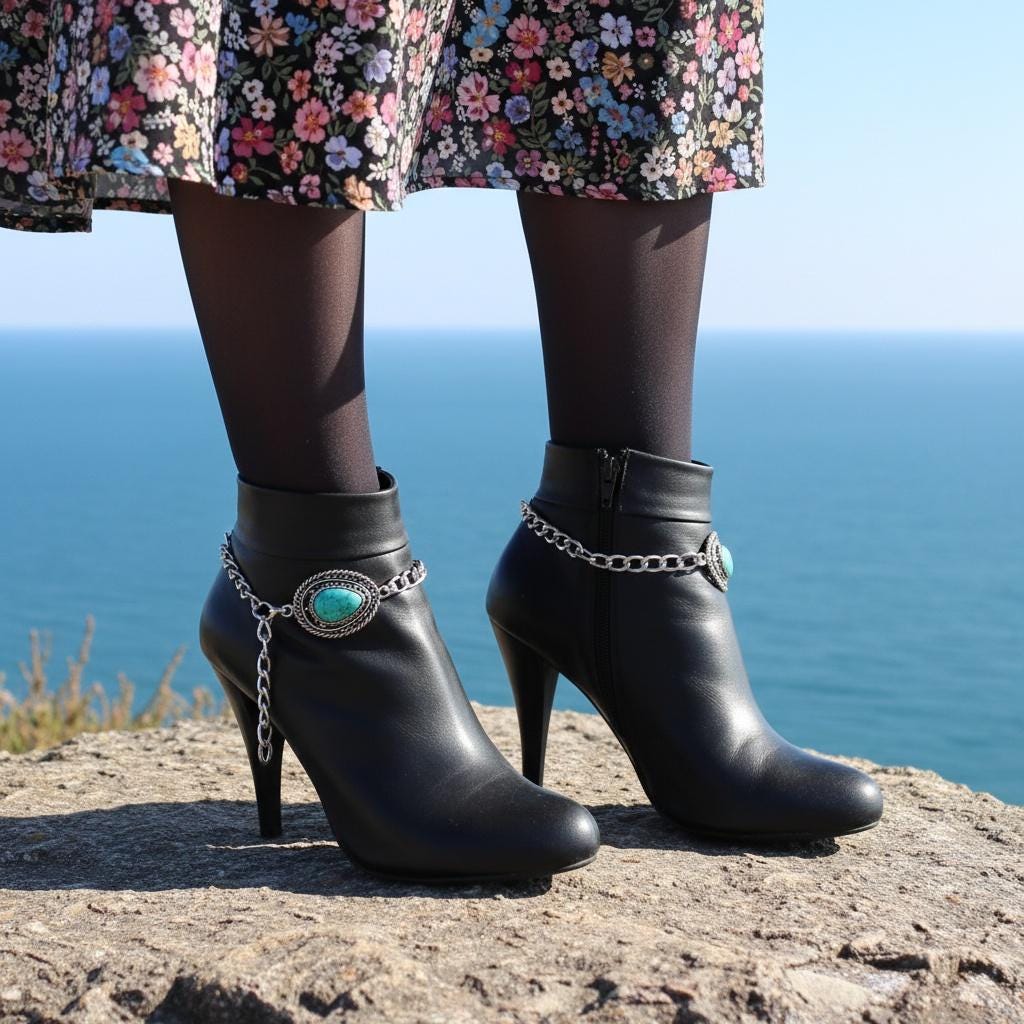 boot jewelry for women, silver boot chain anklet, cowgirl boot accessories, water drop charm boots, western fashion bling, teal charm bracelet boots, biker boot chain set, shoe charms anklet set, western boot jewelry, handmade boot charm USA, festival fashion boot anklets