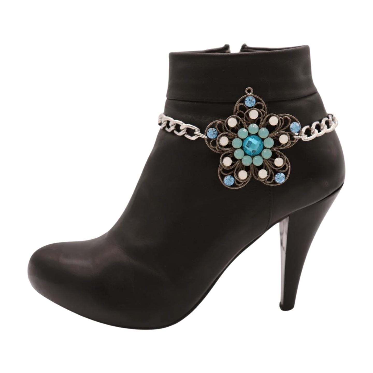 Women's Boot Chain Bracelets Set – 2PCS Silver Metal Shoe Anklet with Blue Rhinestone Flower Charm – Western Cowgirl Fashion Jewelry for Boots, Punk, Biker, Boho – Handmade in USA