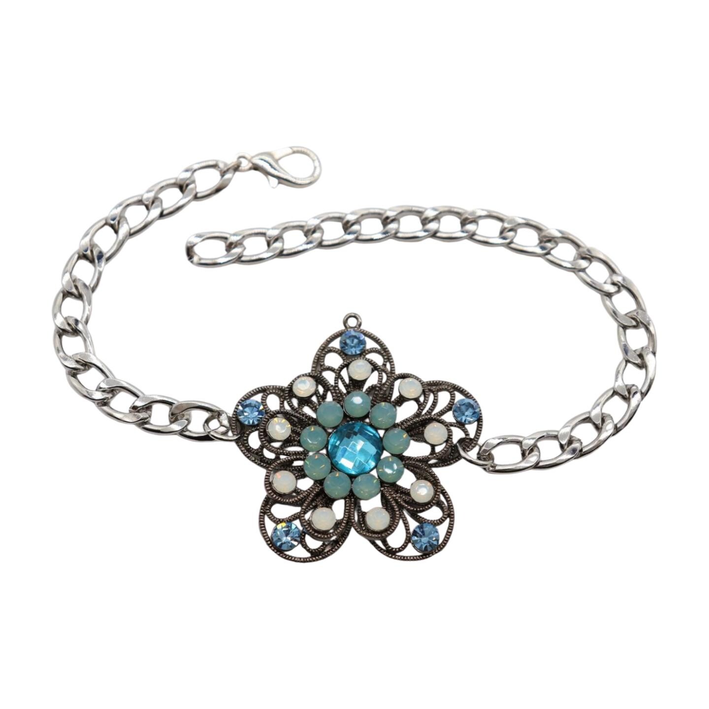 Color: Silver metal chain links and charm + silver and blue bead and rhinestones (bling flower)