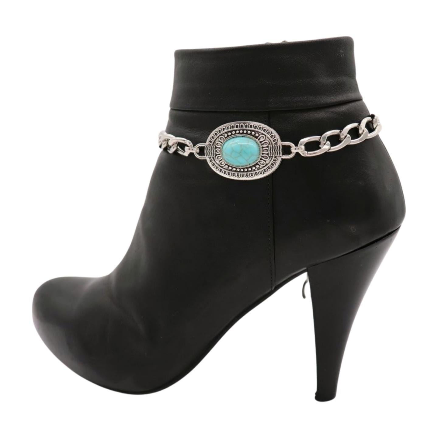 Women 2PCS Silver Metal Boot Chain Bracelet Shoe Anklet Concho Turquoise Bead Blue Charm Set Fashion Jewelry - A PAIR BC15