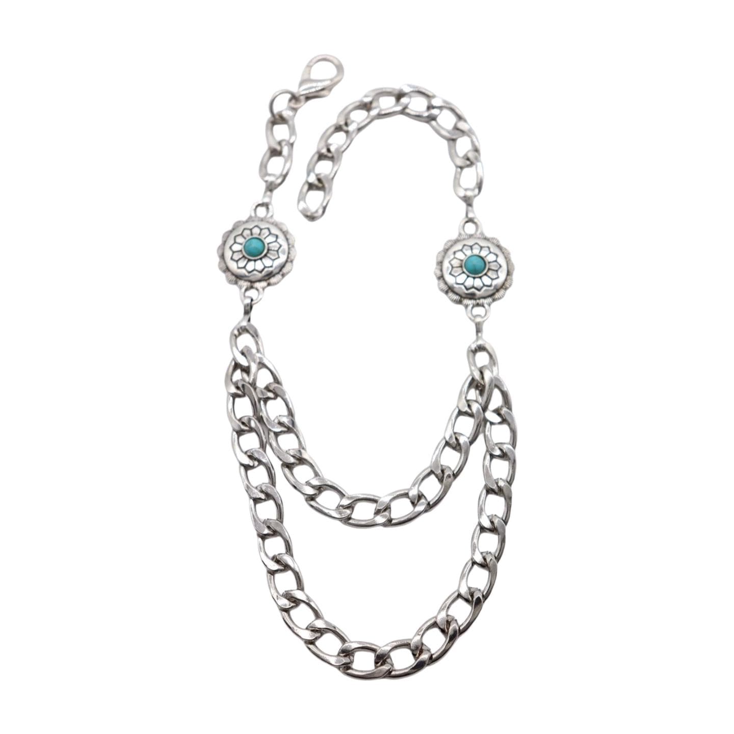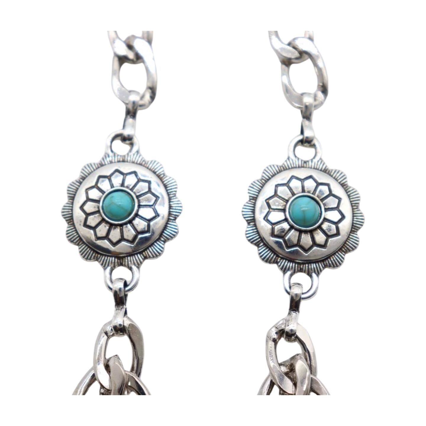 Materials: Silver-tone alloy chain; turquoise-blue beaded concho charms.